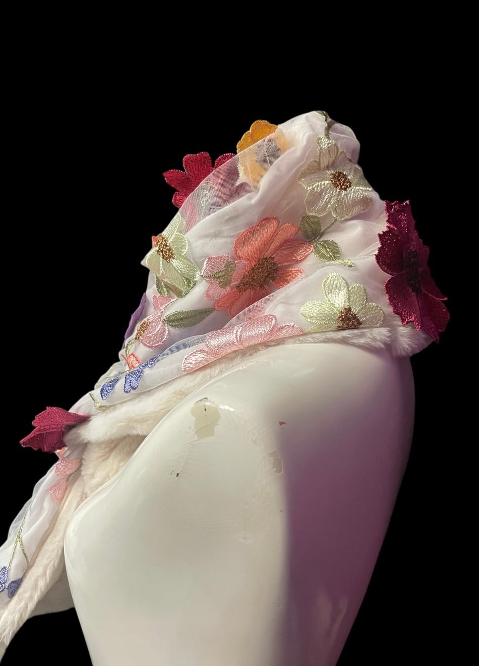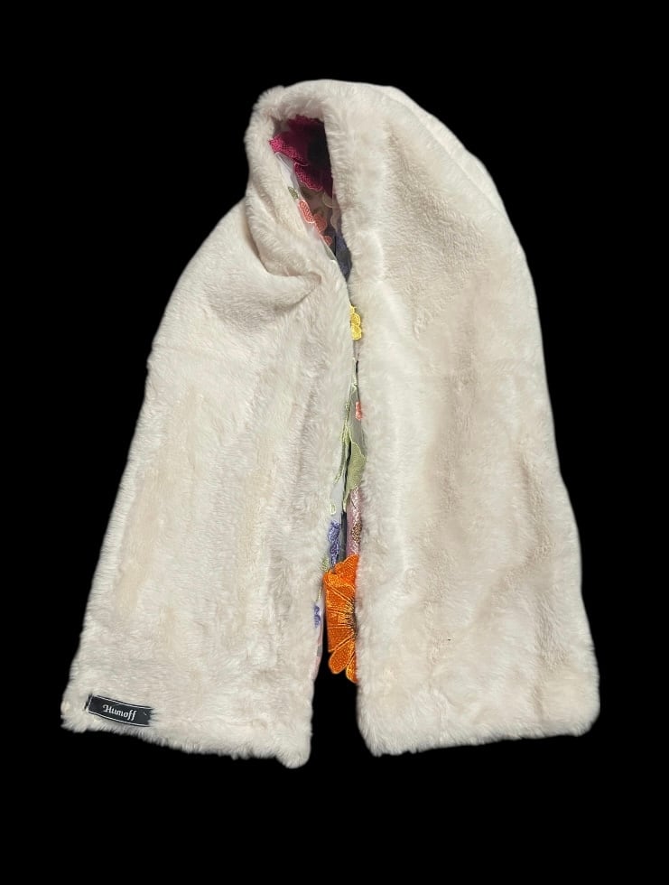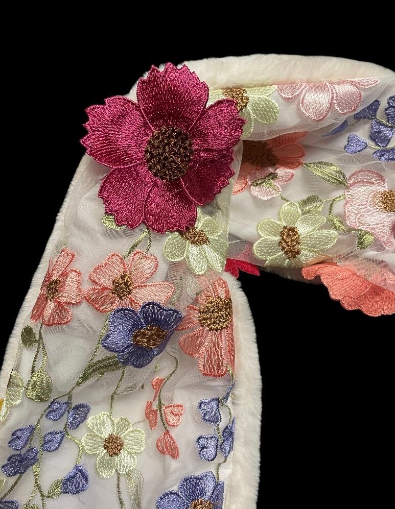 全体に花柄の刺繍が施された、華やかな印象のショートマフラーです。