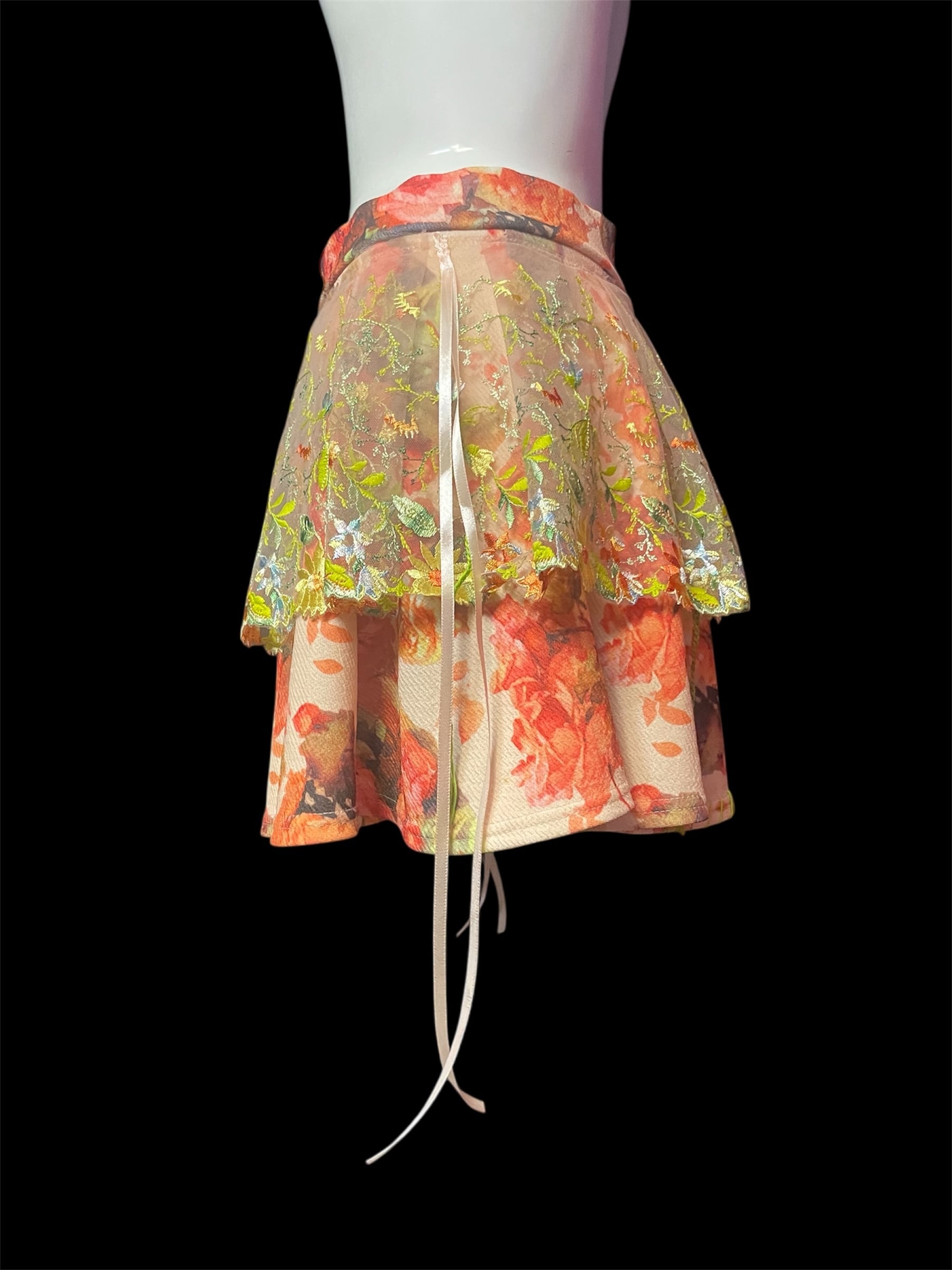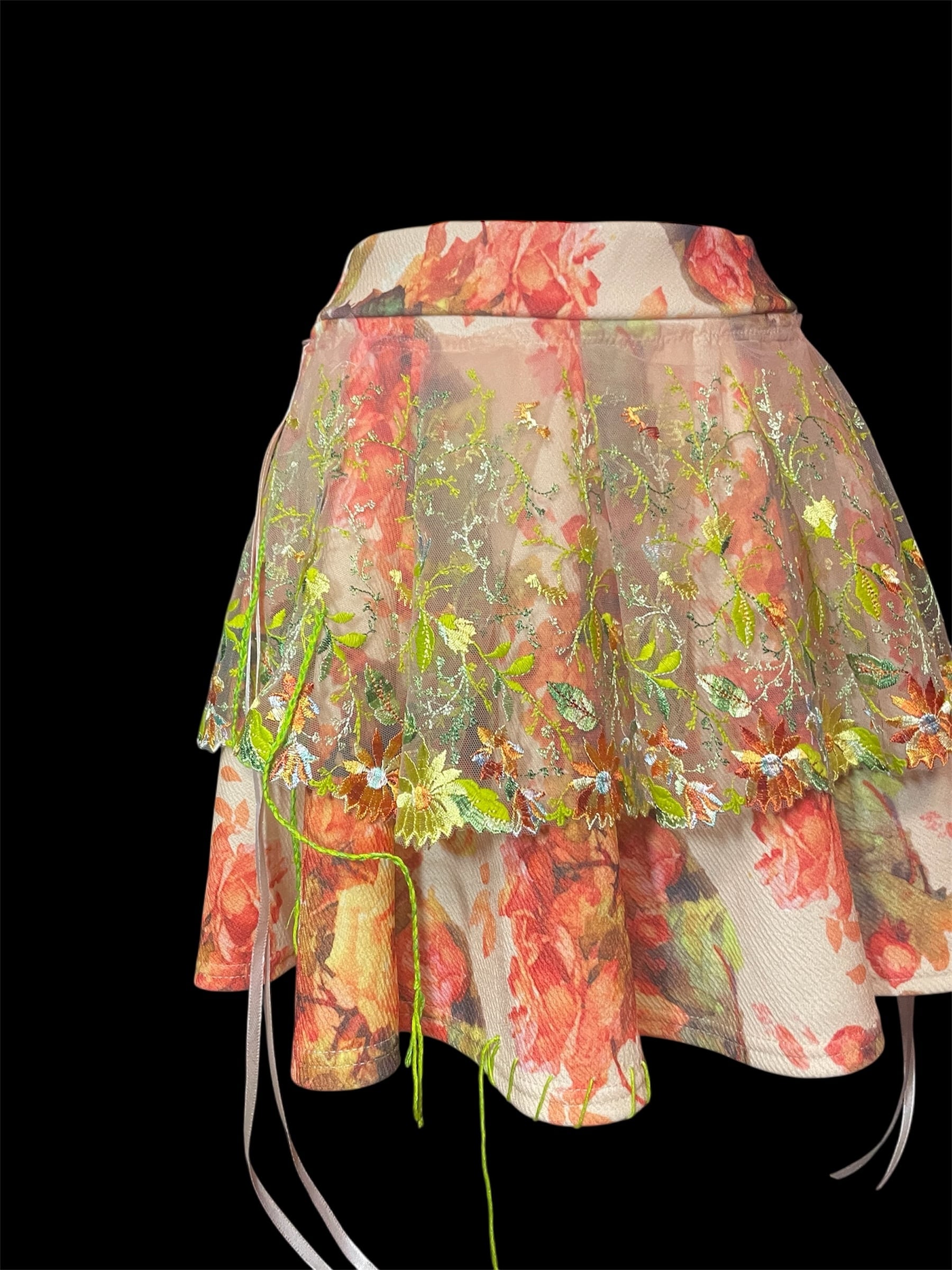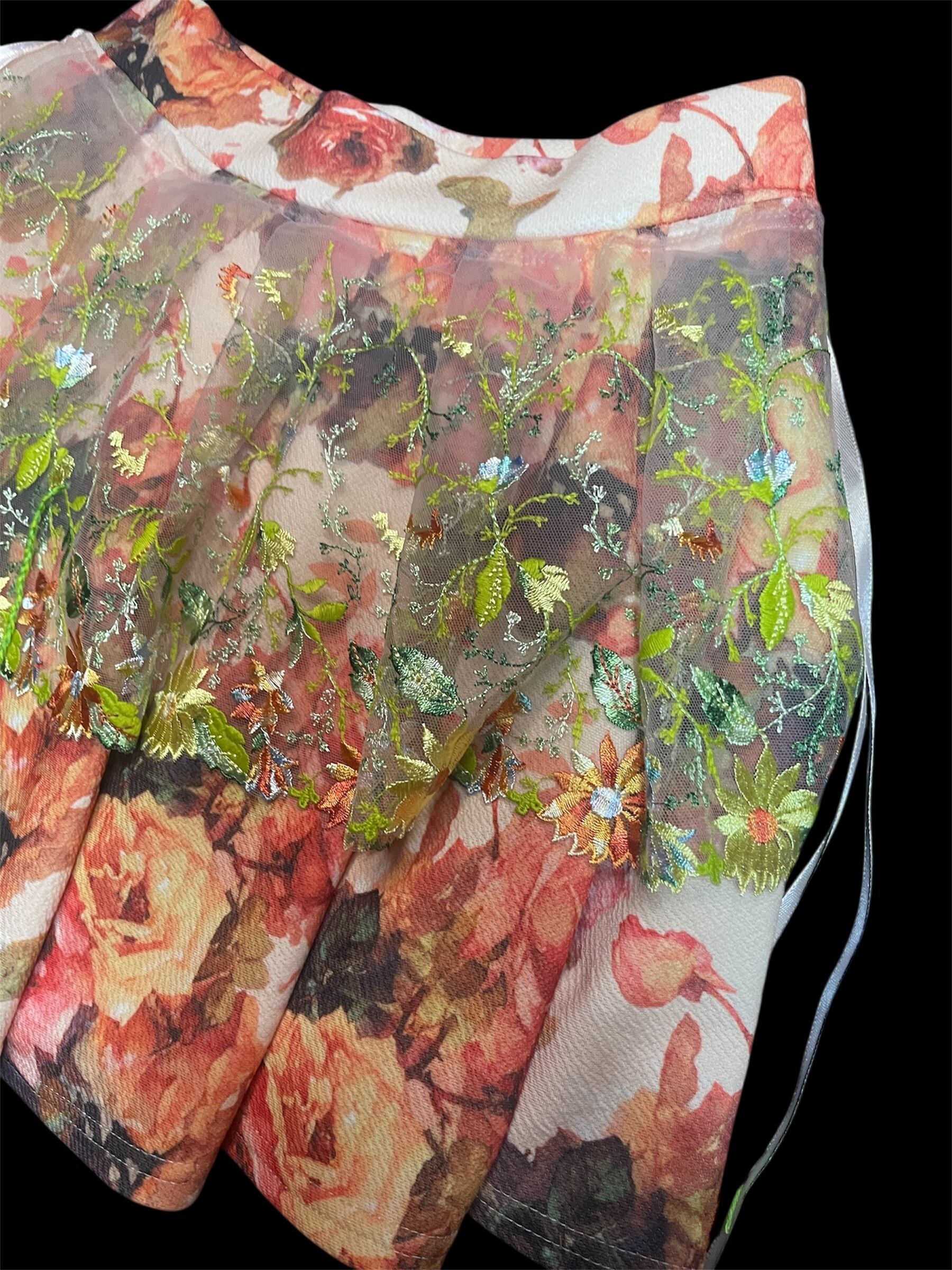 花柄プリント生地の上に、透け感のあるレースを重ねたスカートです。