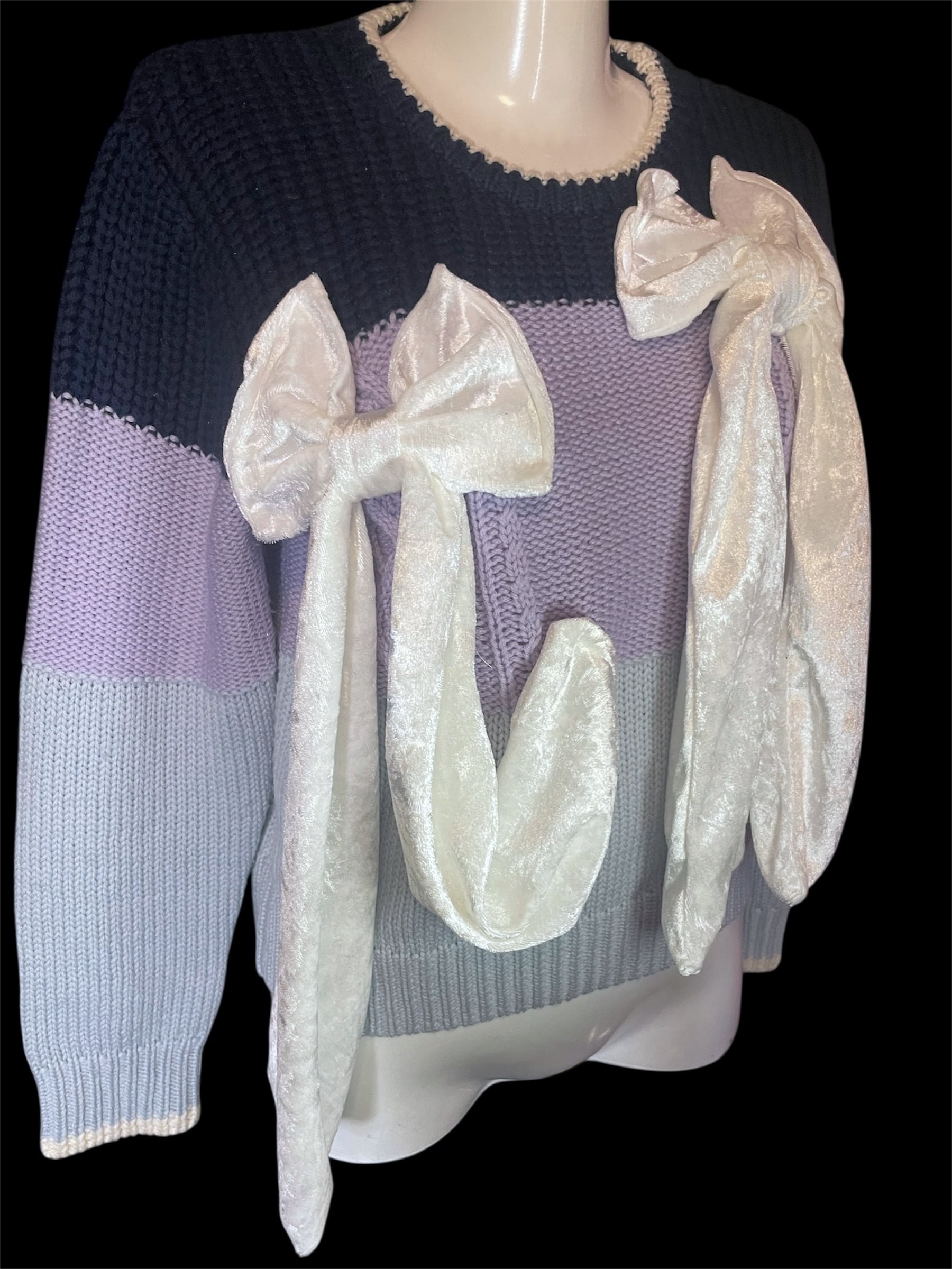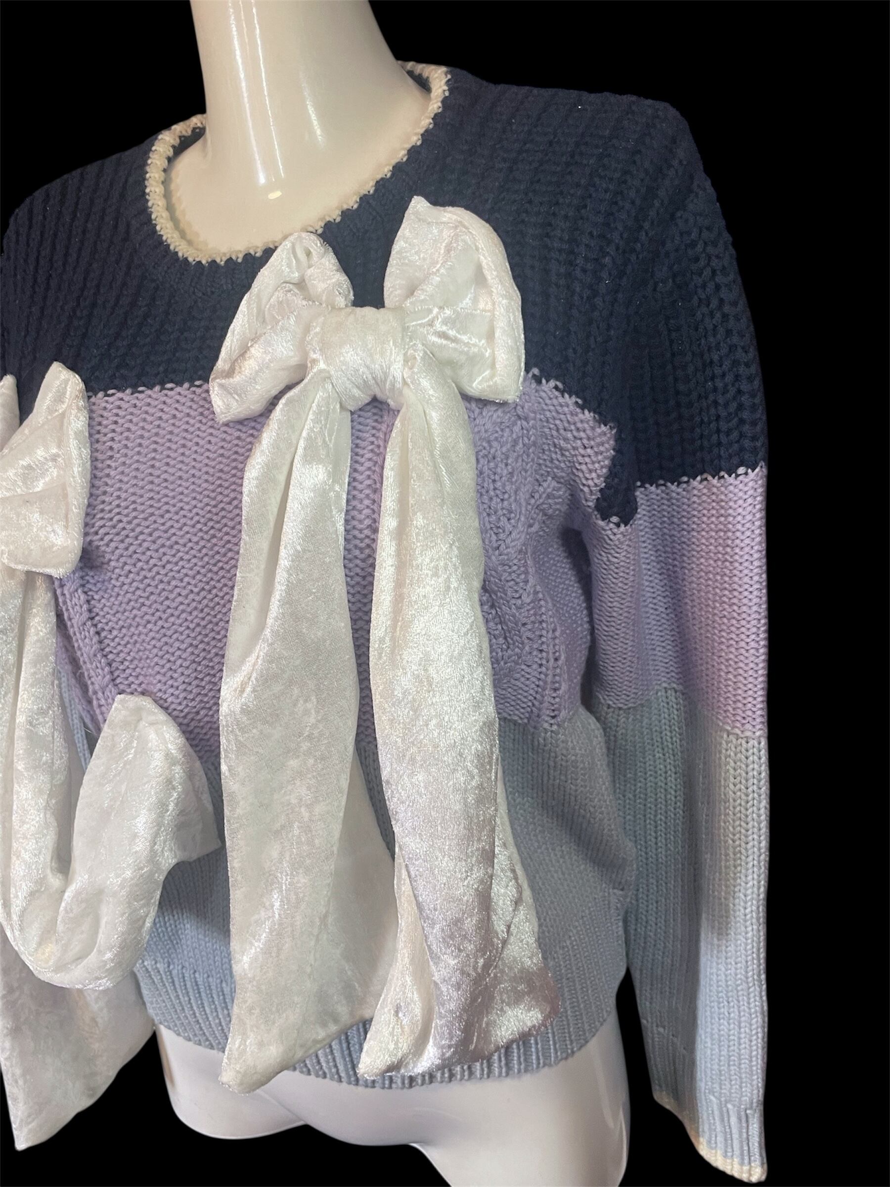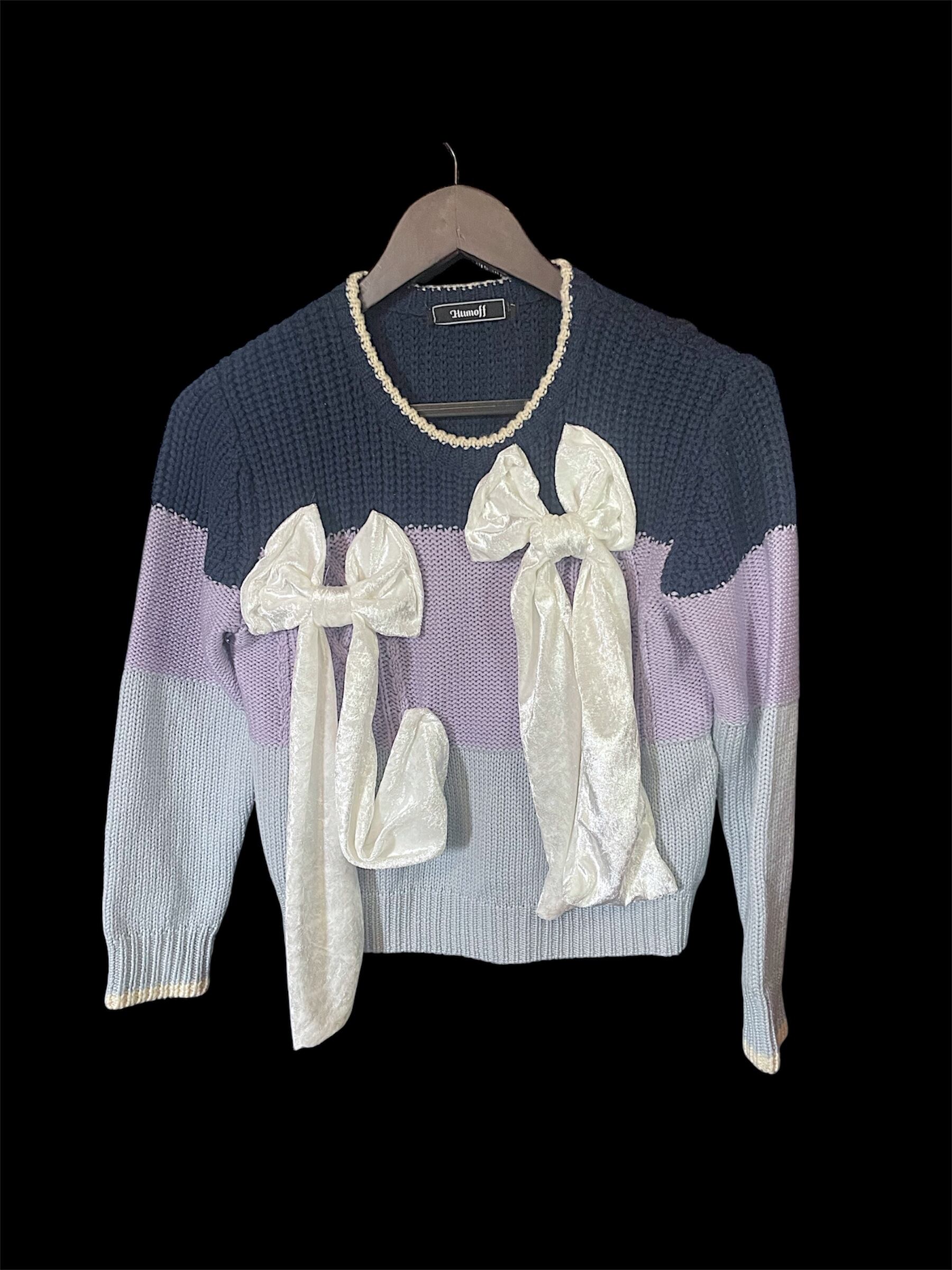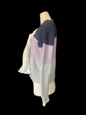 ネイビーから淡いパープルへ切り替わる配色のニットトップス。