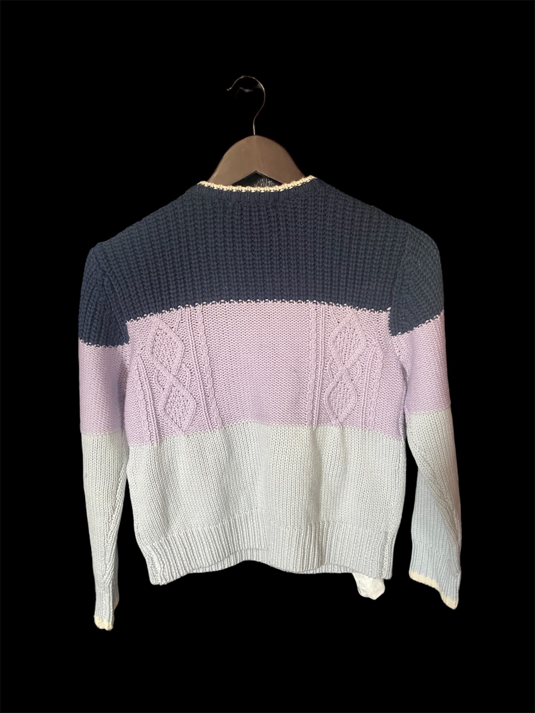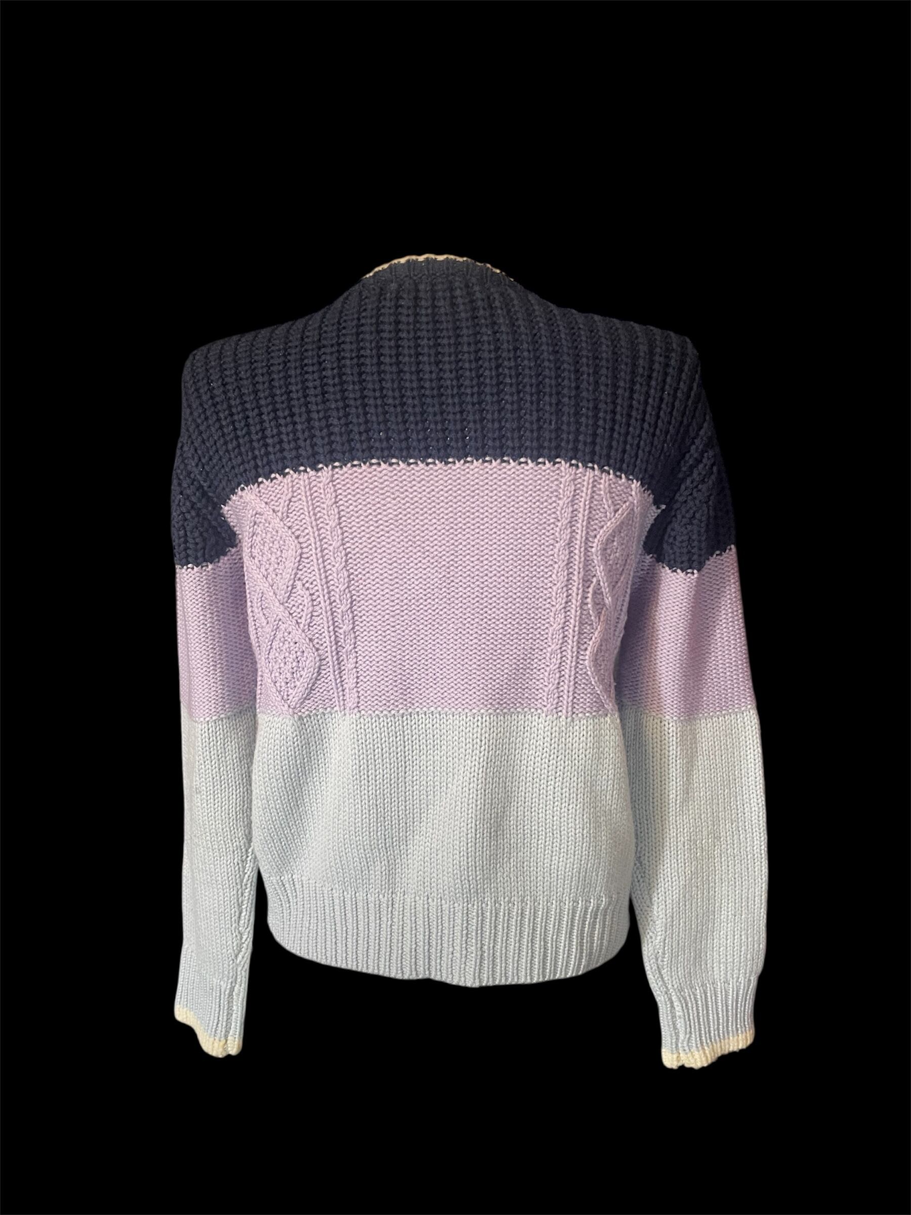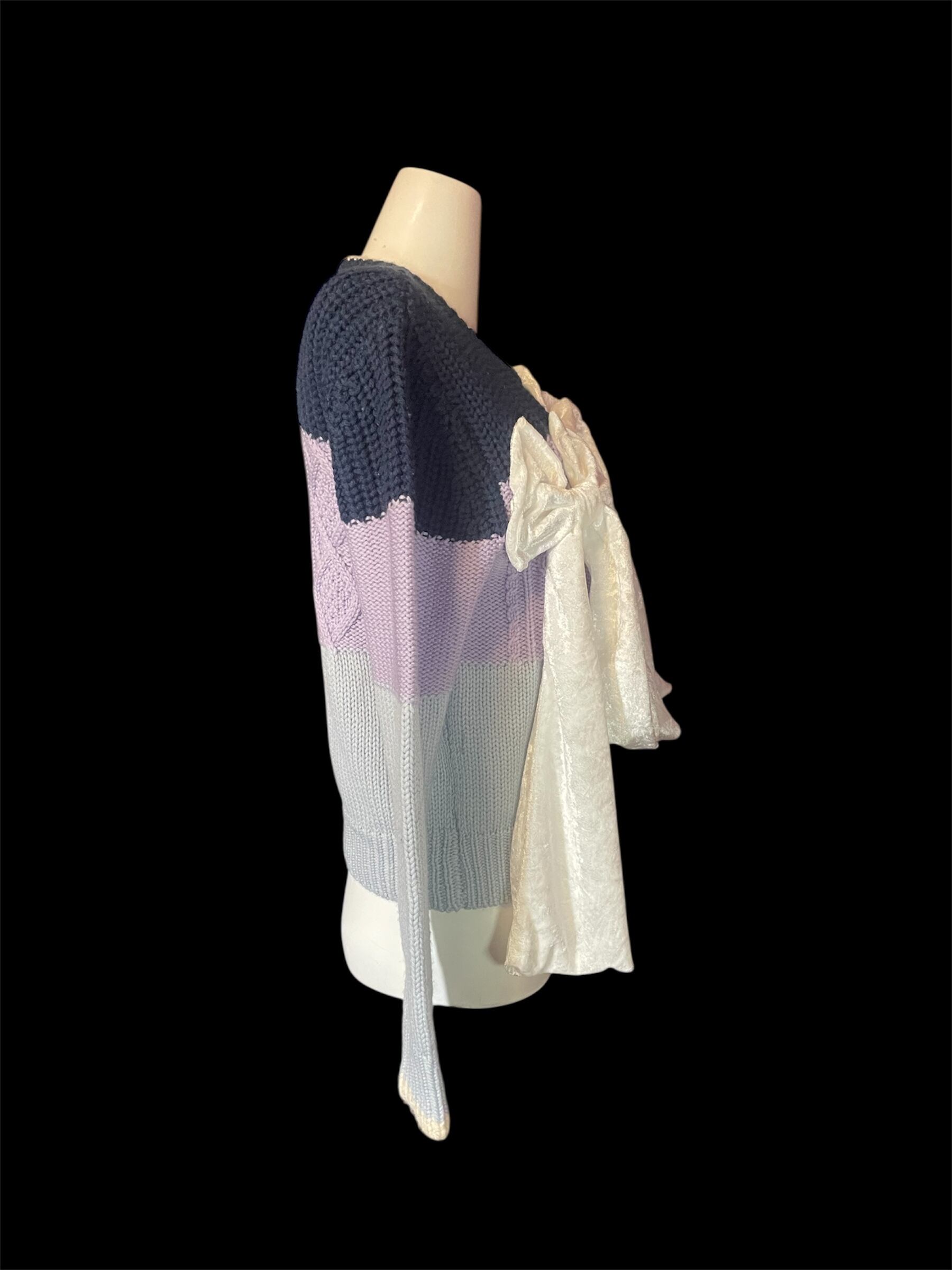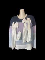 ネイビーから淡いパープルへ切り替わる配色のニットトップス。