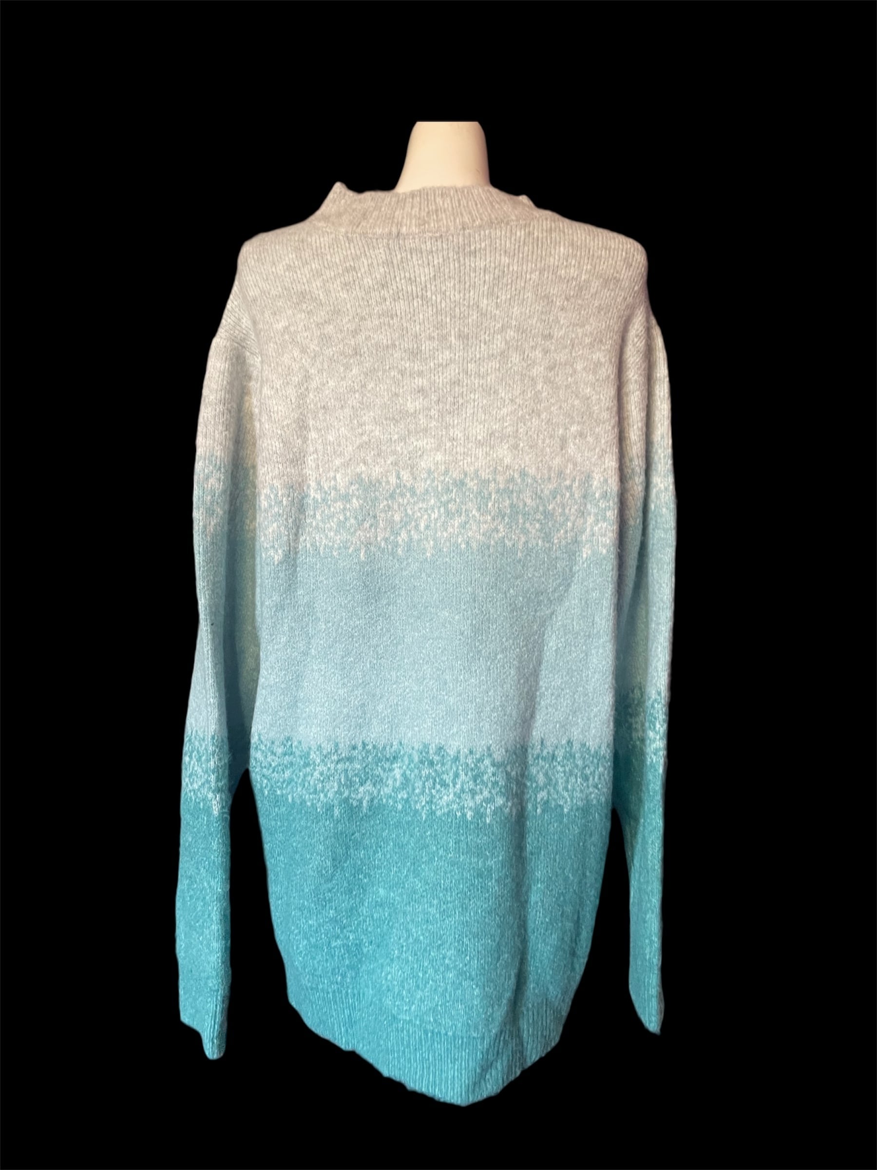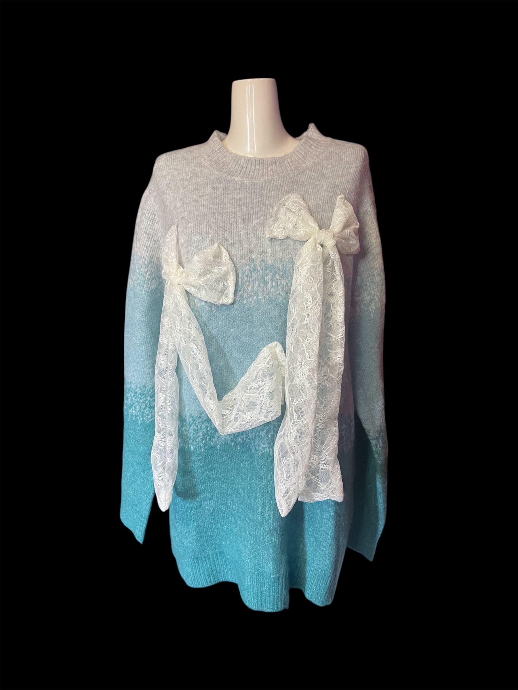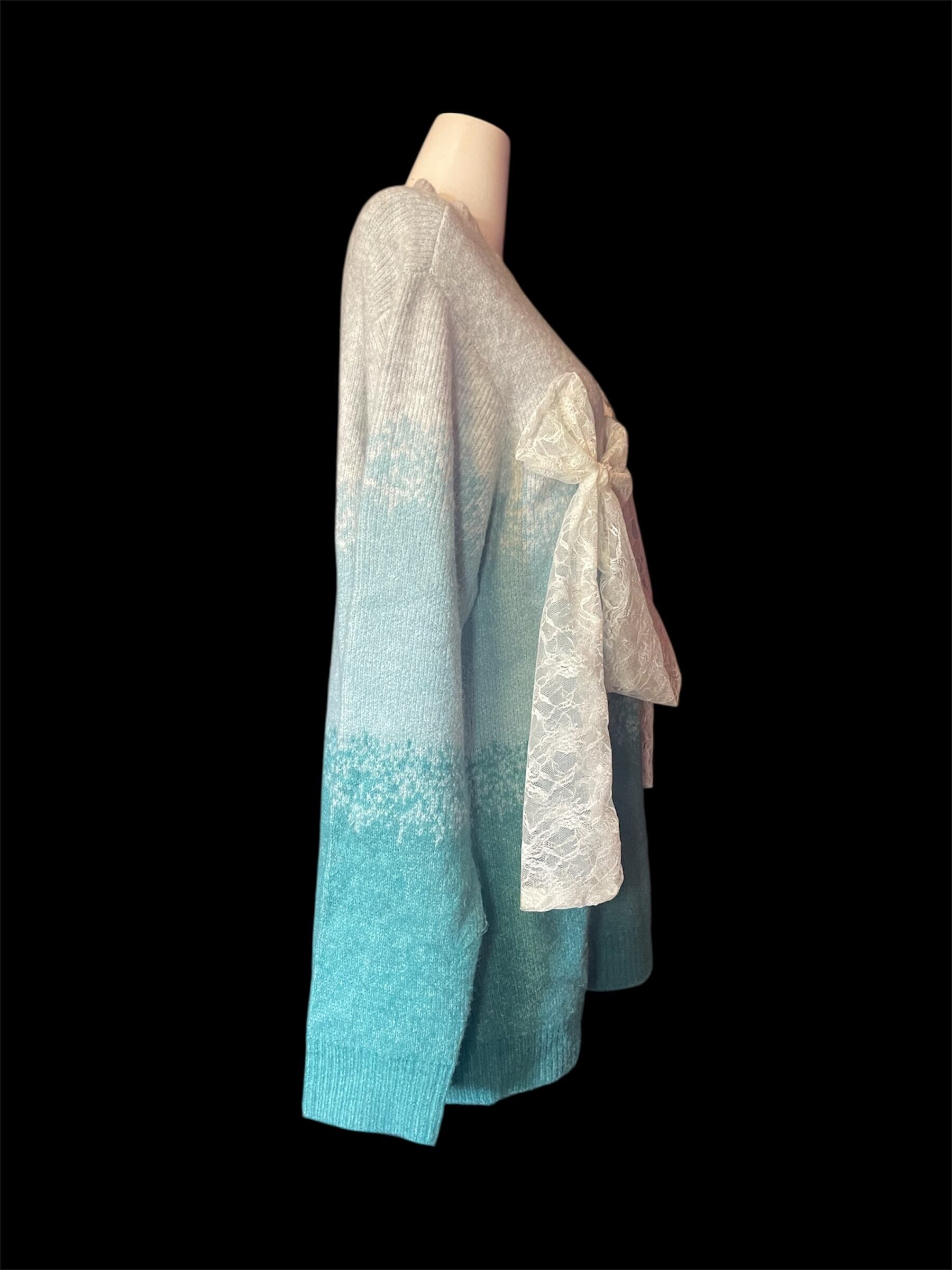 ライトグレーからブルーグリーンへグラデーションするニット。