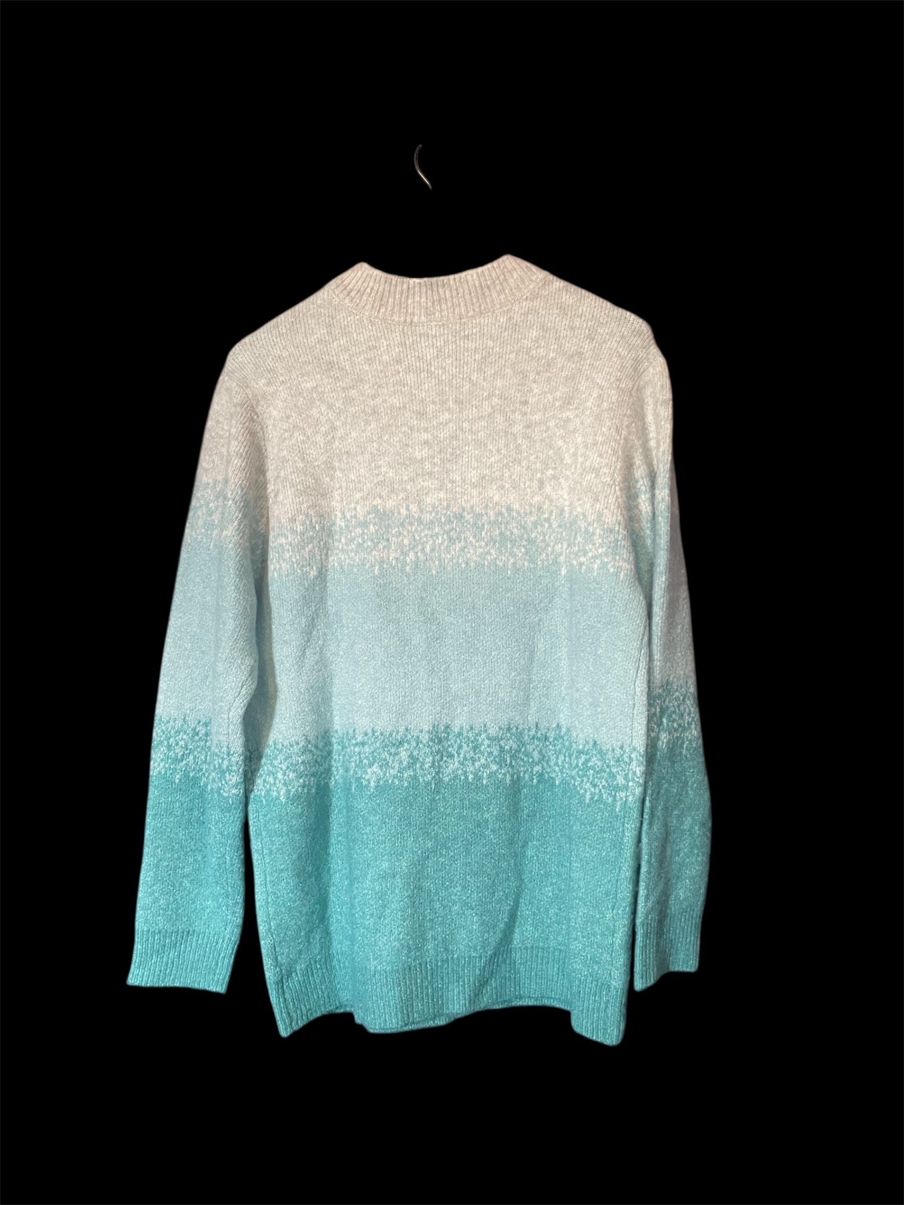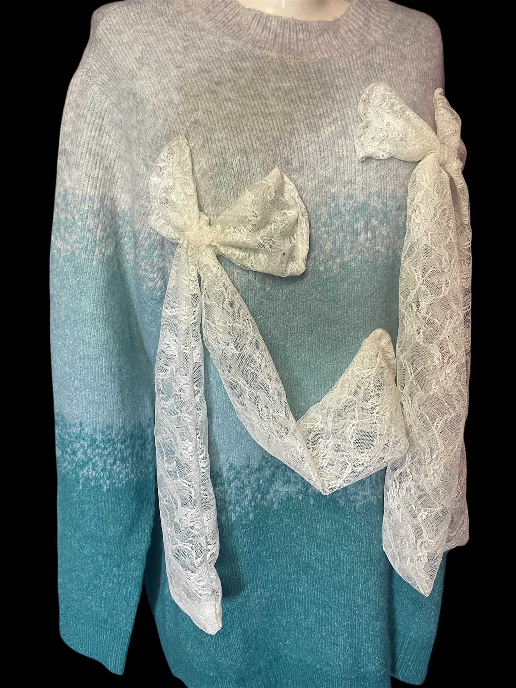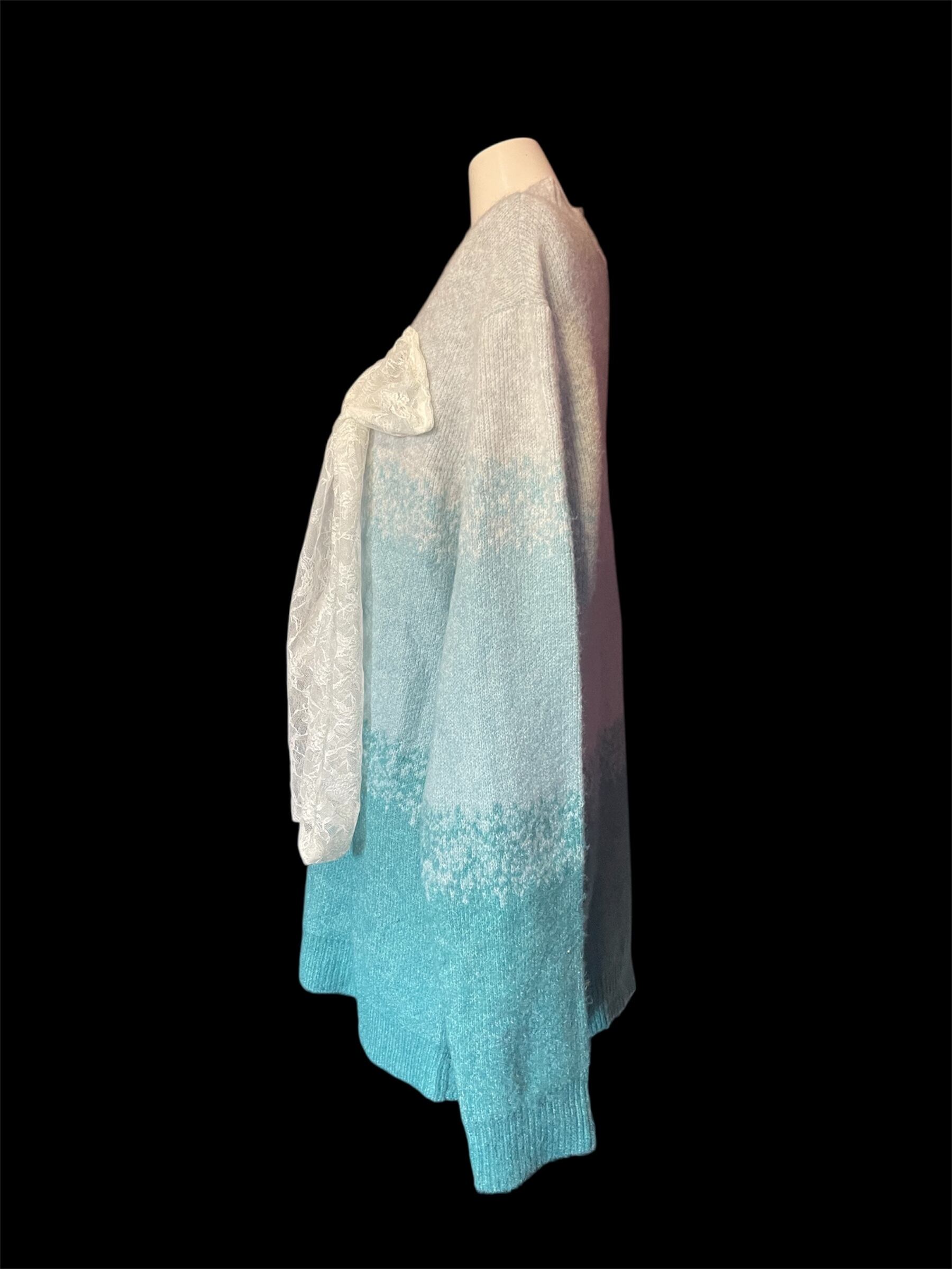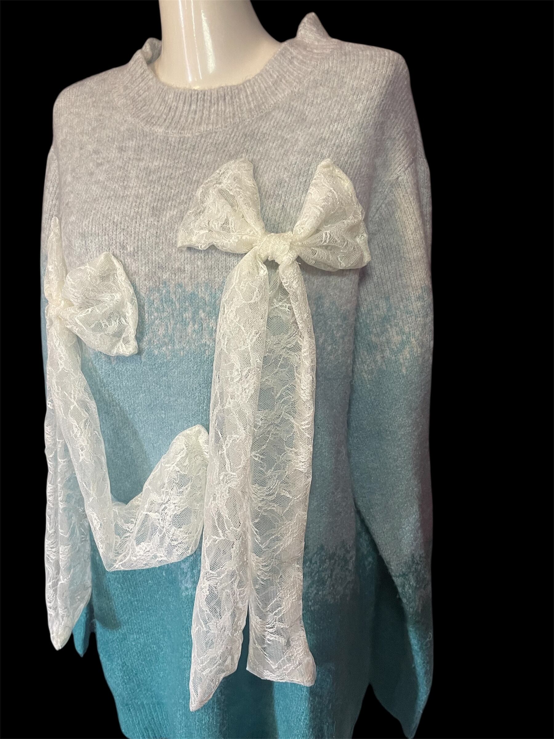 ライトグレーからブルーグリーンへグラデーションするニット。