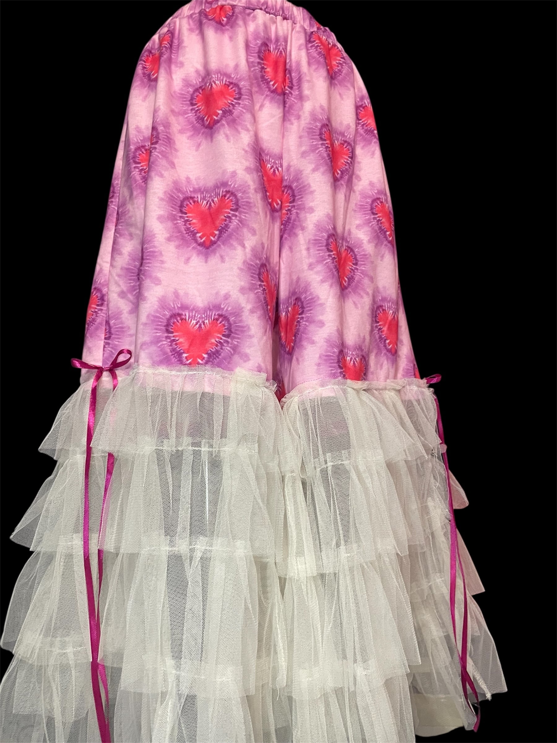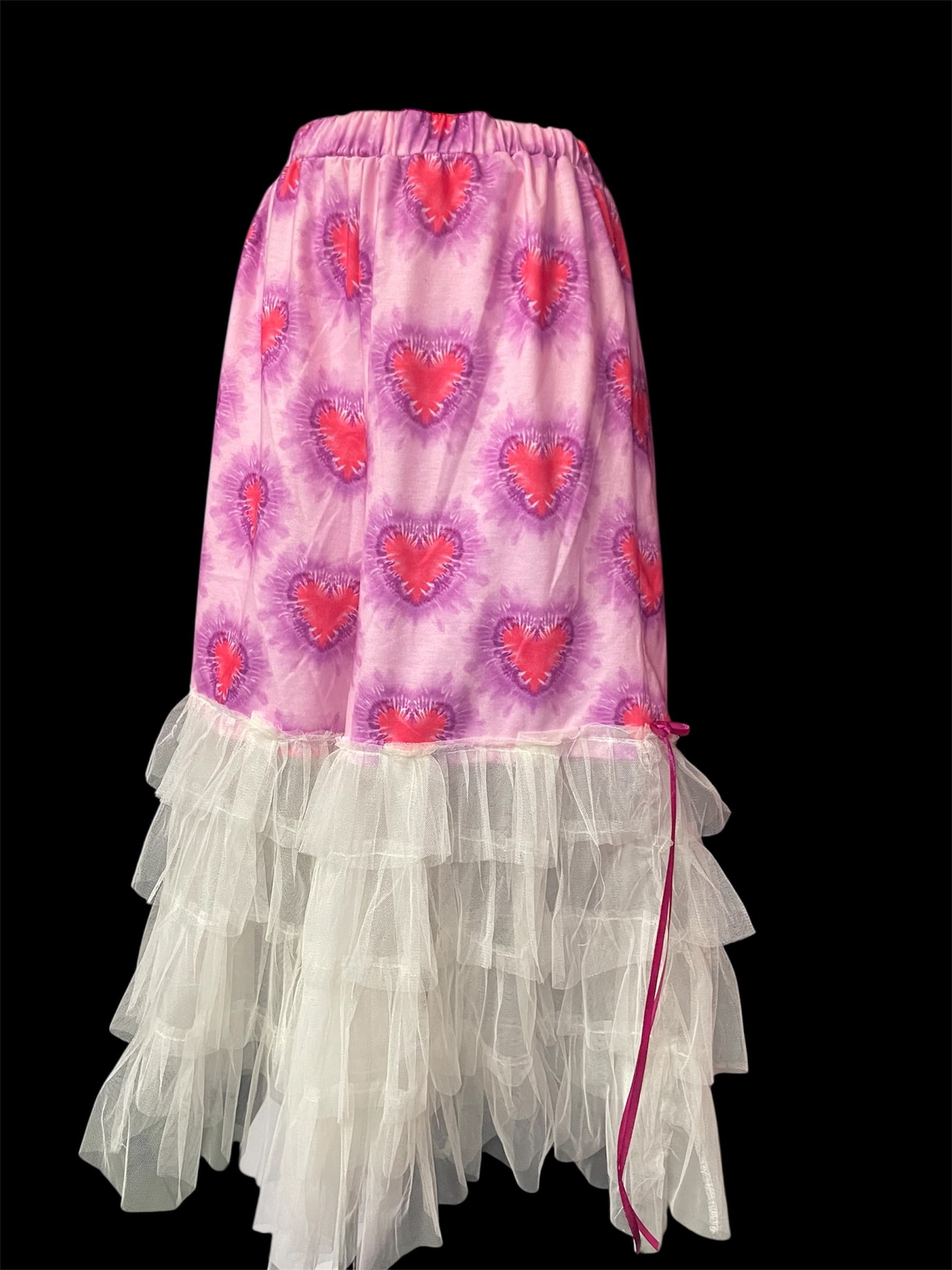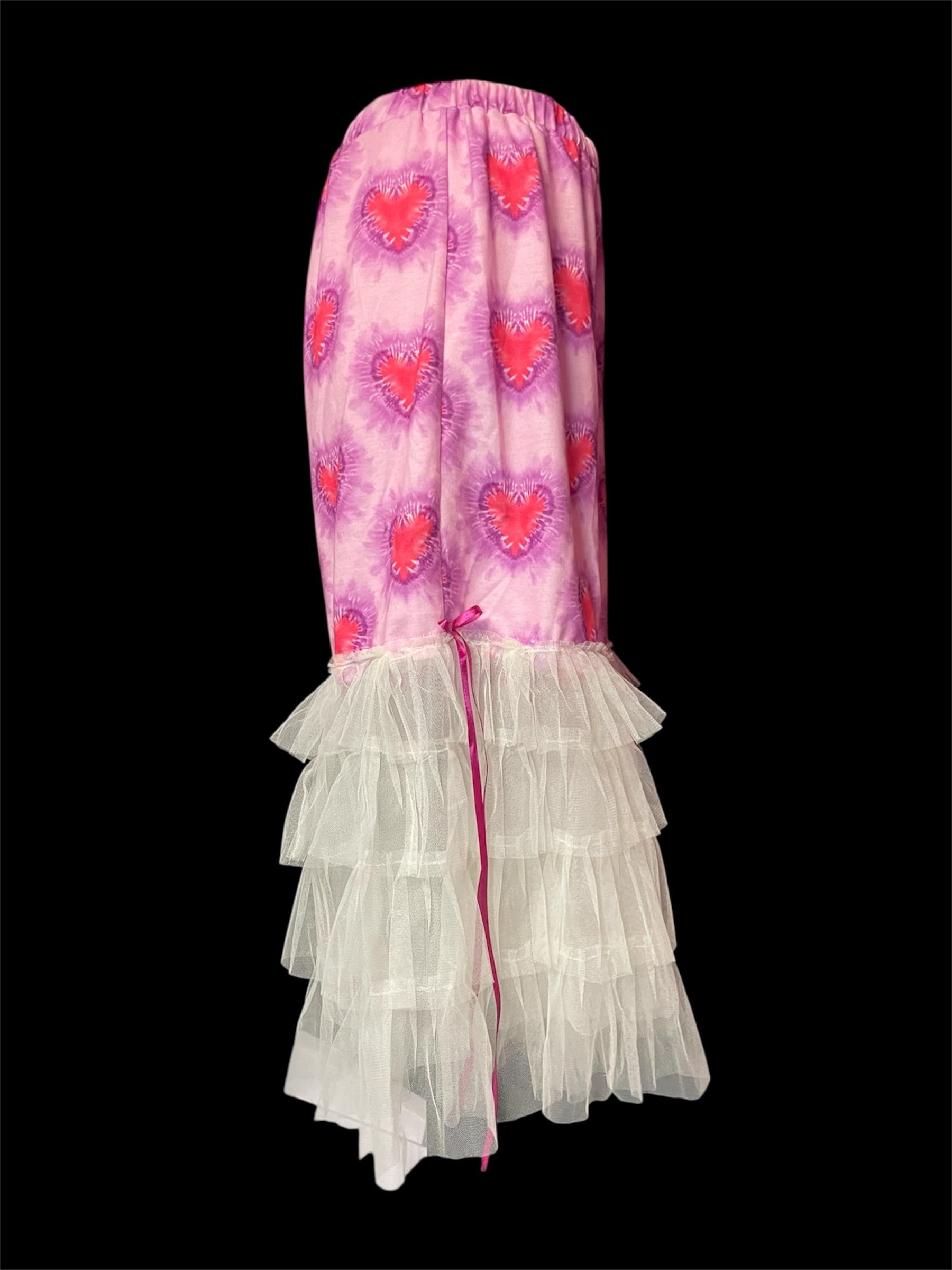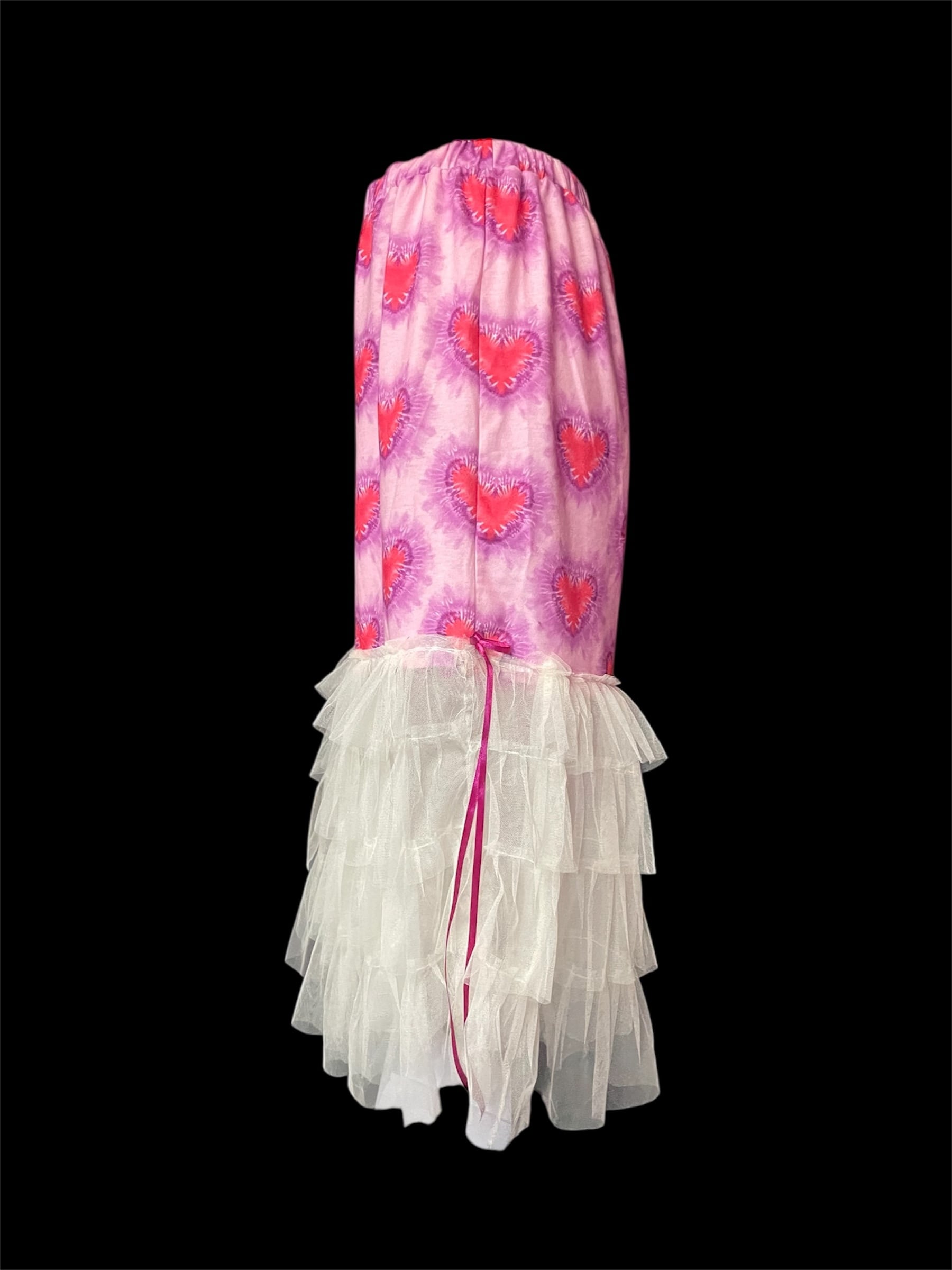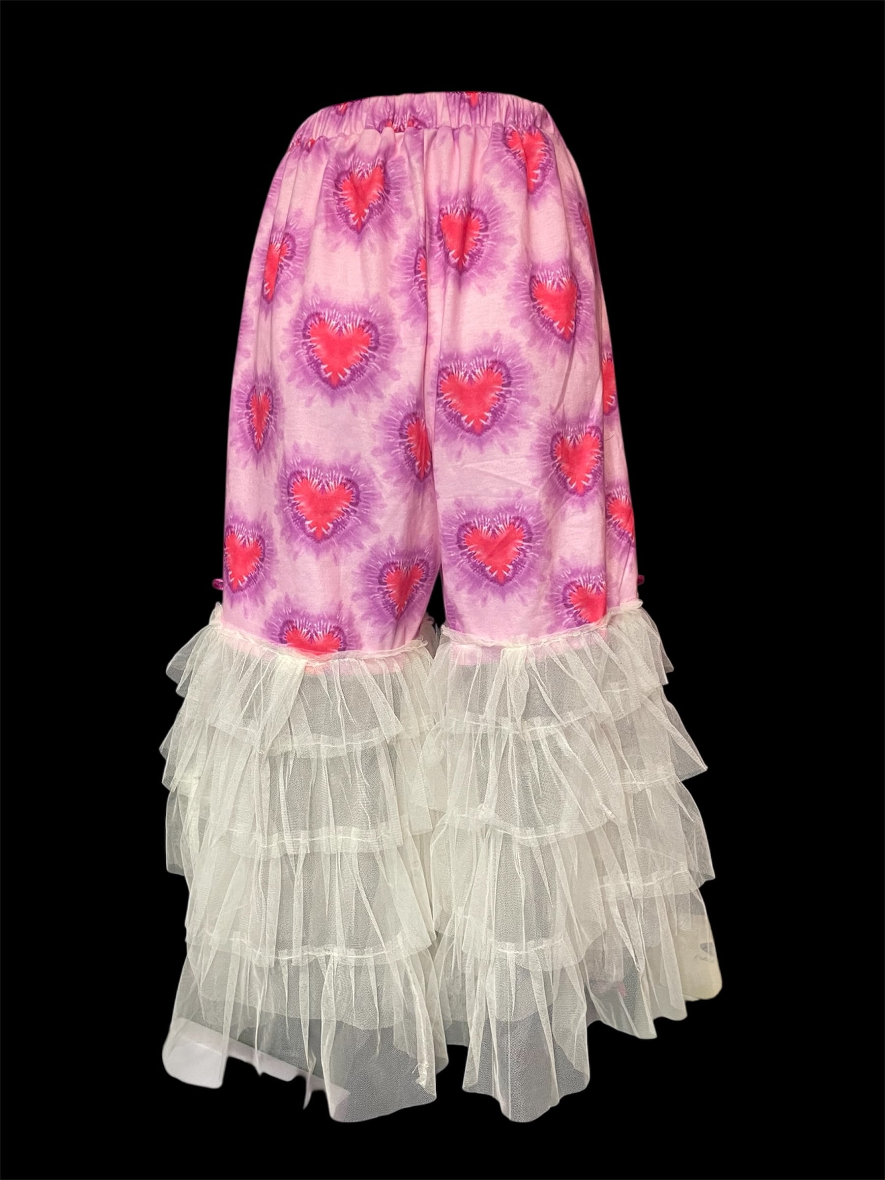 ハート柄のズボンに、軽やかなチュールをレイヤードしたリメイクパンツ。