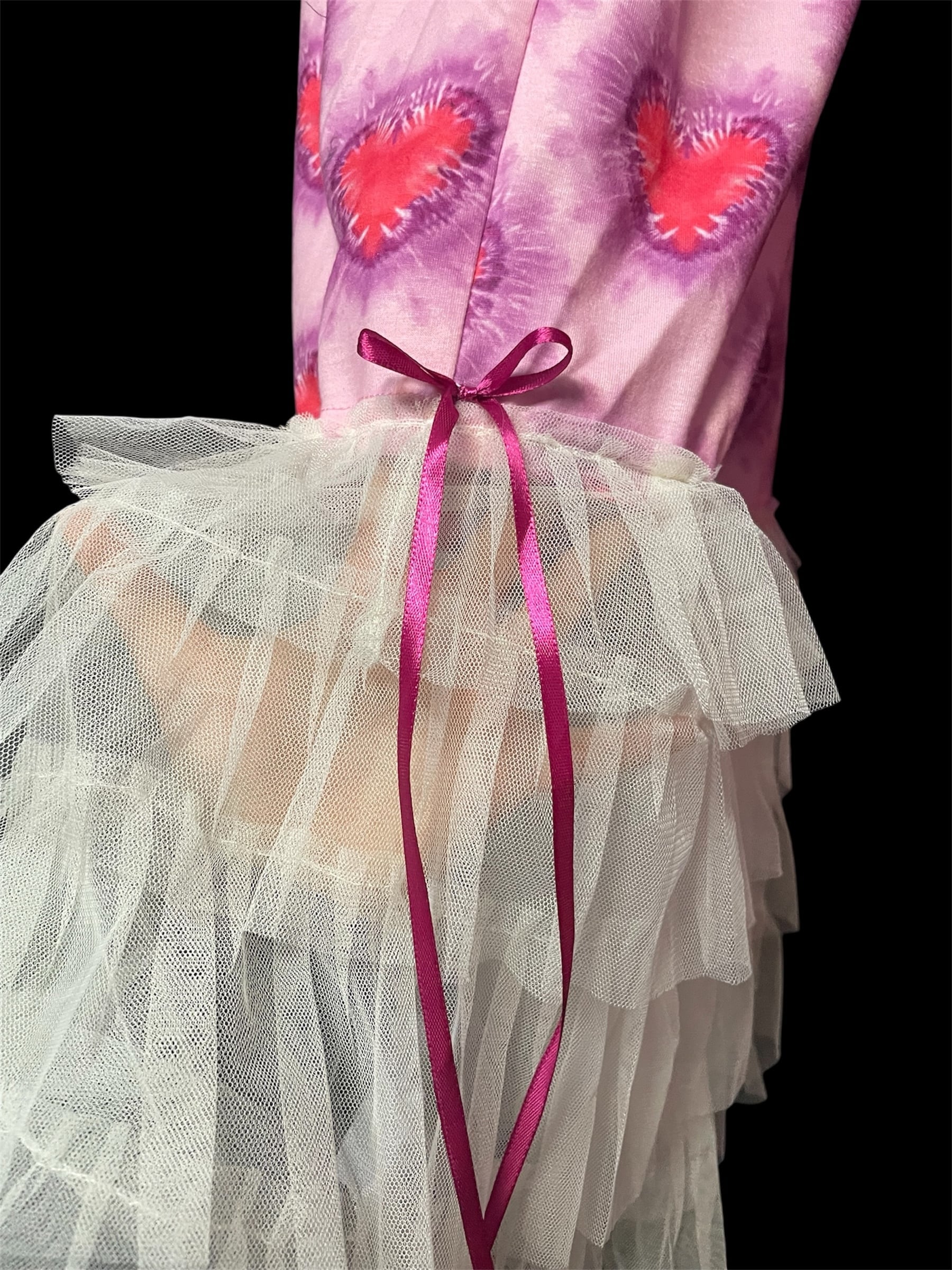 甘さのあるモチーフに対して、裾のボリュームと透け感が違和感を生み出します。