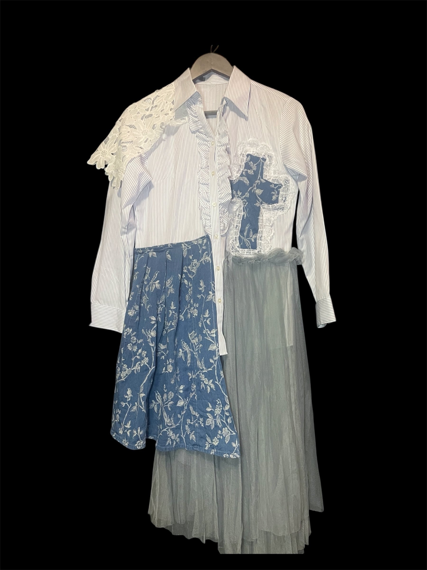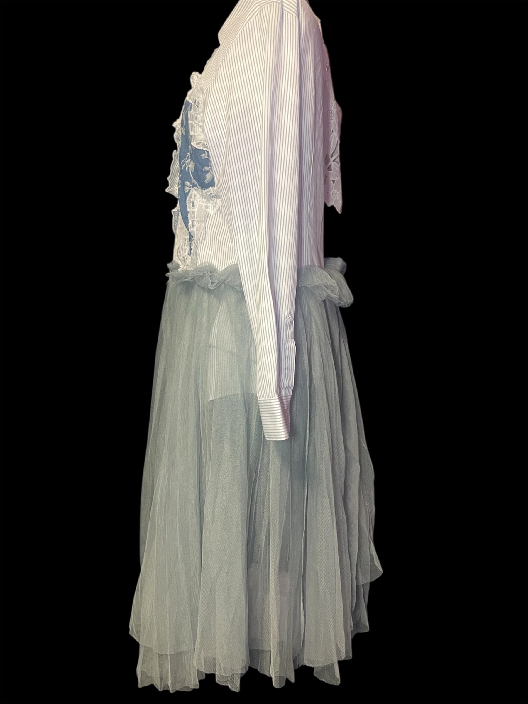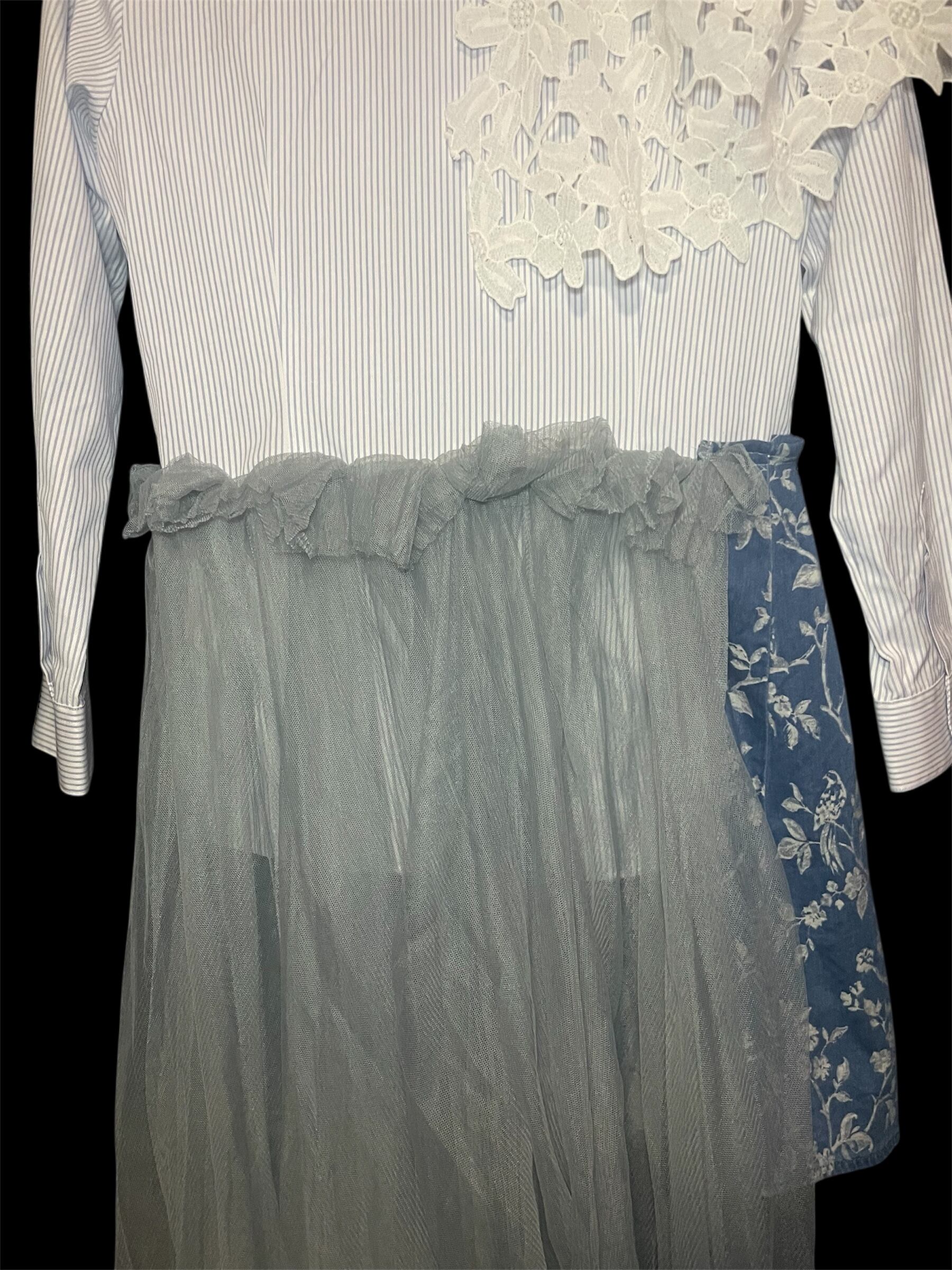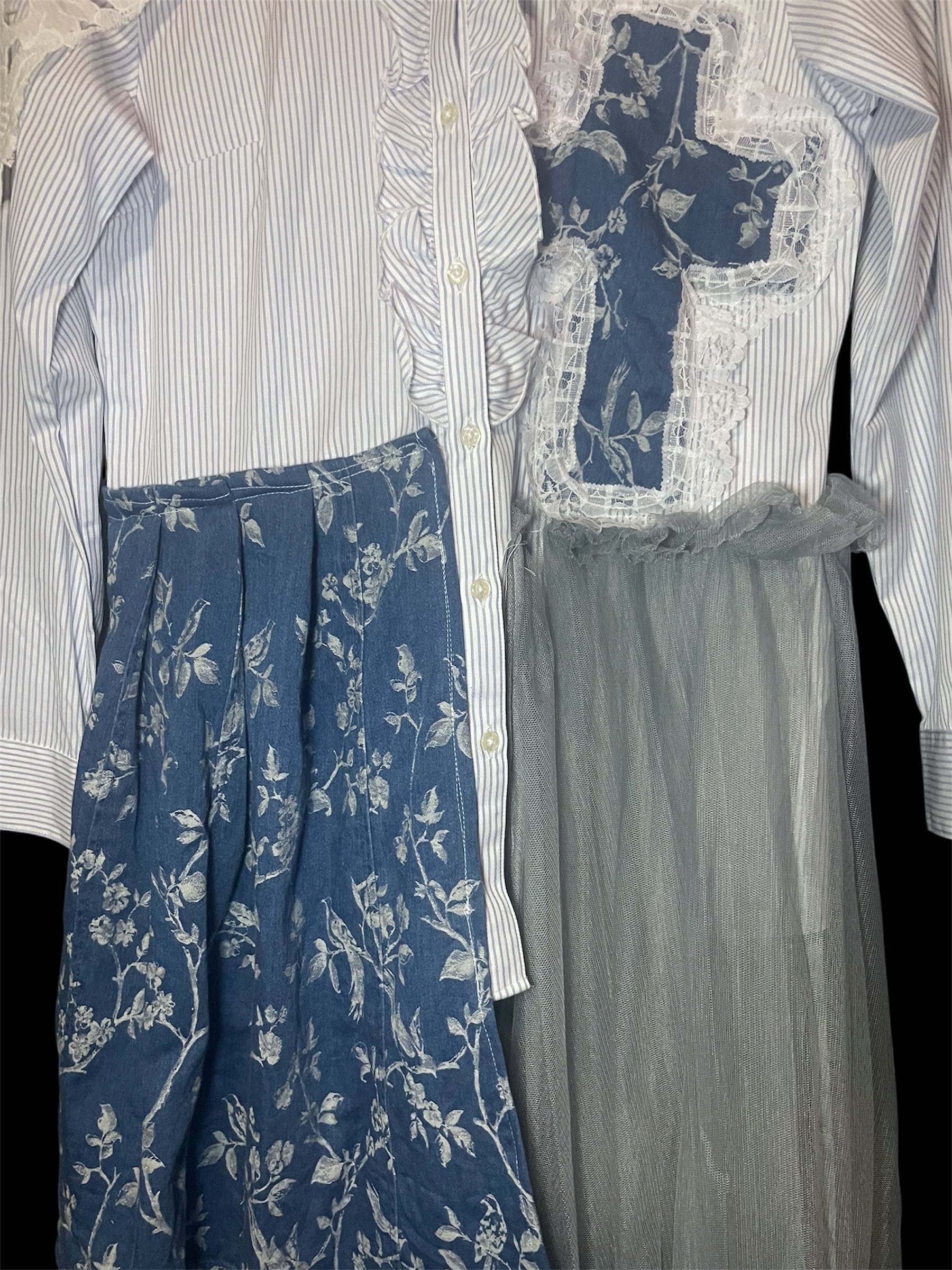 ストライプシャツをベースに、レース・チュール・柄生地を組み合わせました