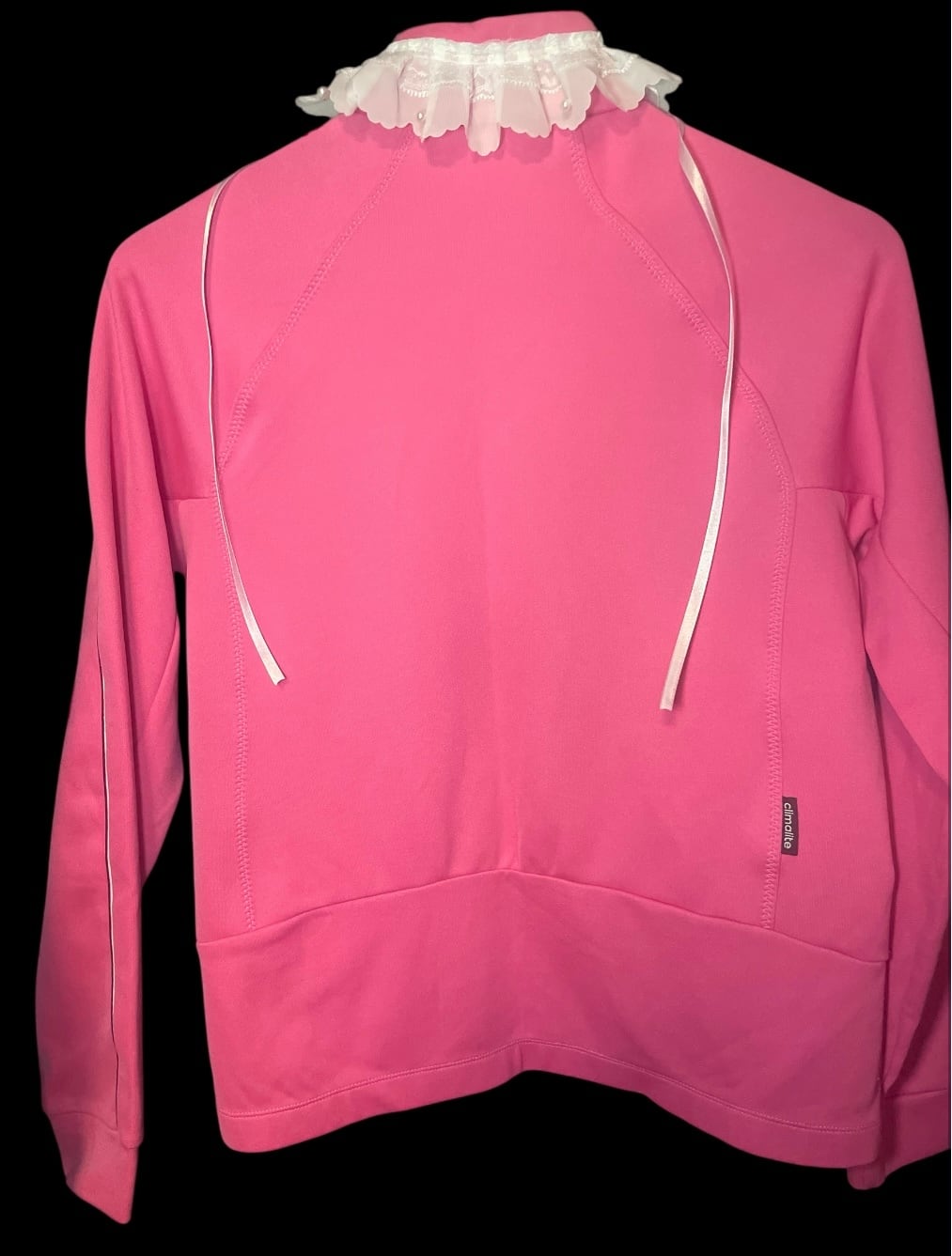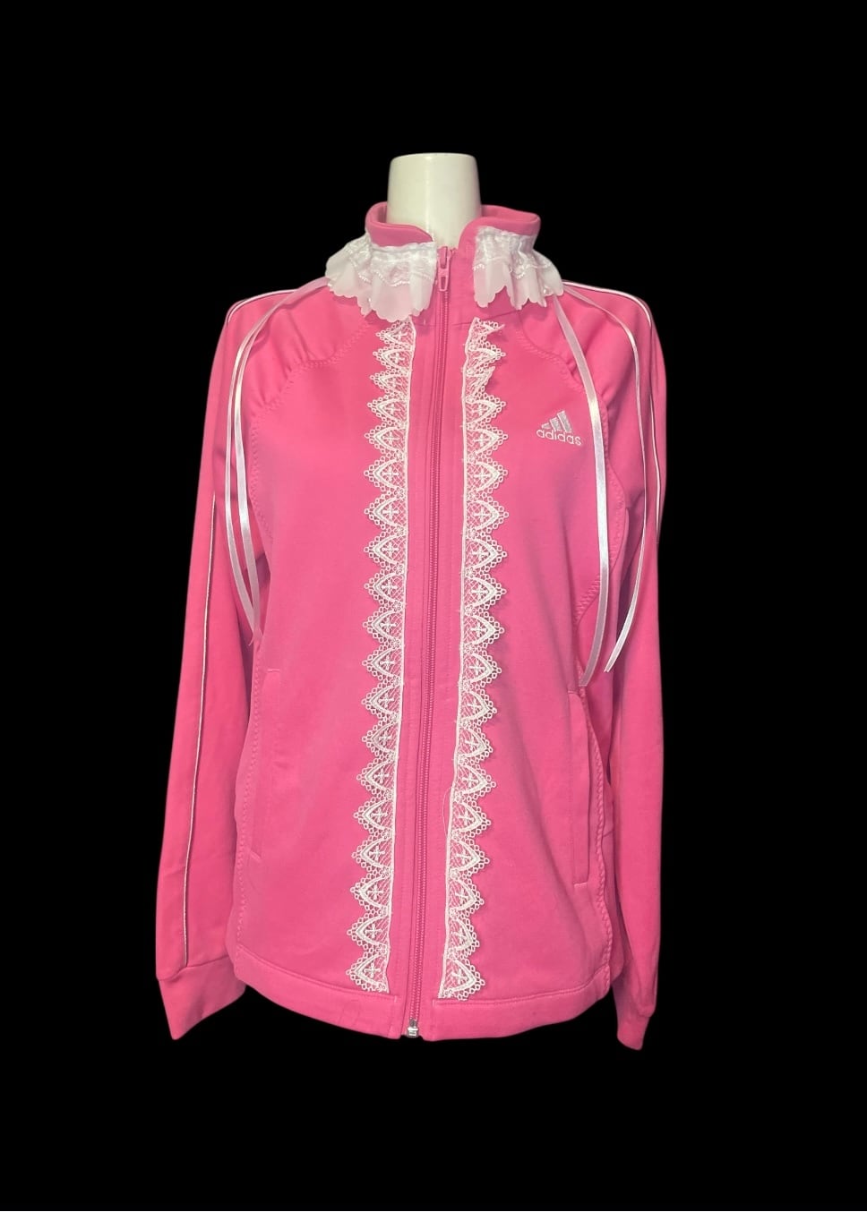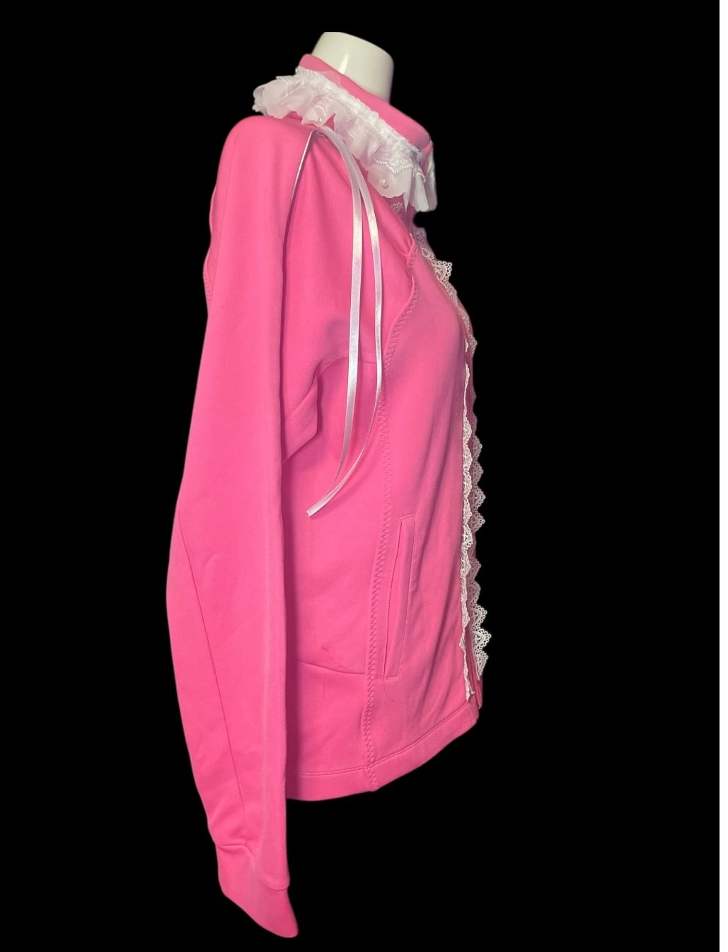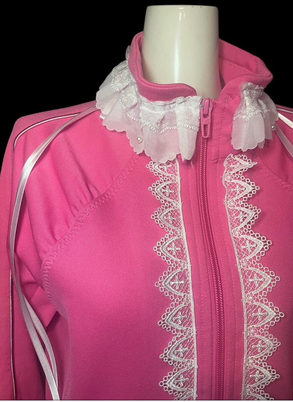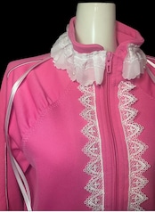 ジャージをベースに、フロントと襟元へレースを加えたリメイクトップス。