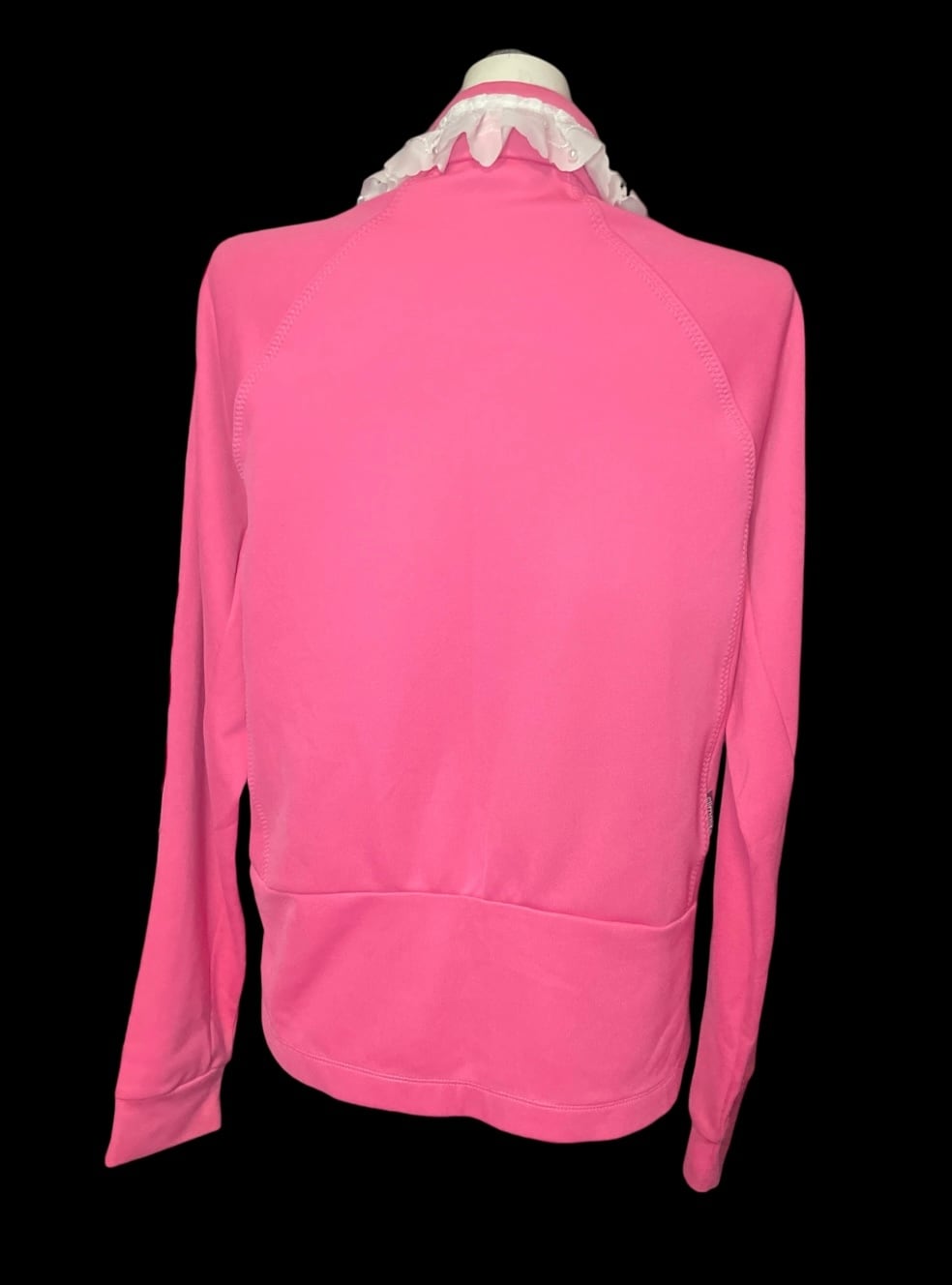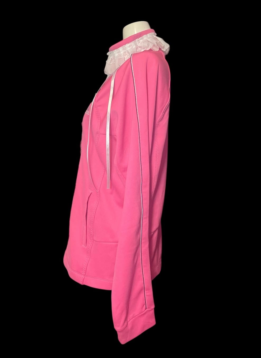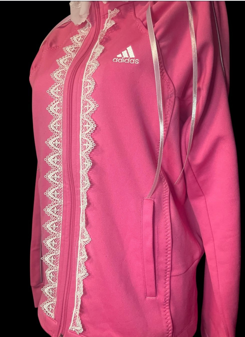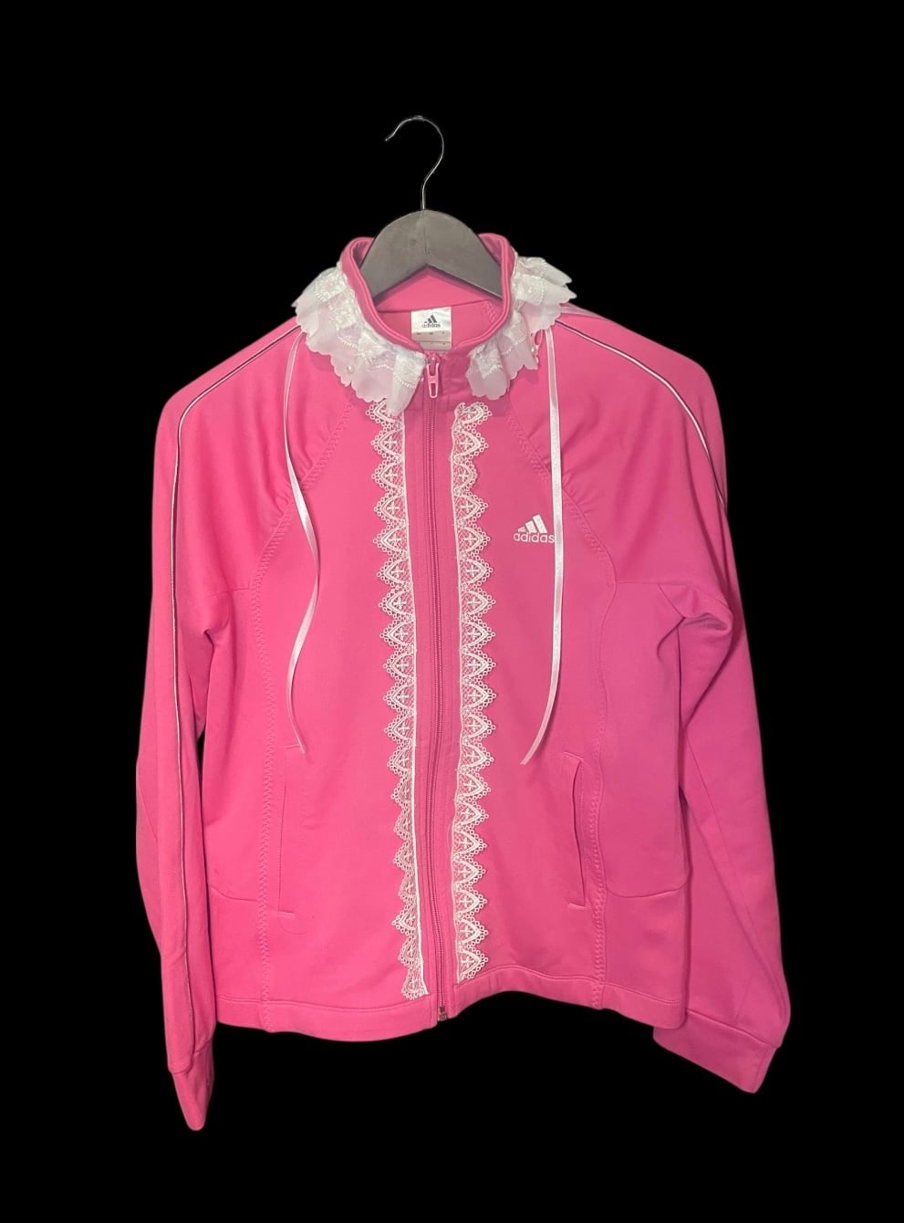 ジャージをベースに、フロントと襟元へレースを加えたリメイクトップス。