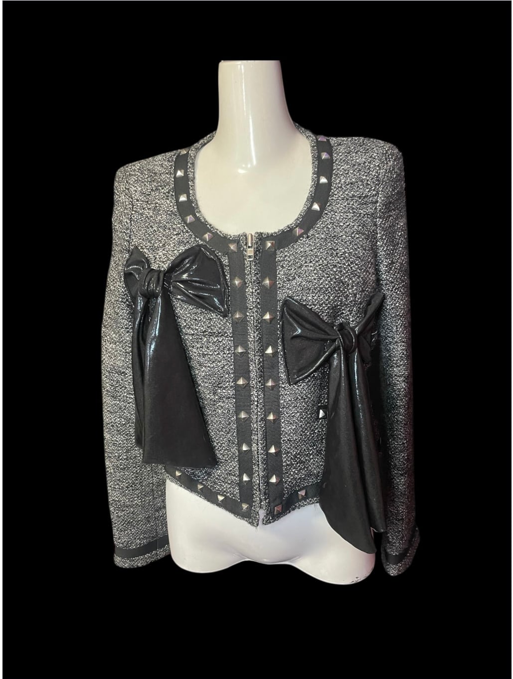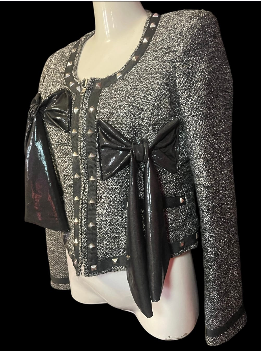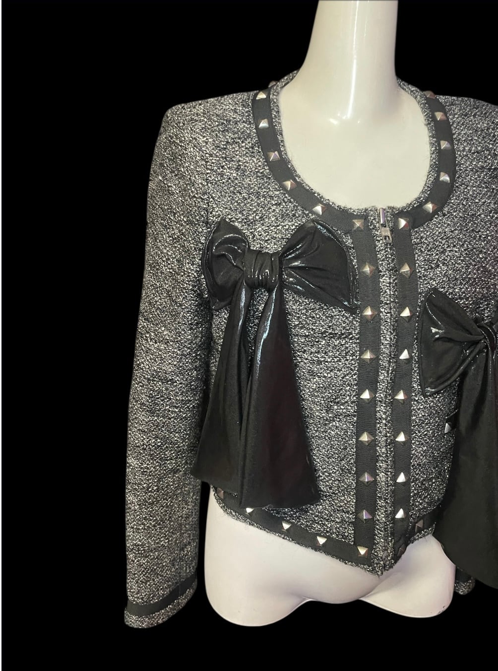 薄手のジャケットをベースに、黒い生地のリボンモチーフを配置したリメイクトップスです。