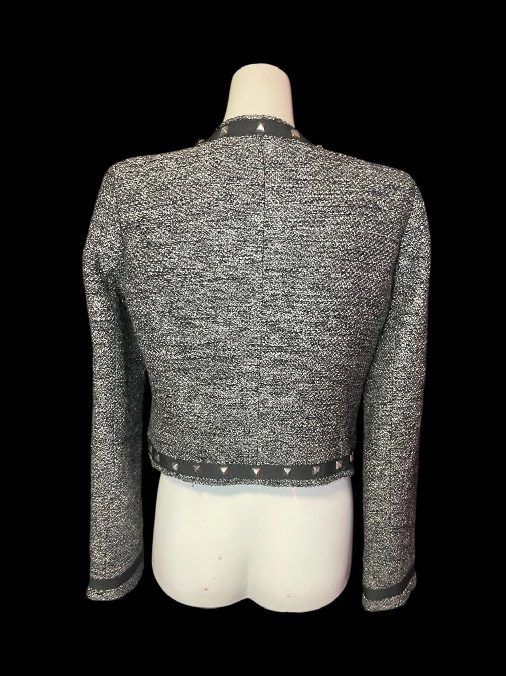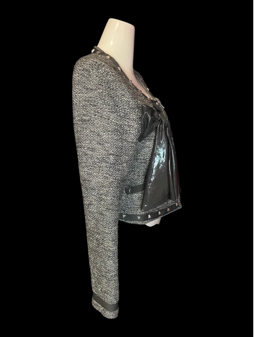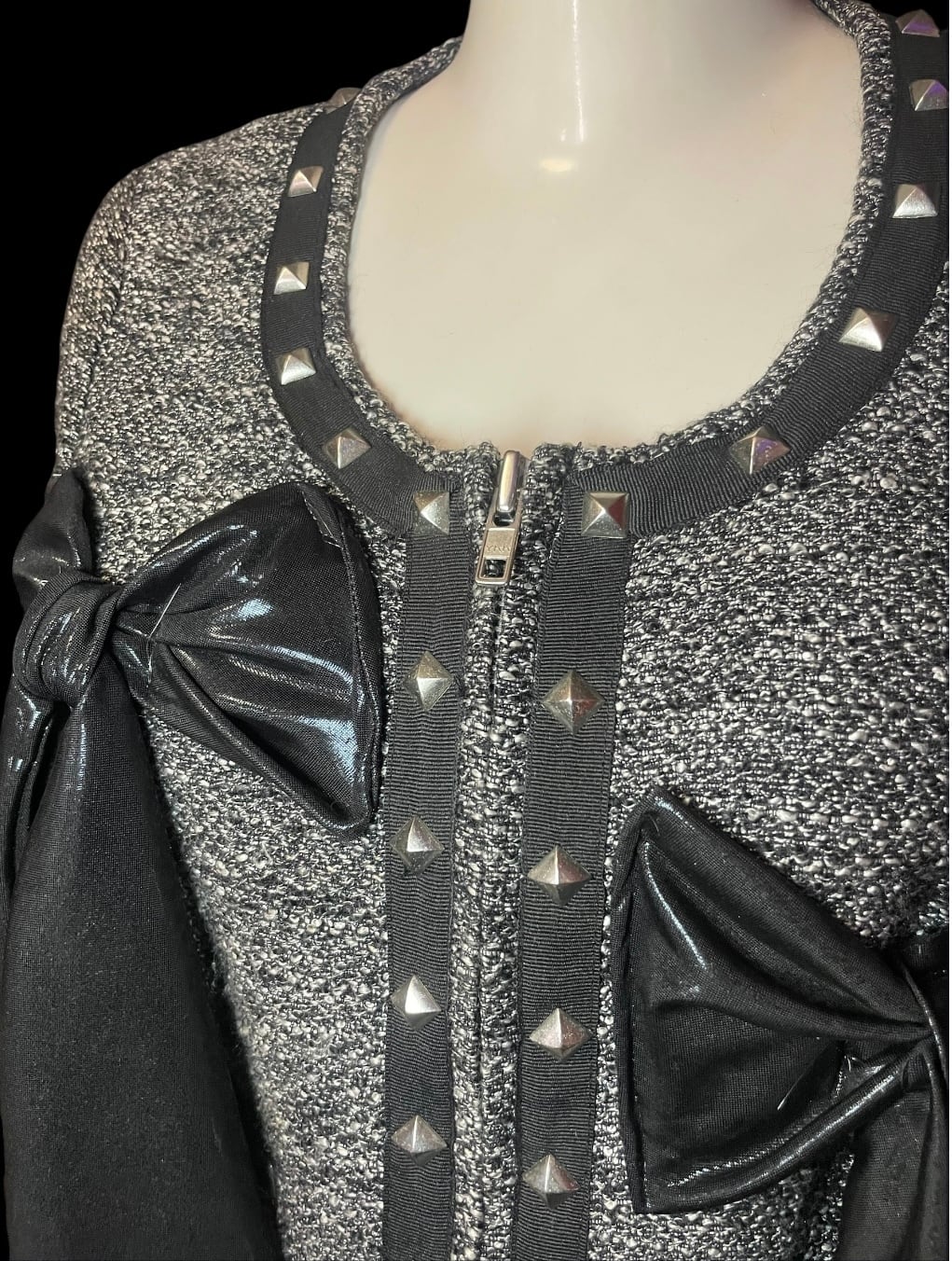 薄手のジャケットをベースに、黒い生地のリボンモチーフを配置したリメイクトップスです。