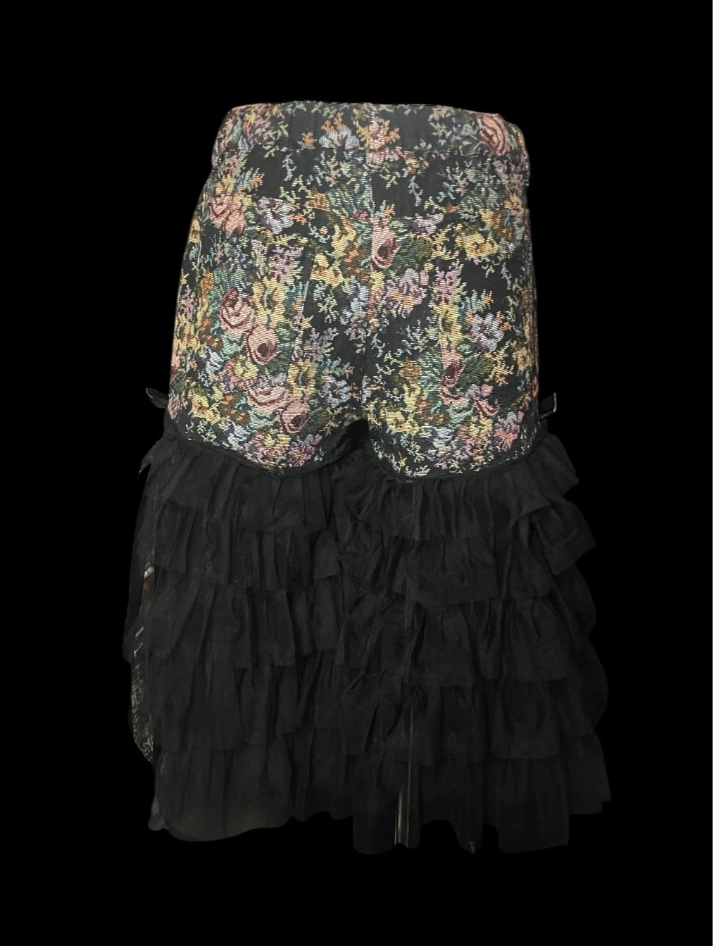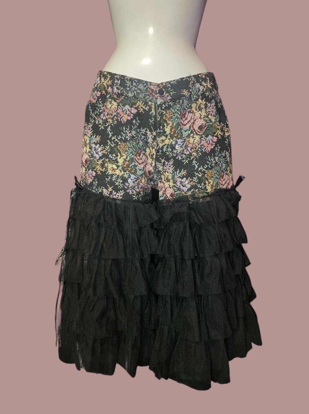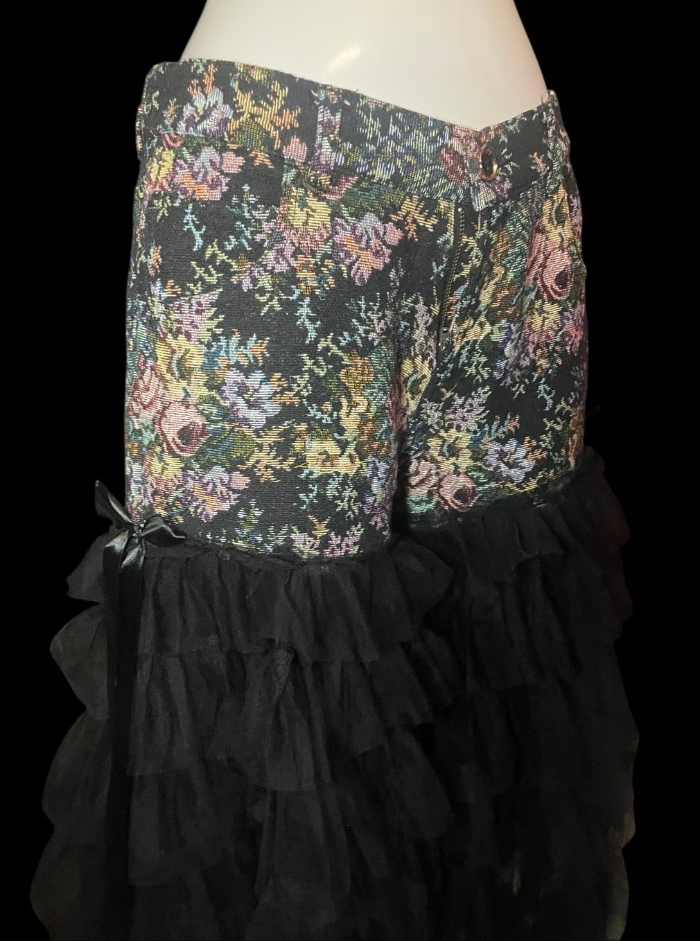 花柄生地のパンツにブラックチュールやリボンを重ねたリメイクアイテム。