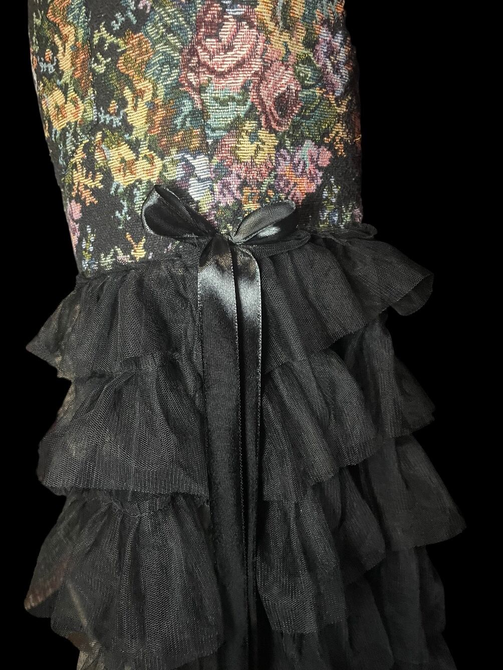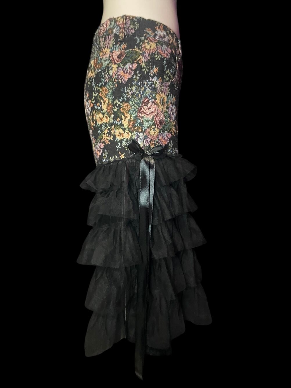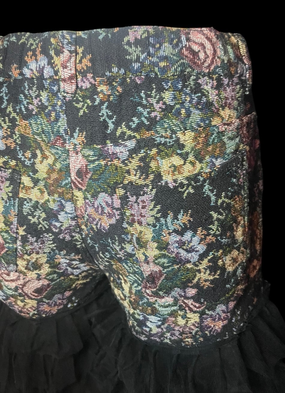 花柄生地のパンツにブラックチュールやリボンを重ねたリメイクアイテム。