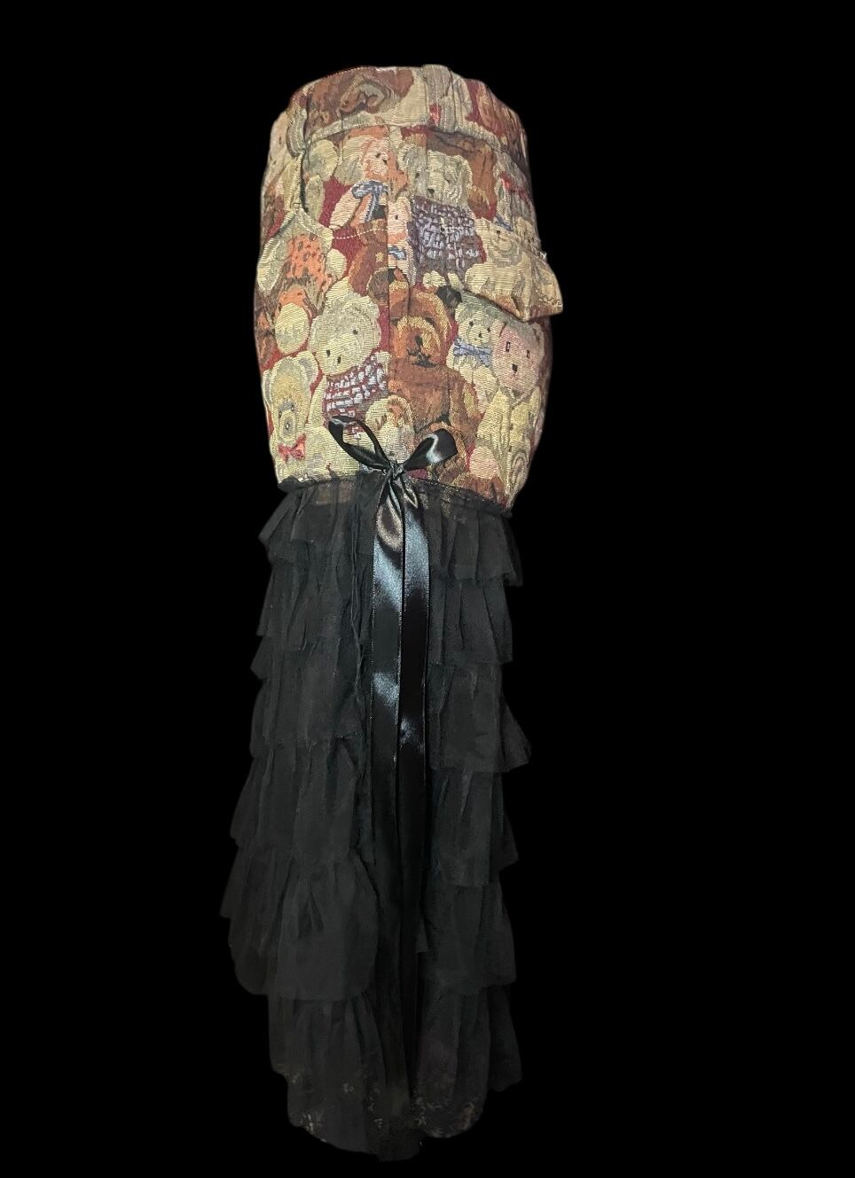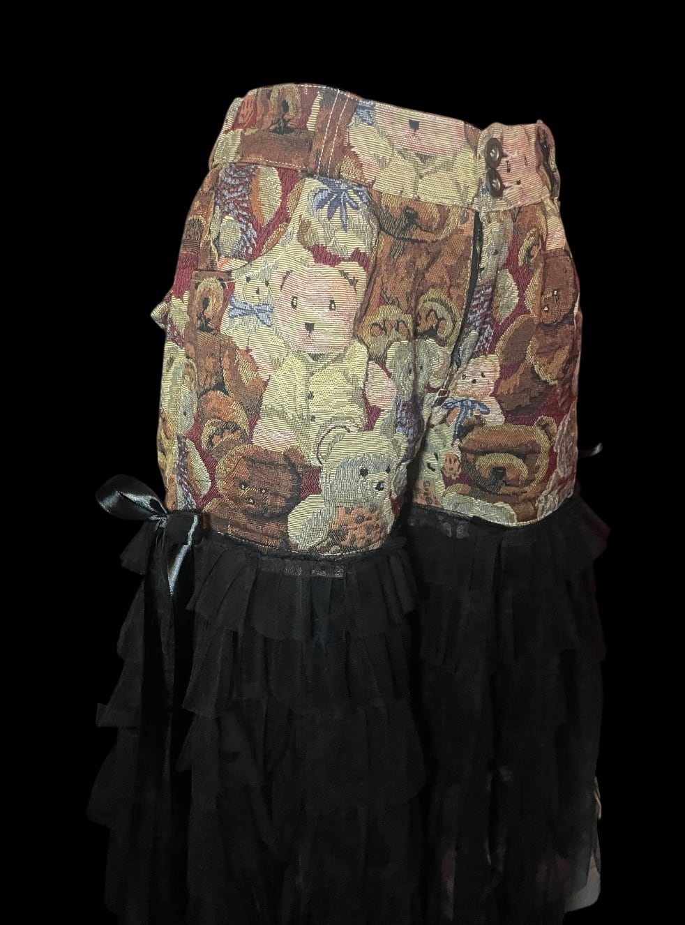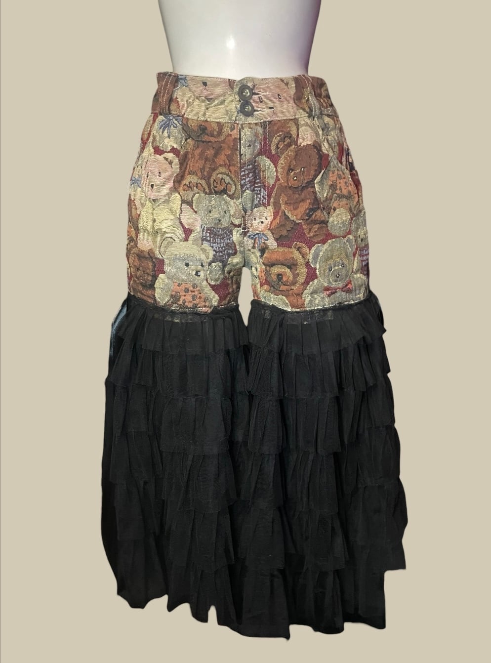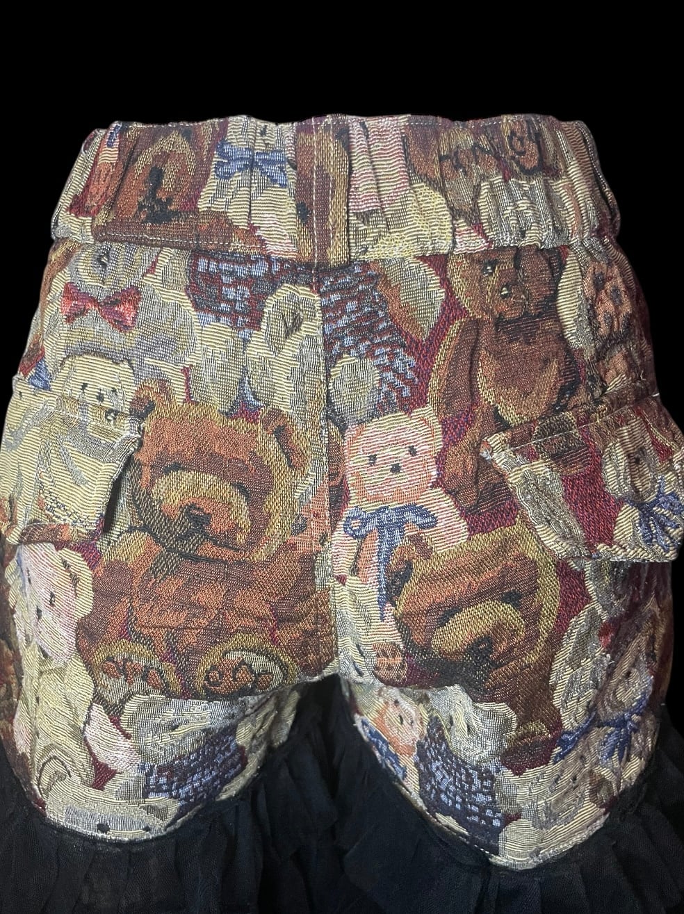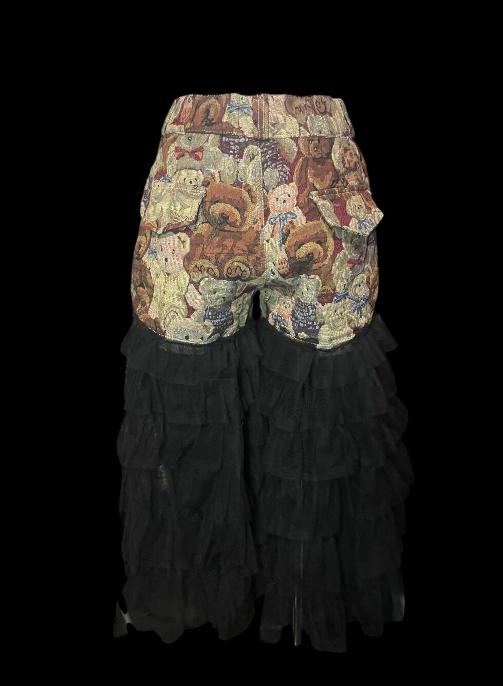 テディベア柄生地を使用したパンツに、ブラックチュールを重ねたリメイク。