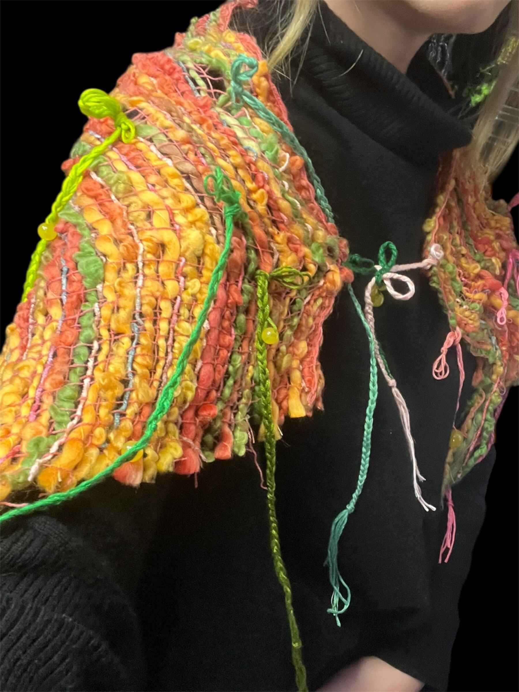 紐とビーズを用いて、全体がグラデーションになるよう配置されています。