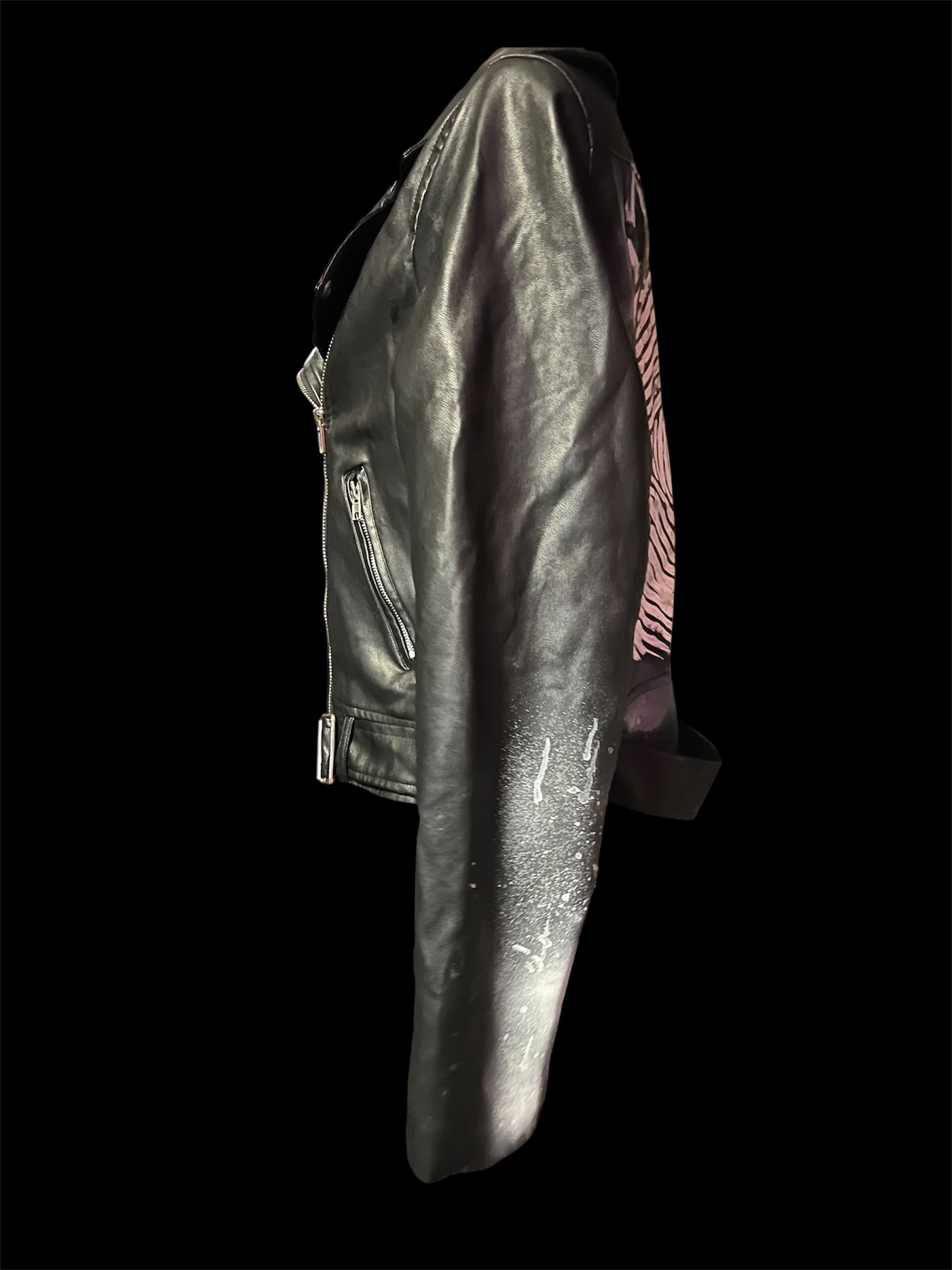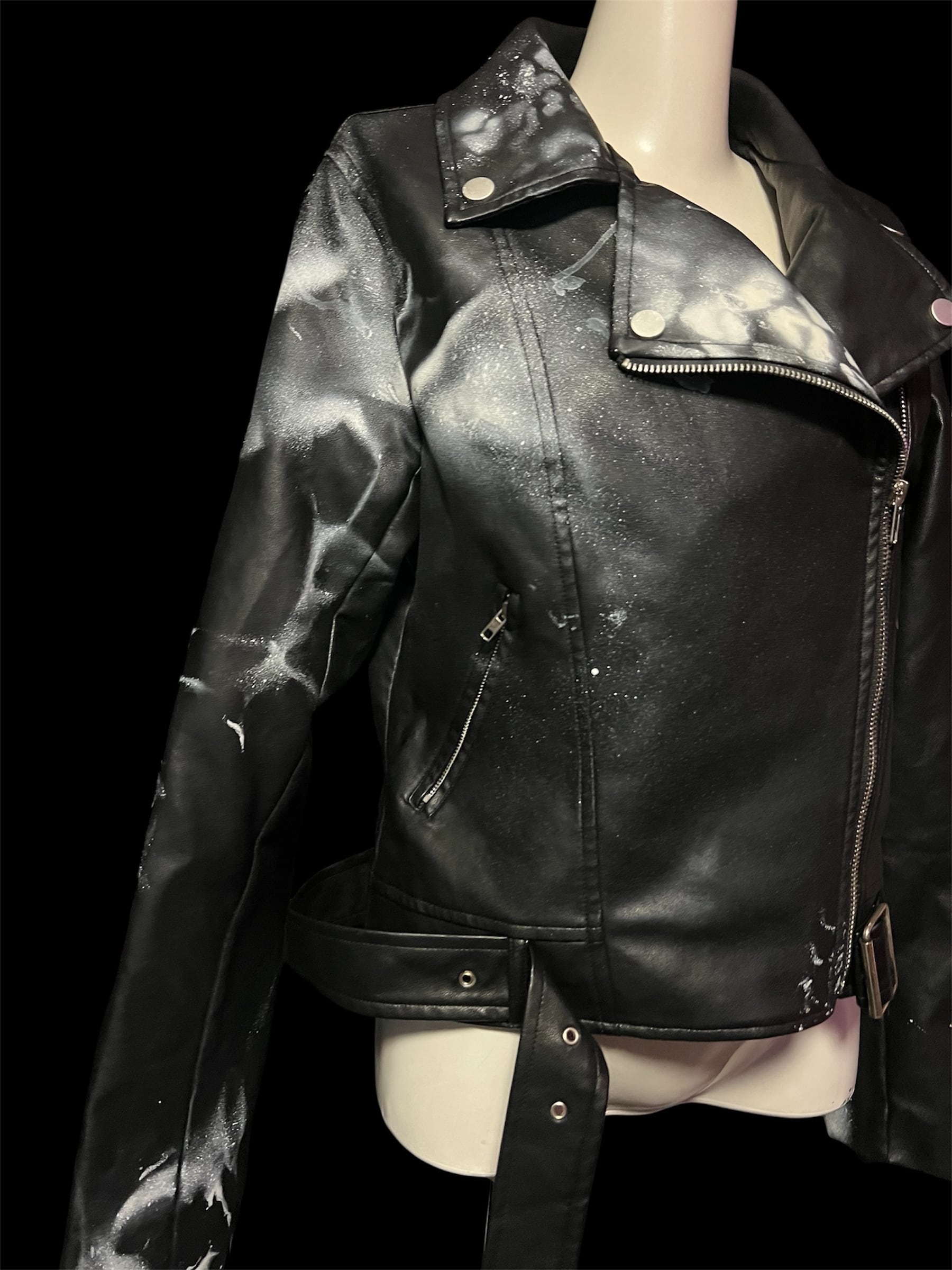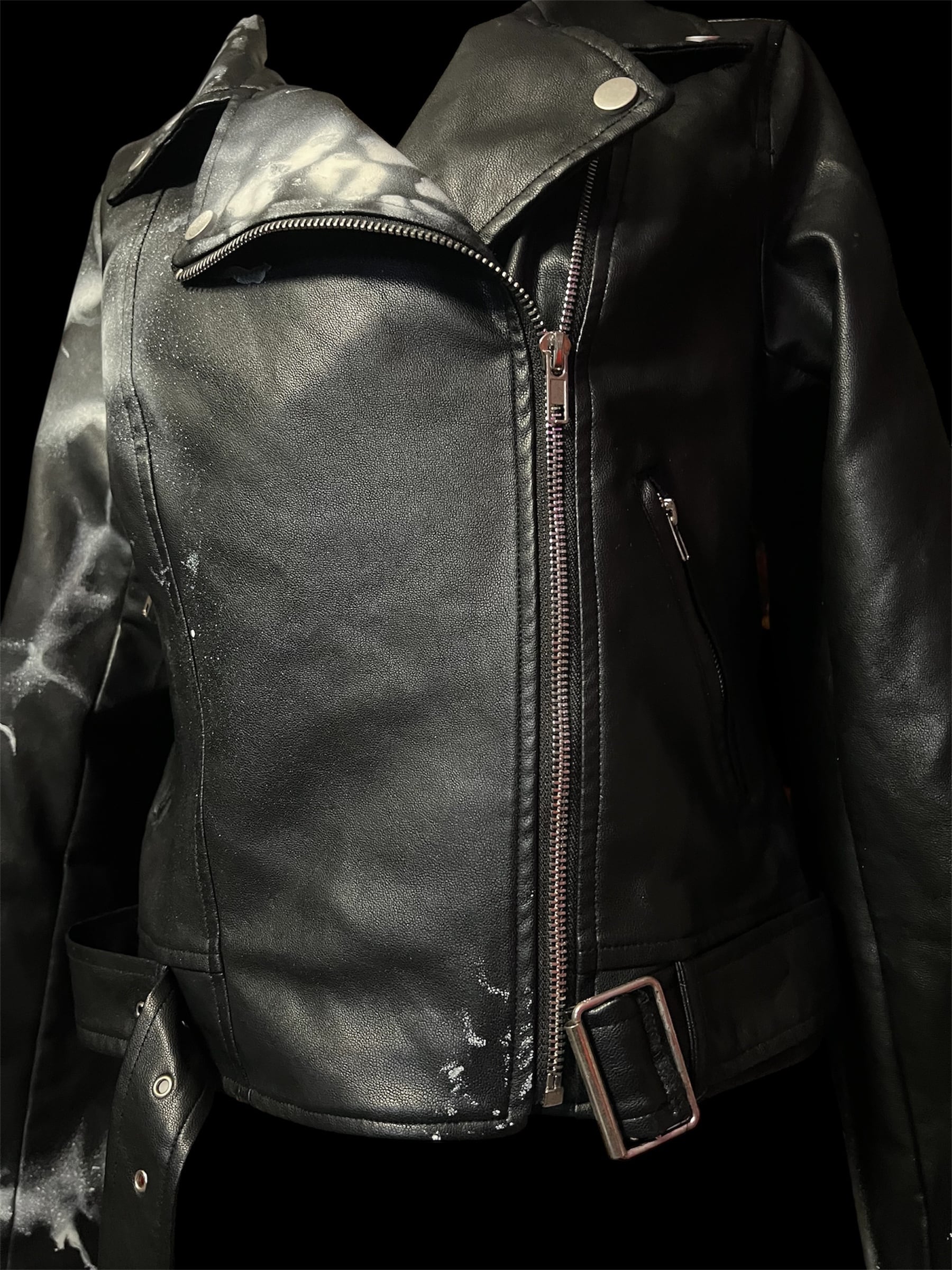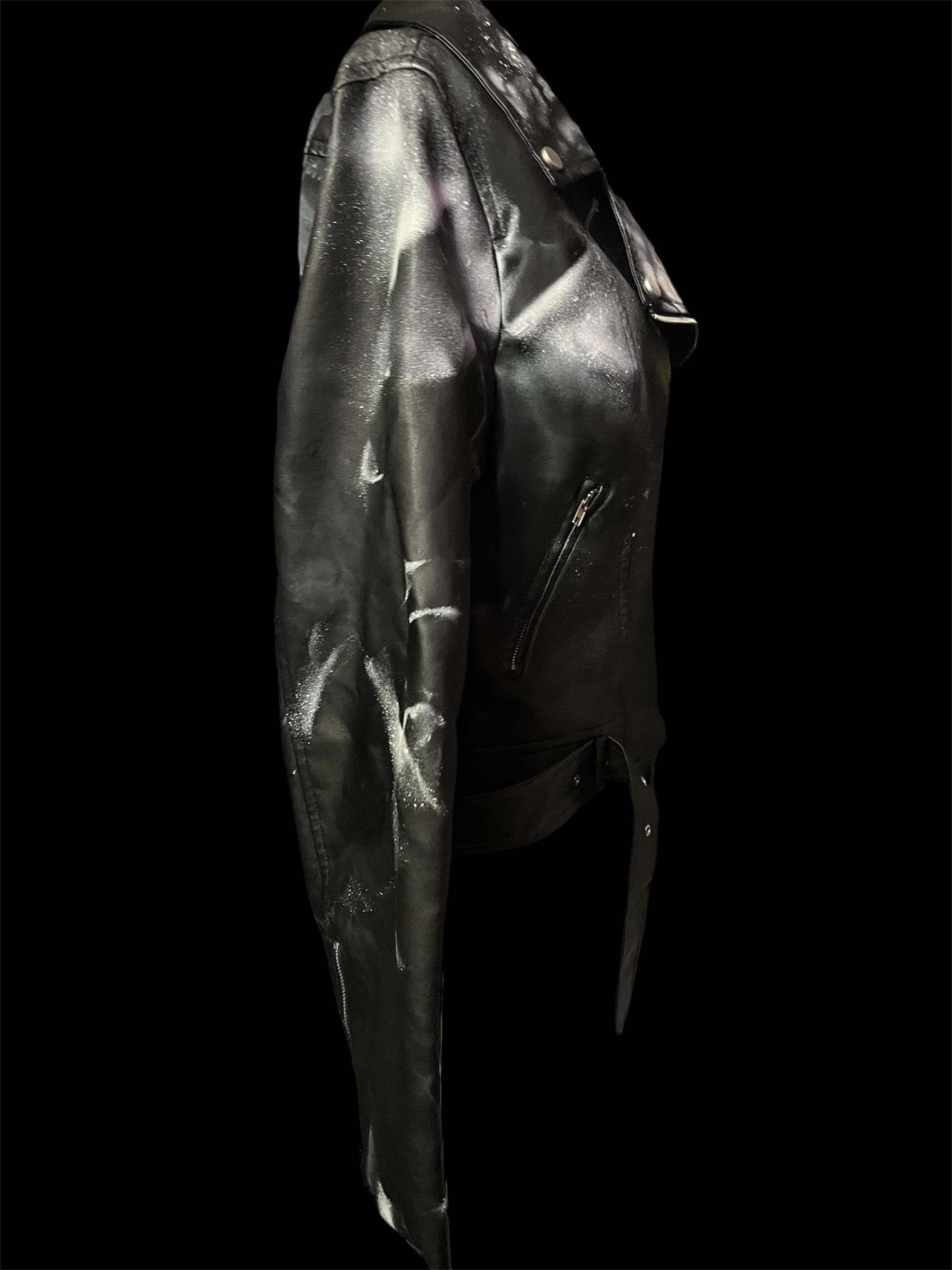 合皮素材のライダースジャケットをベースに、背面へ大胆なペイント加工を施した一点です。