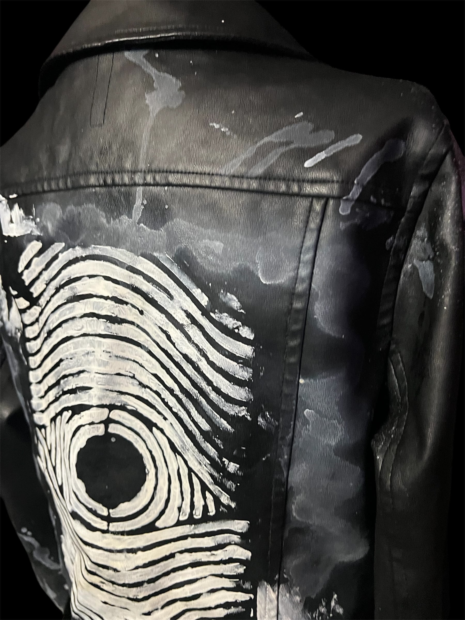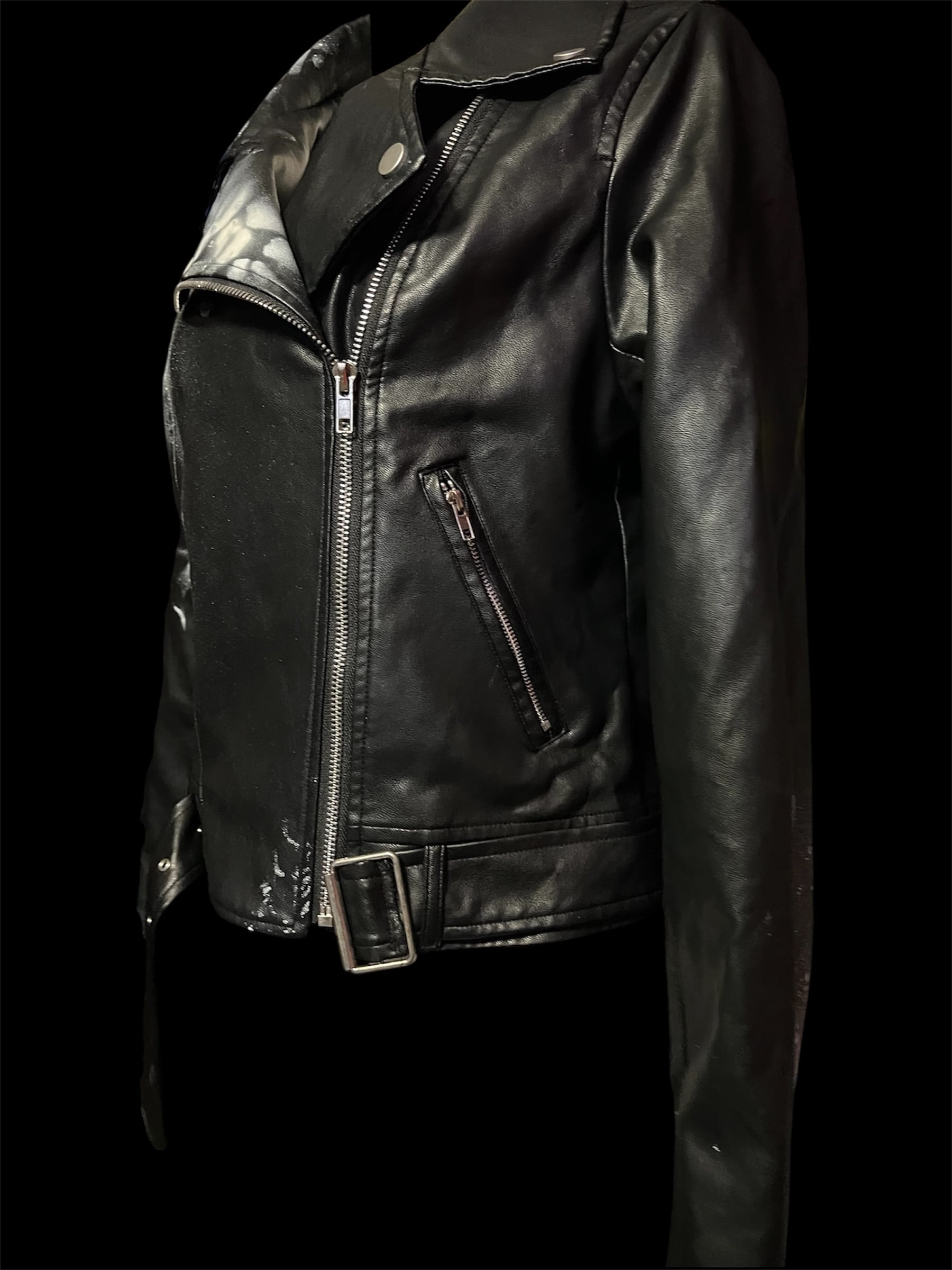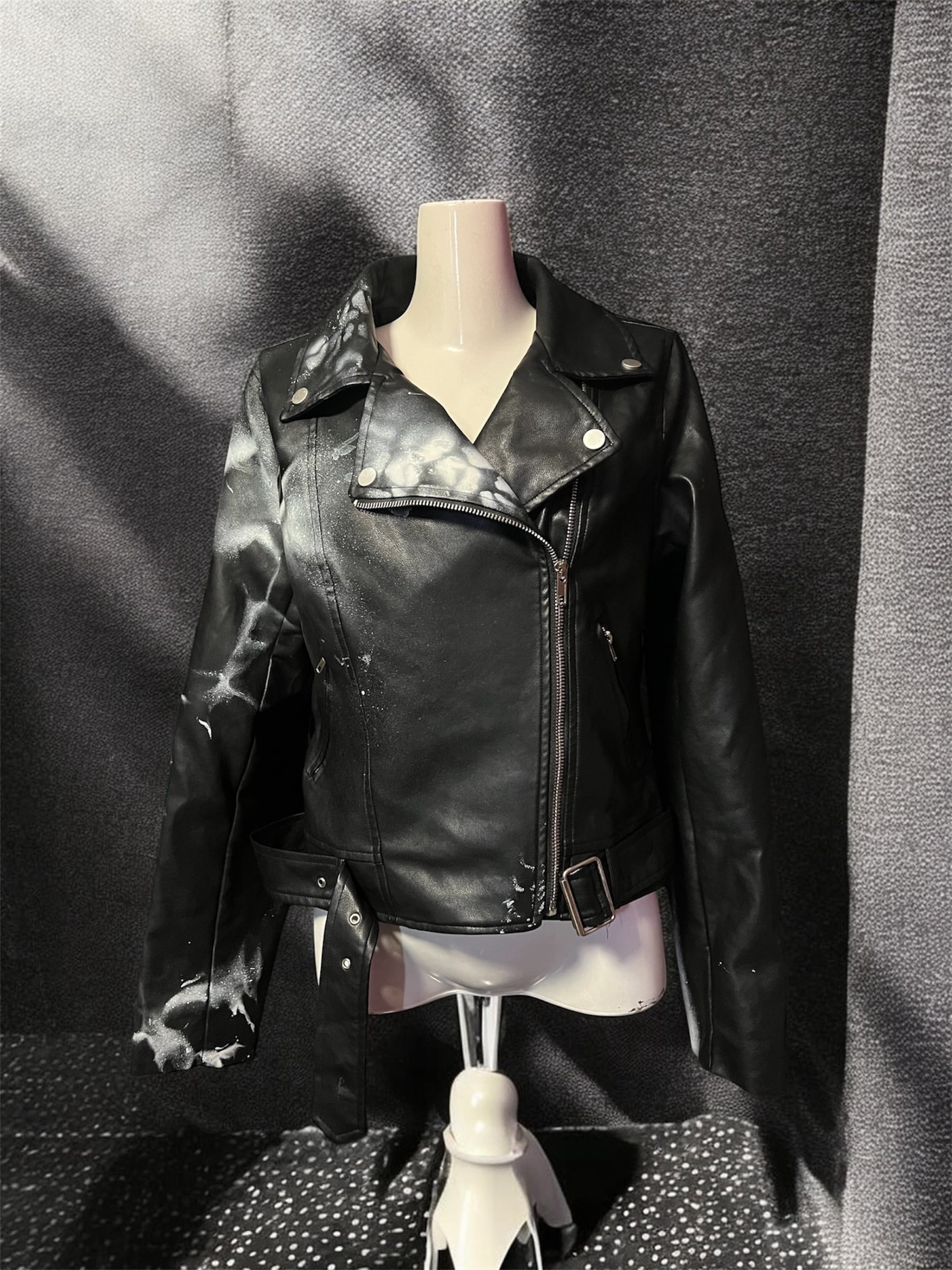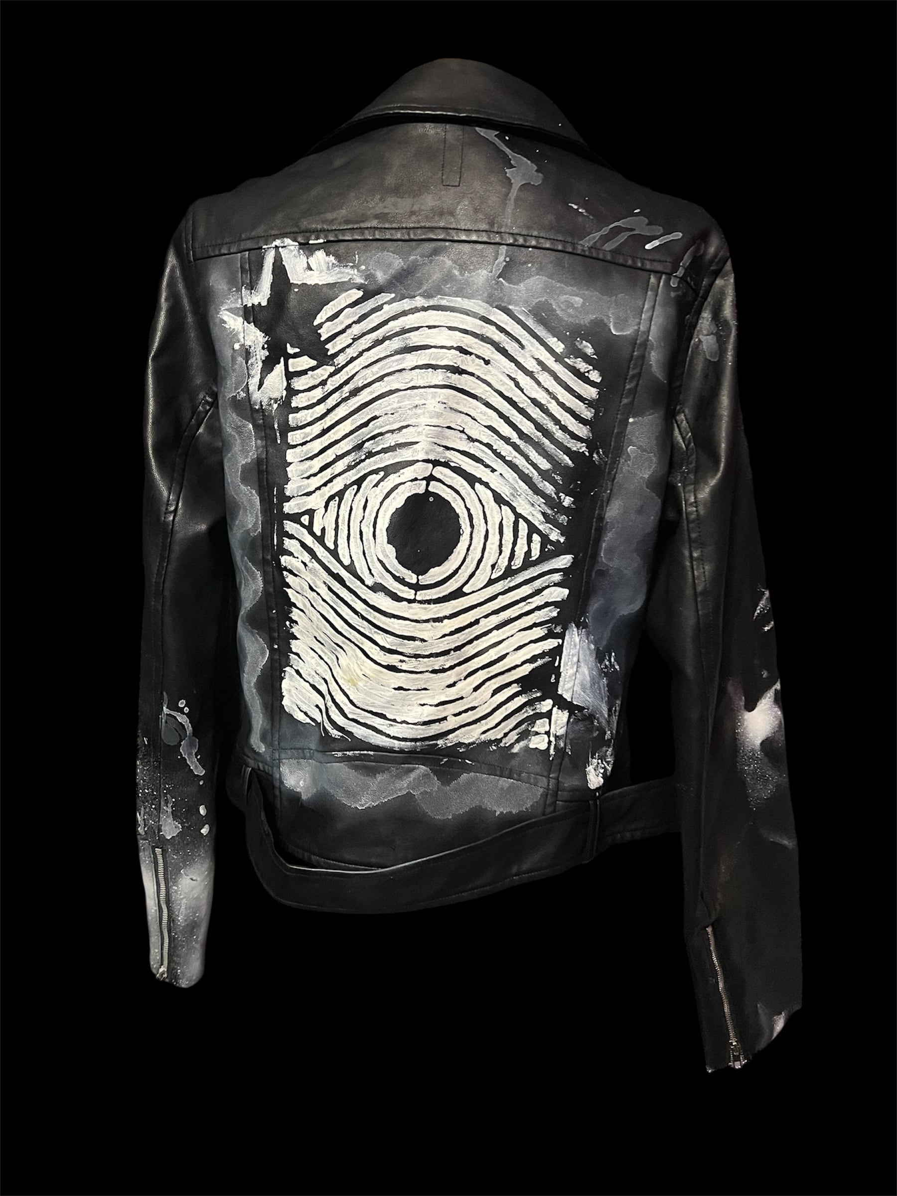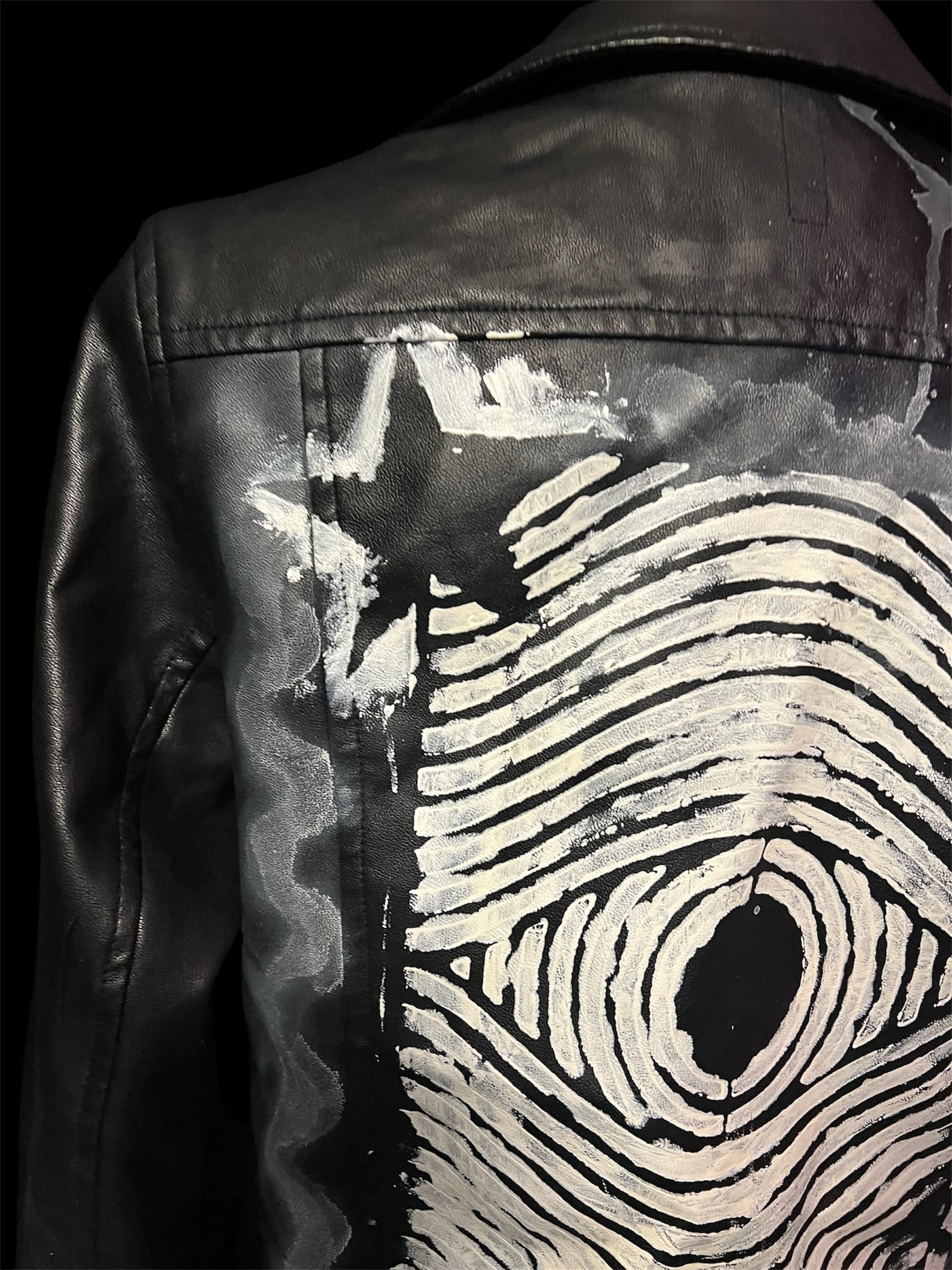 合皮素材のライダースジャケットをベースに、背面へ大胆なペイント加工を施した一点です。