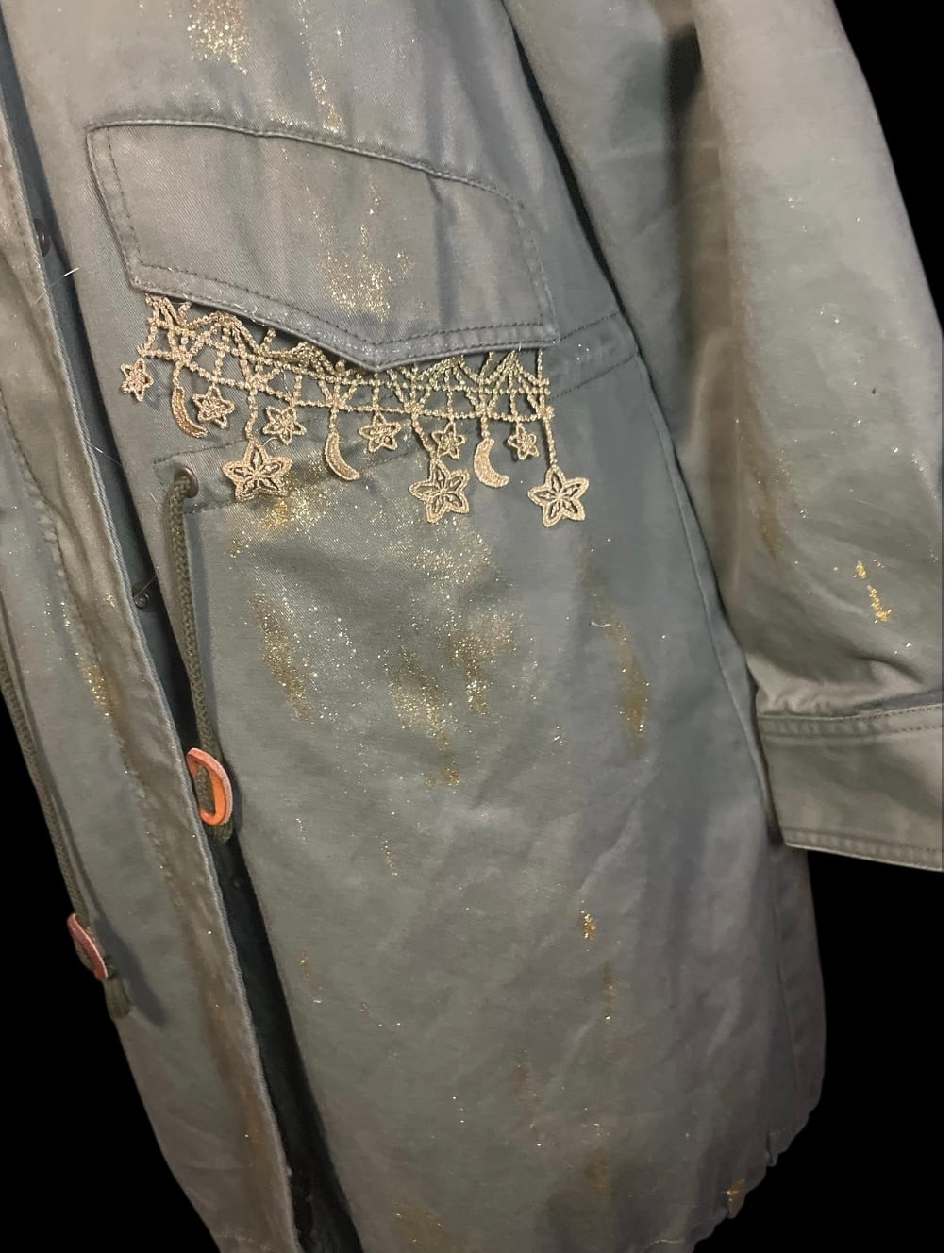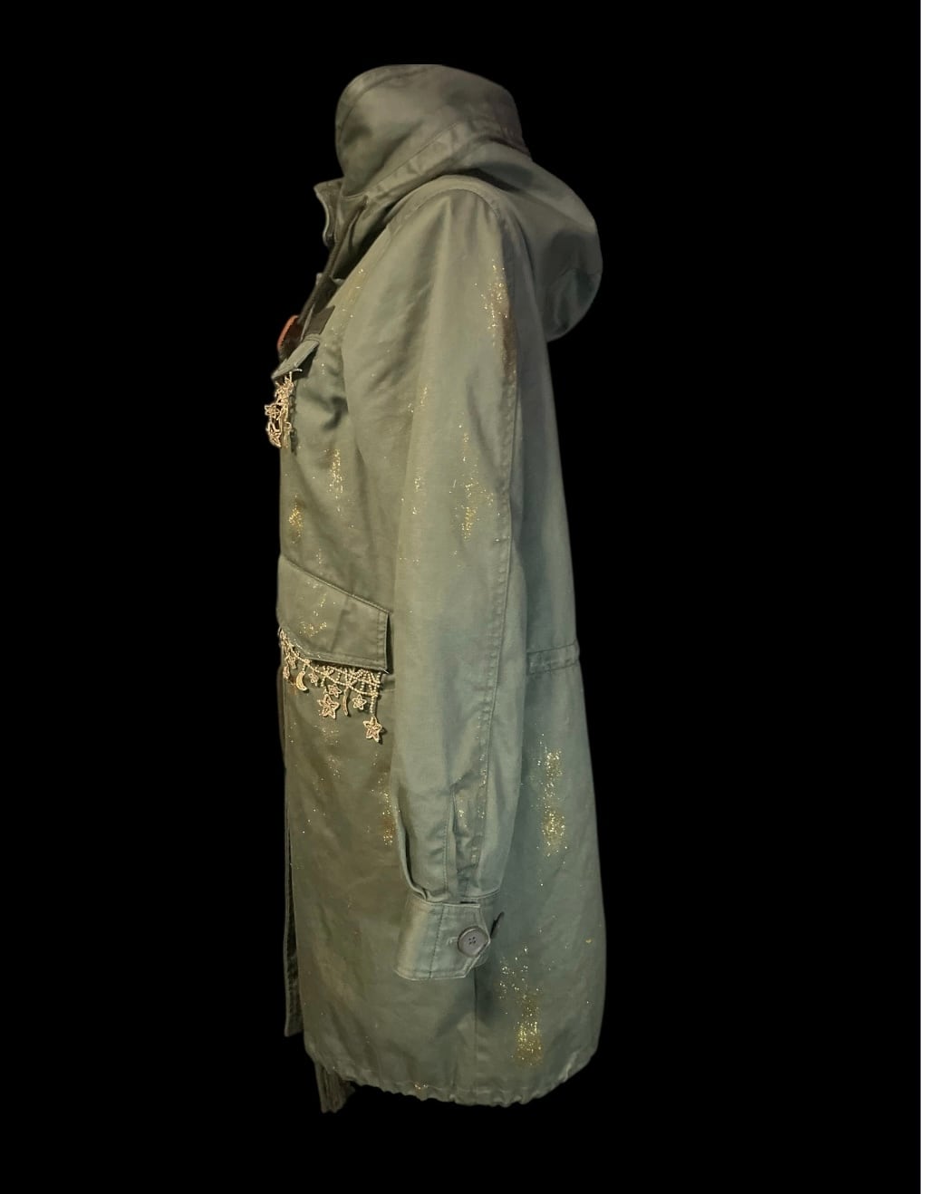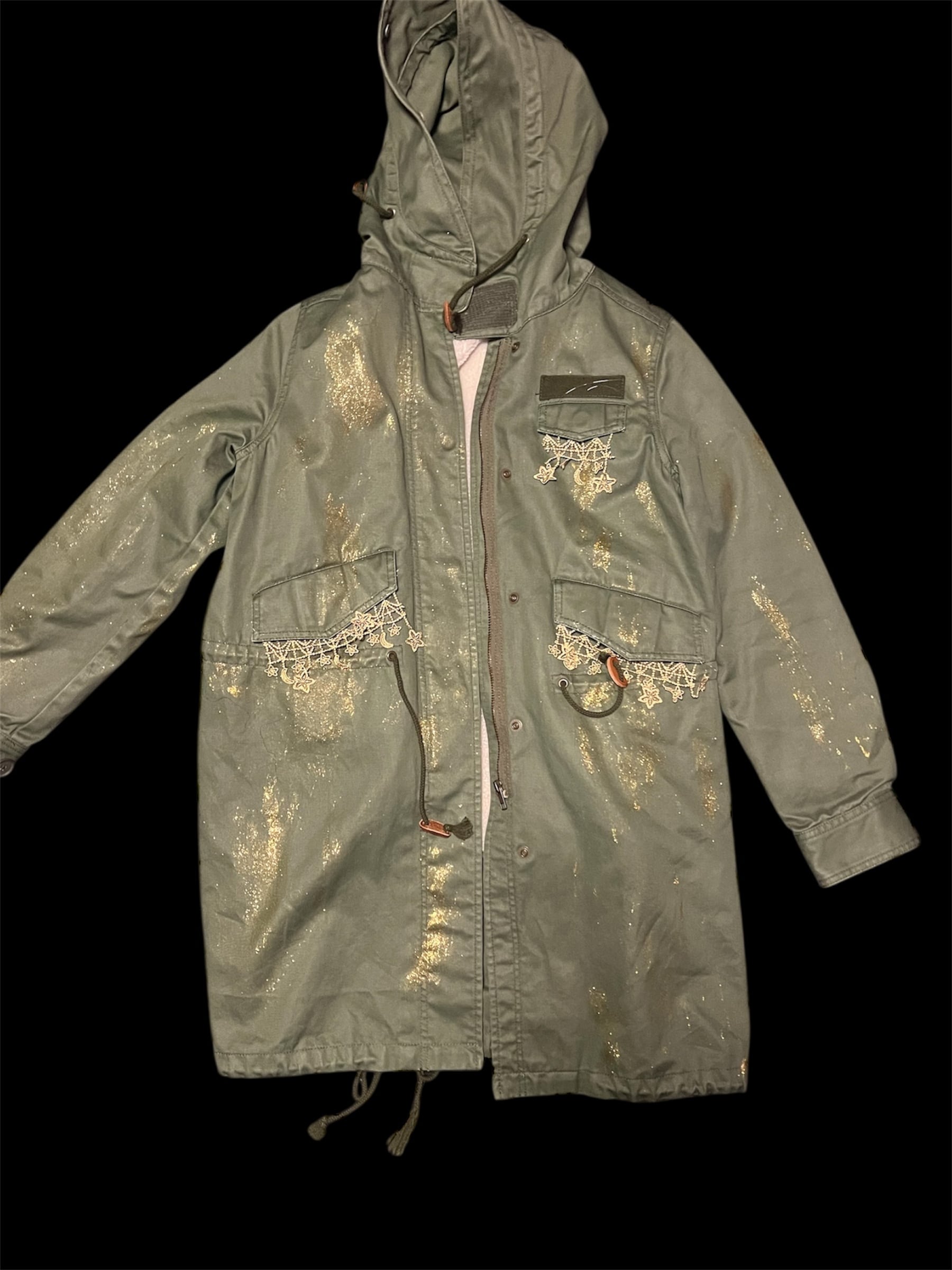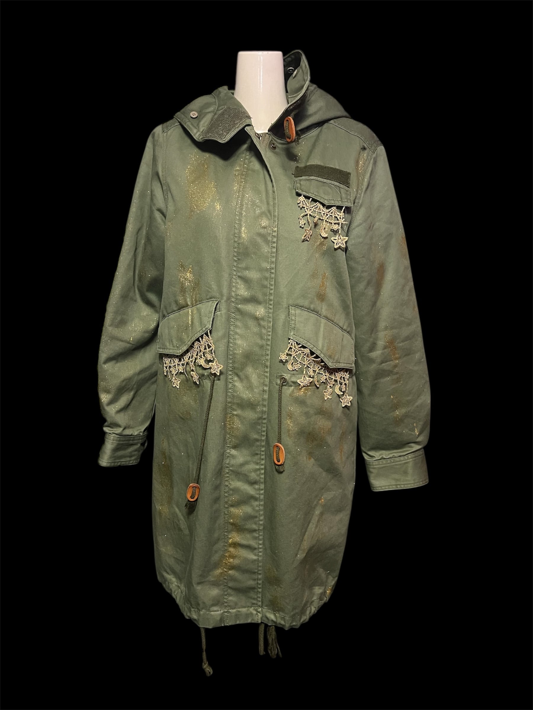 カーキカラーのミリタリーコートをベースに、星のレースやゴールドのペイントを施したリメイクアイテムです。ロング丈で直線的なシルエットです。裏地は取り外し可能で、季節に応じて調整できます。