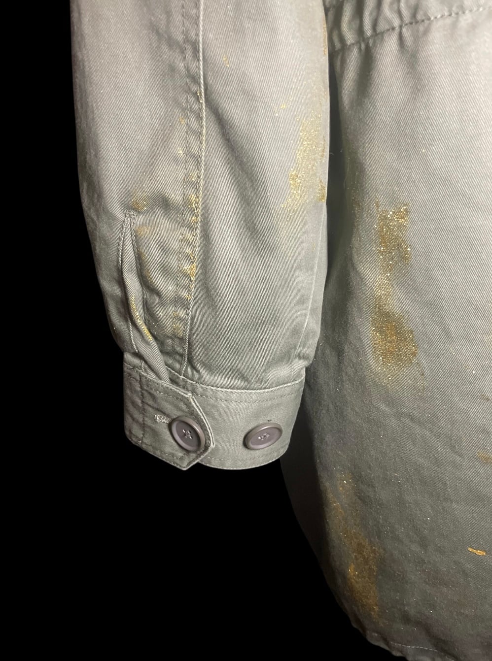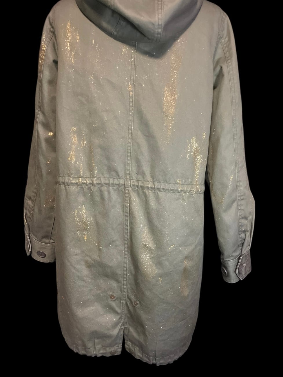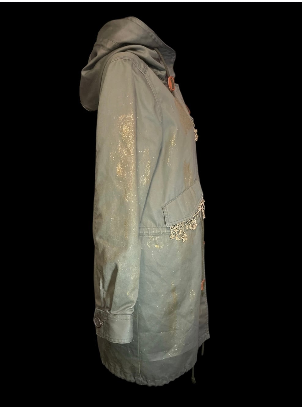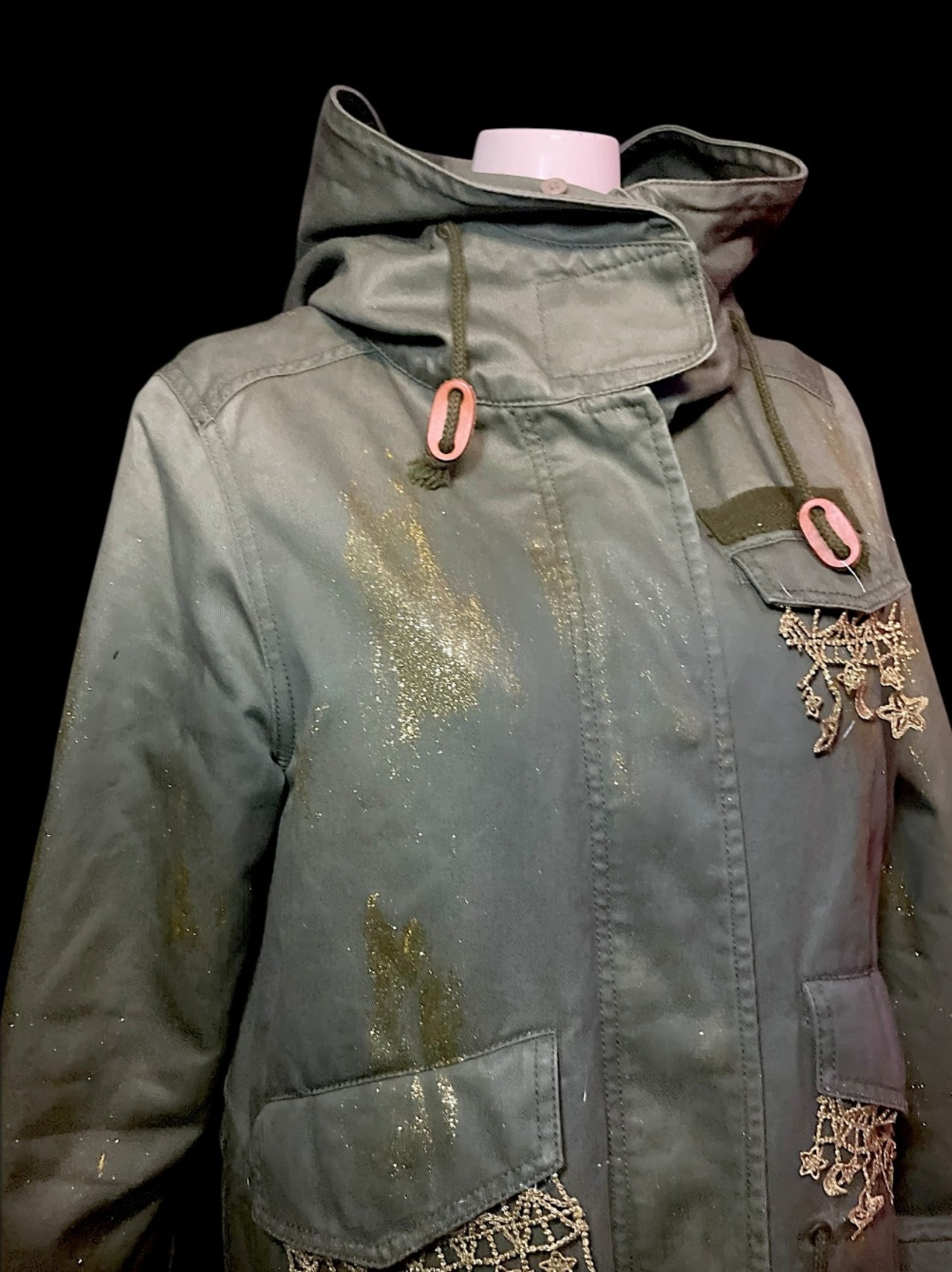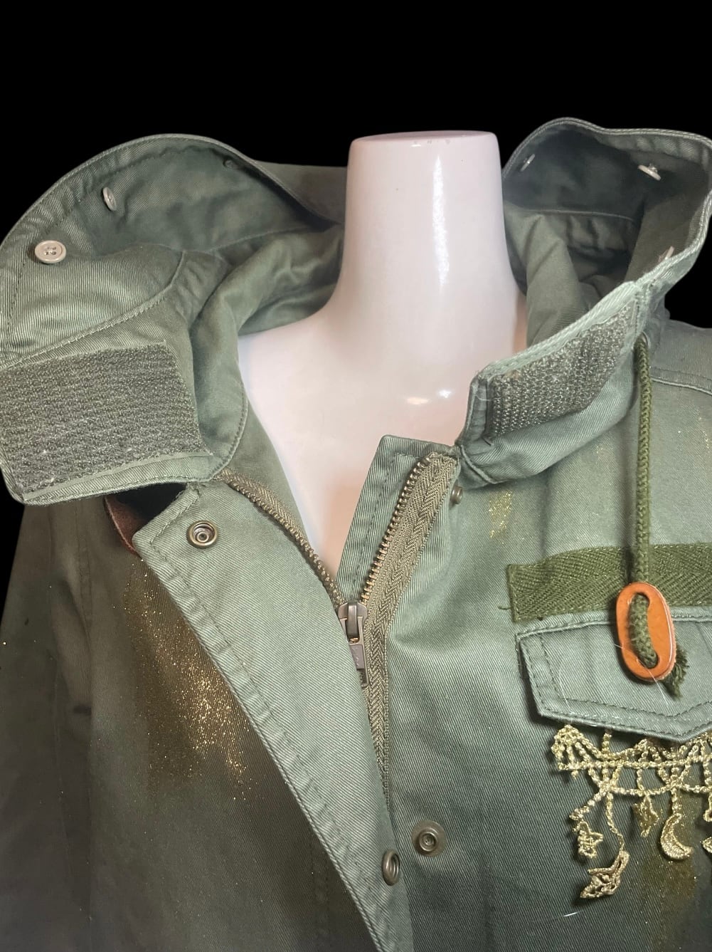 カーキカラーのミリタリーコートをベースに、星のレースやゴールドのペイントを施したリメイクアイテムです。ロング丈で直線的なシルエットです。裏地は取り外し可能で、季節に応じて調整できます。
