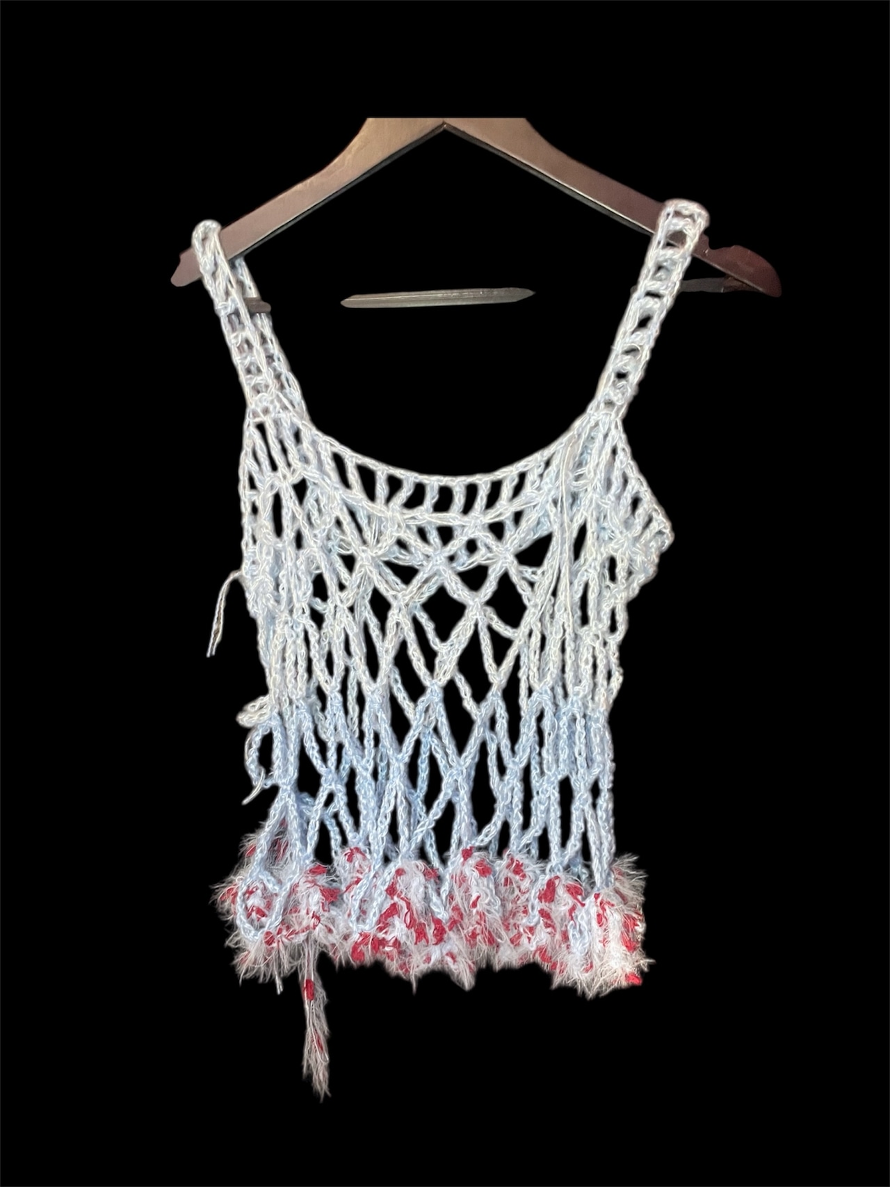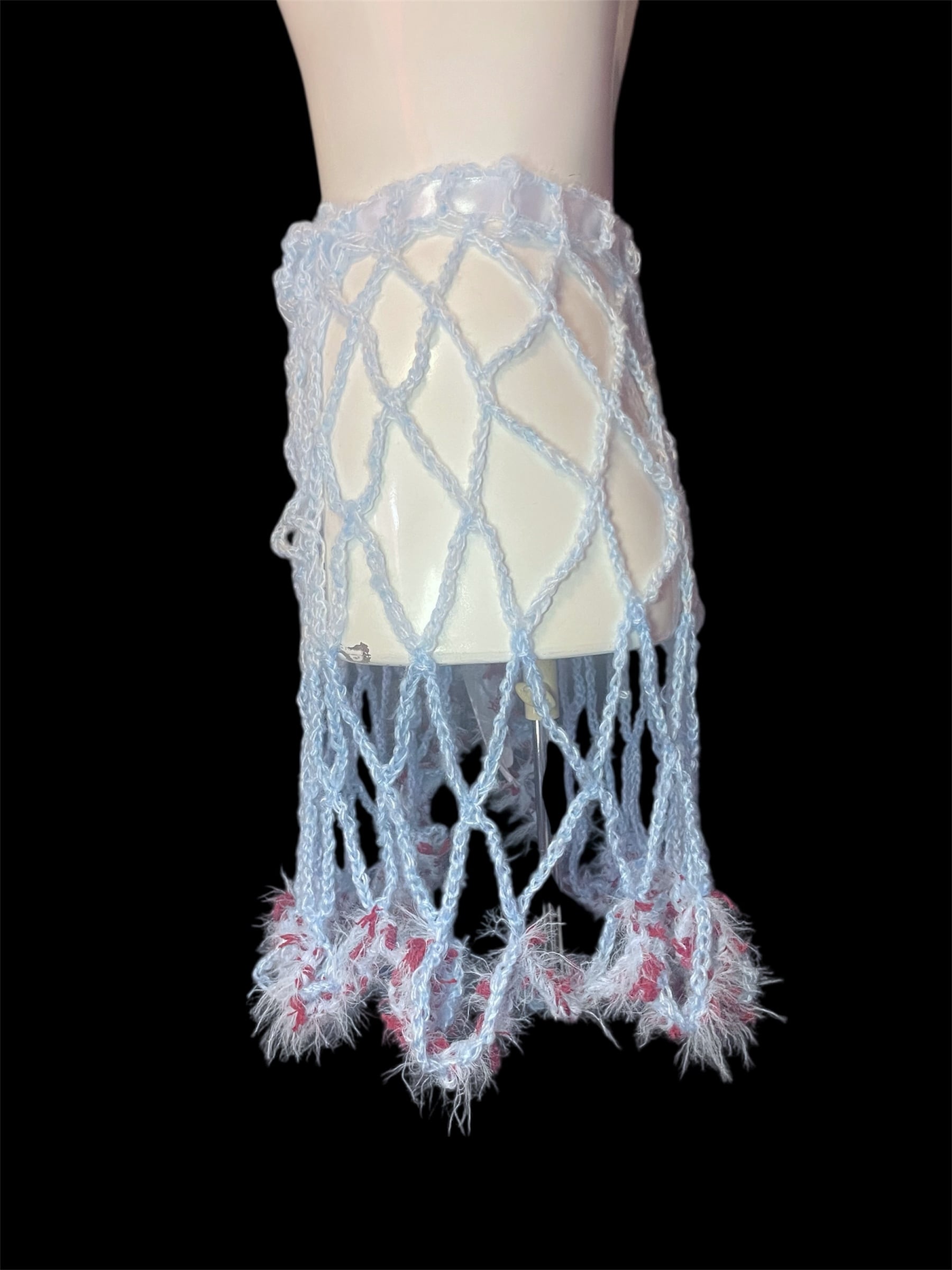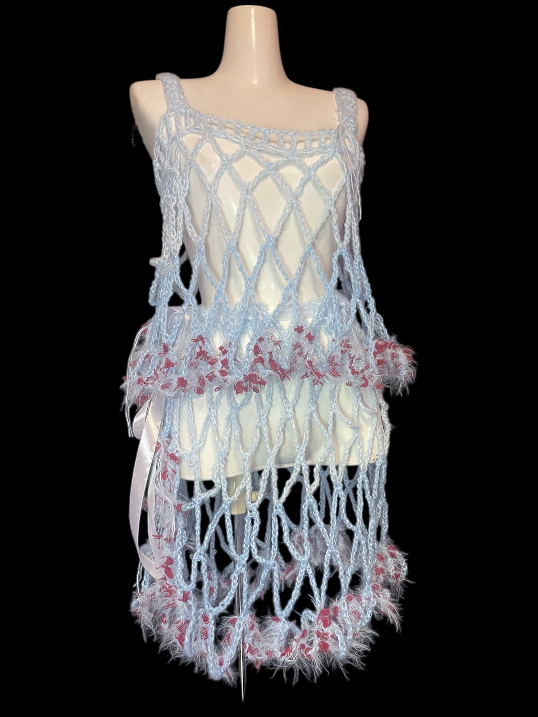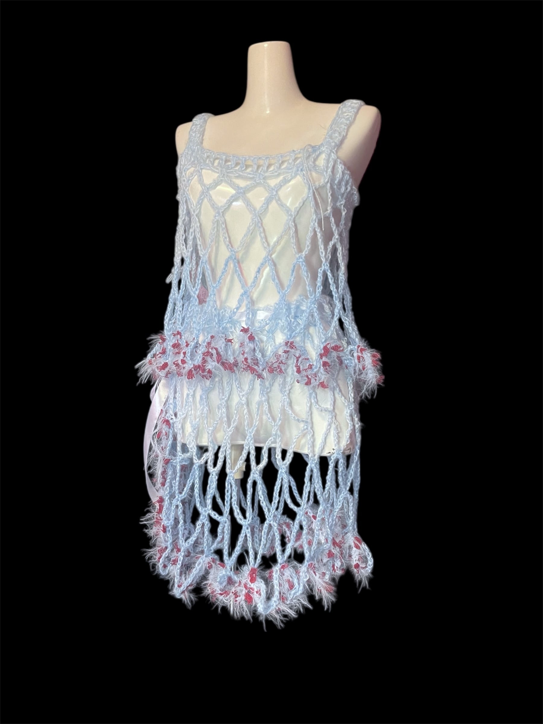 ライトブルーのネット編みニットのキャミソールと腰巻きスカートです。赤っぽい毛糸を切り替えで配置しています。全体に透け感があり、縦長のシルエットを強調します。
