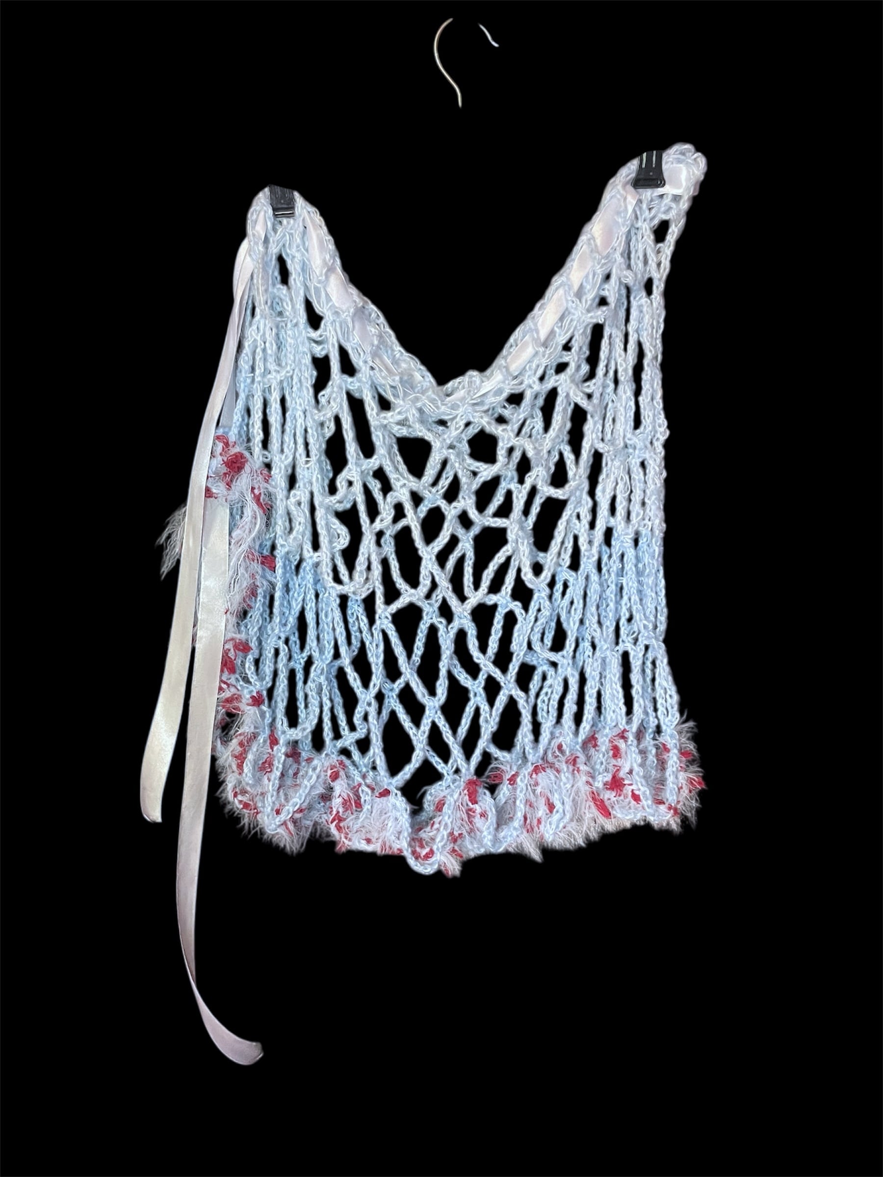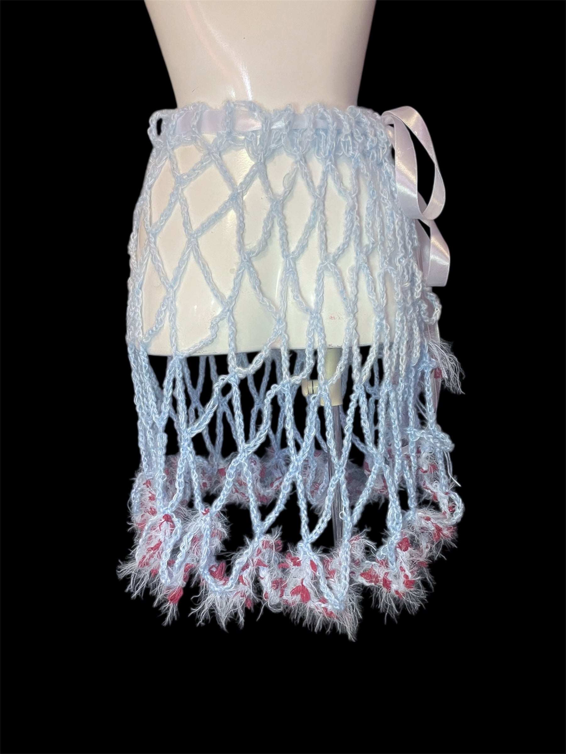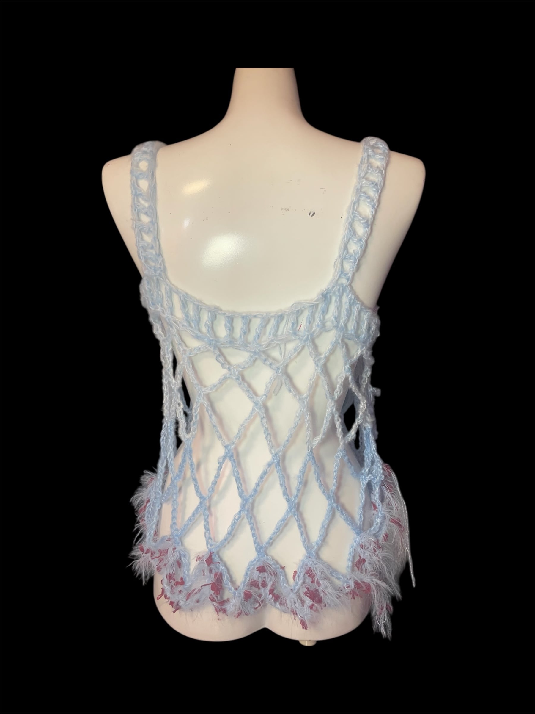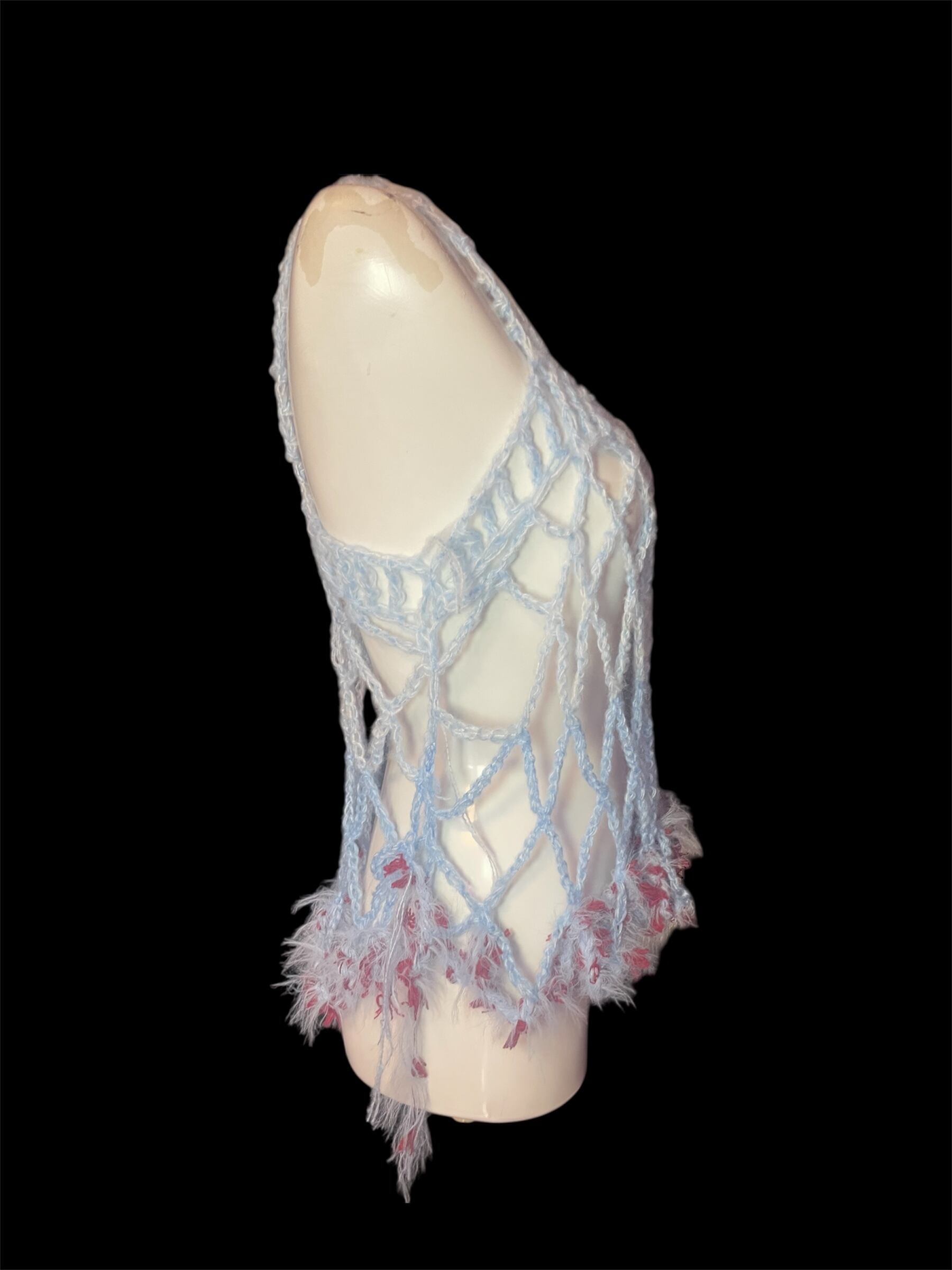 ライトブルーのネット編みニットのキャミソールと腰巻きスカートです。赤っぽい毛糸を切り替えで配置しています。全体に透け感があり、縦長のシルエットを強調します。