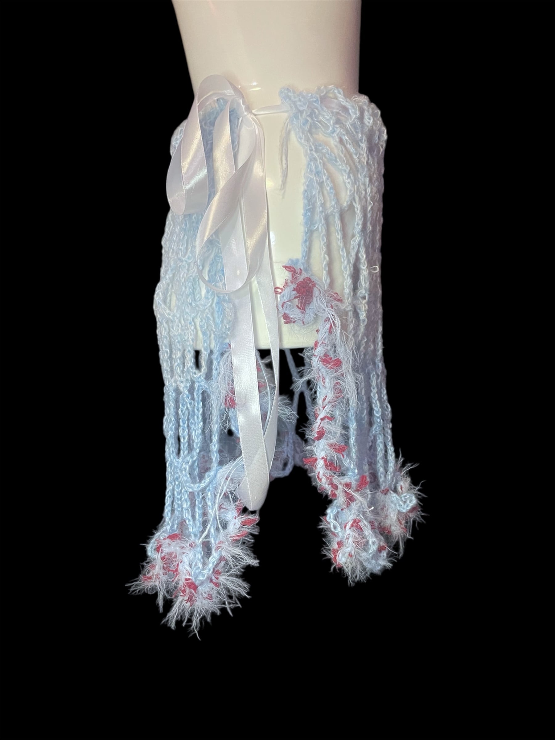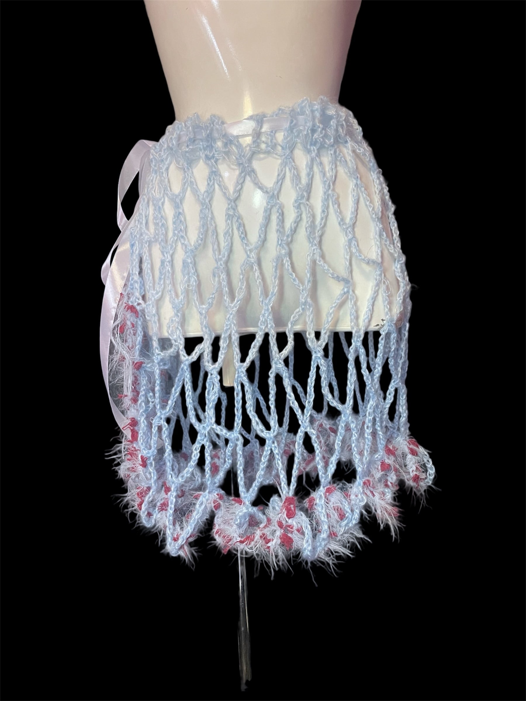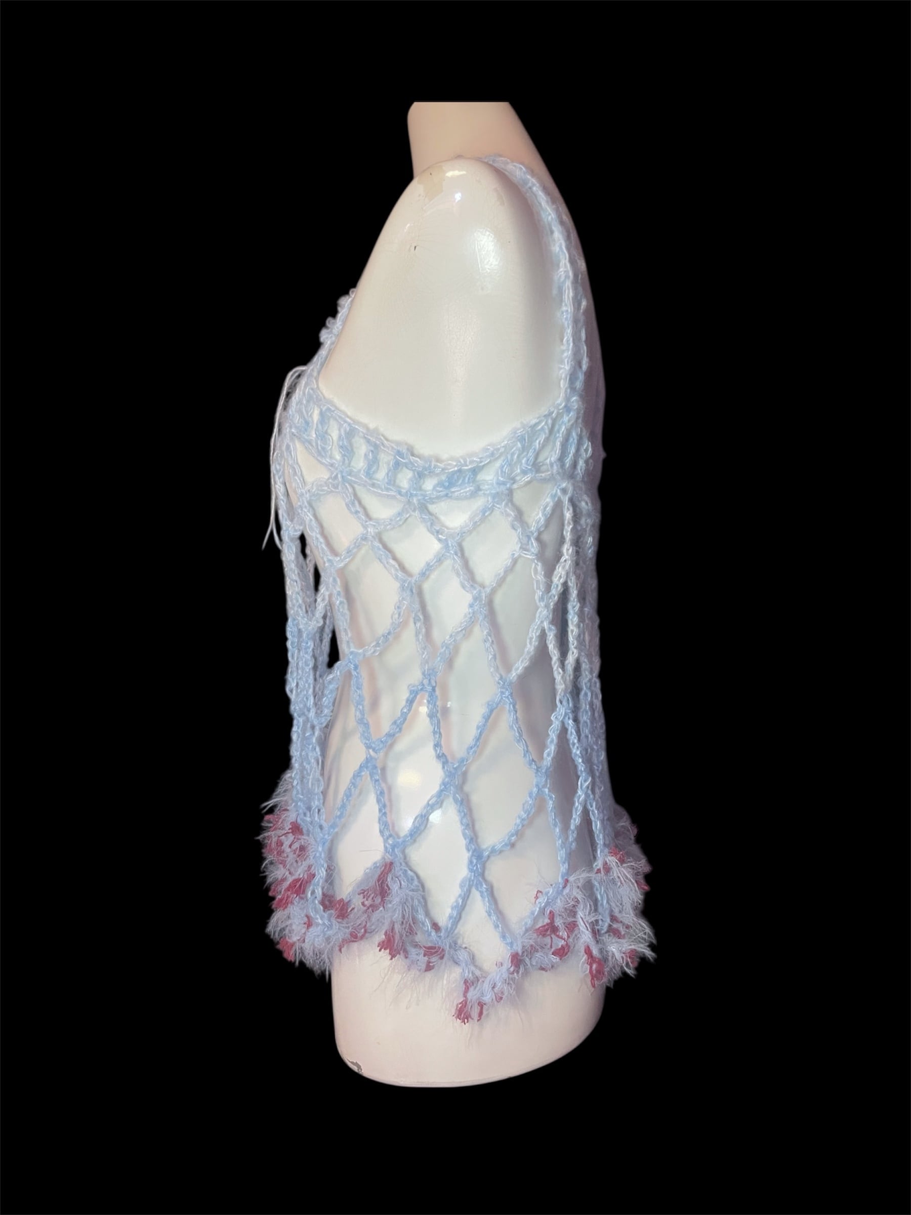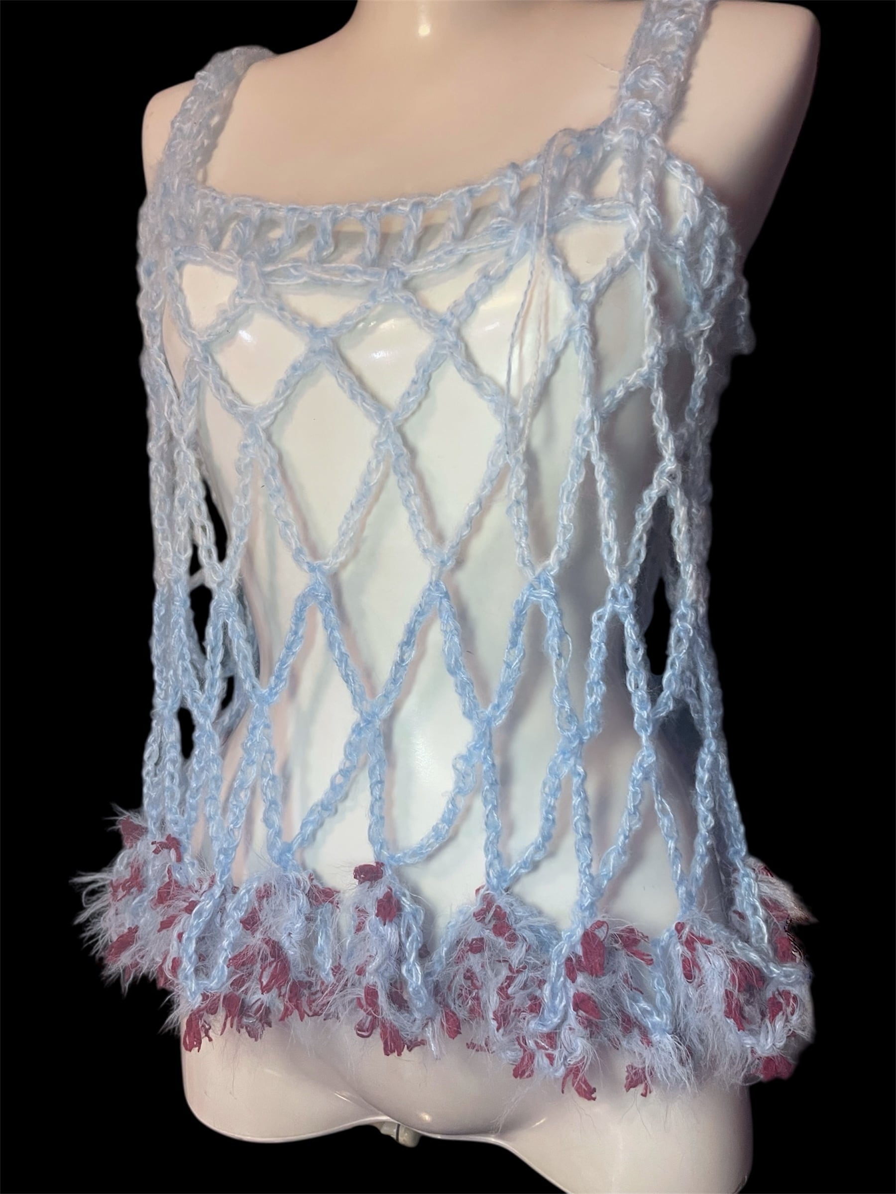ライトブルーのネット編みニットのキャミソールと腰巻きスカートです。赤っぽい毛糸を切り替えで配置しています。全体に透け感があり、縦長のシルエットを強調します。