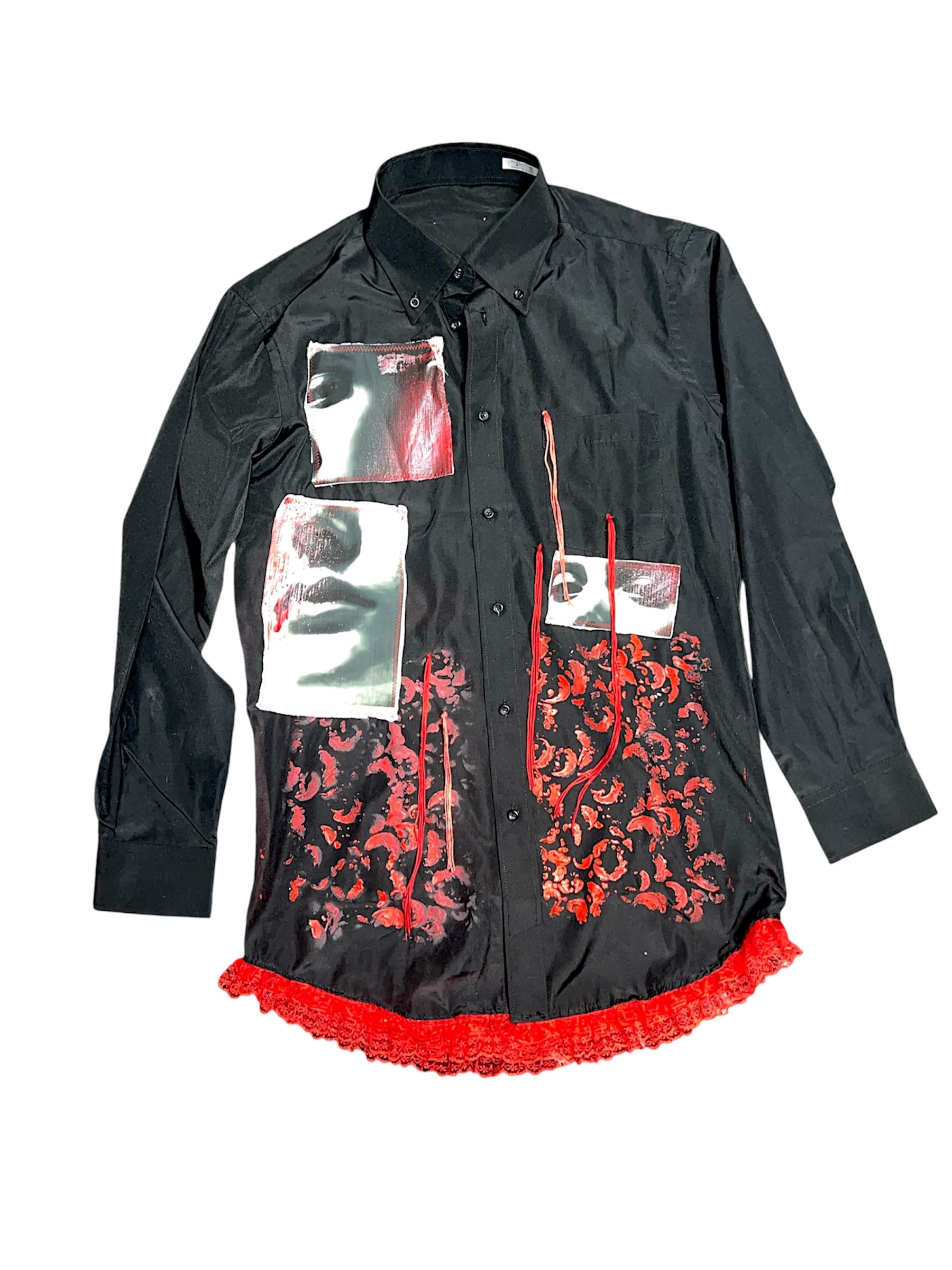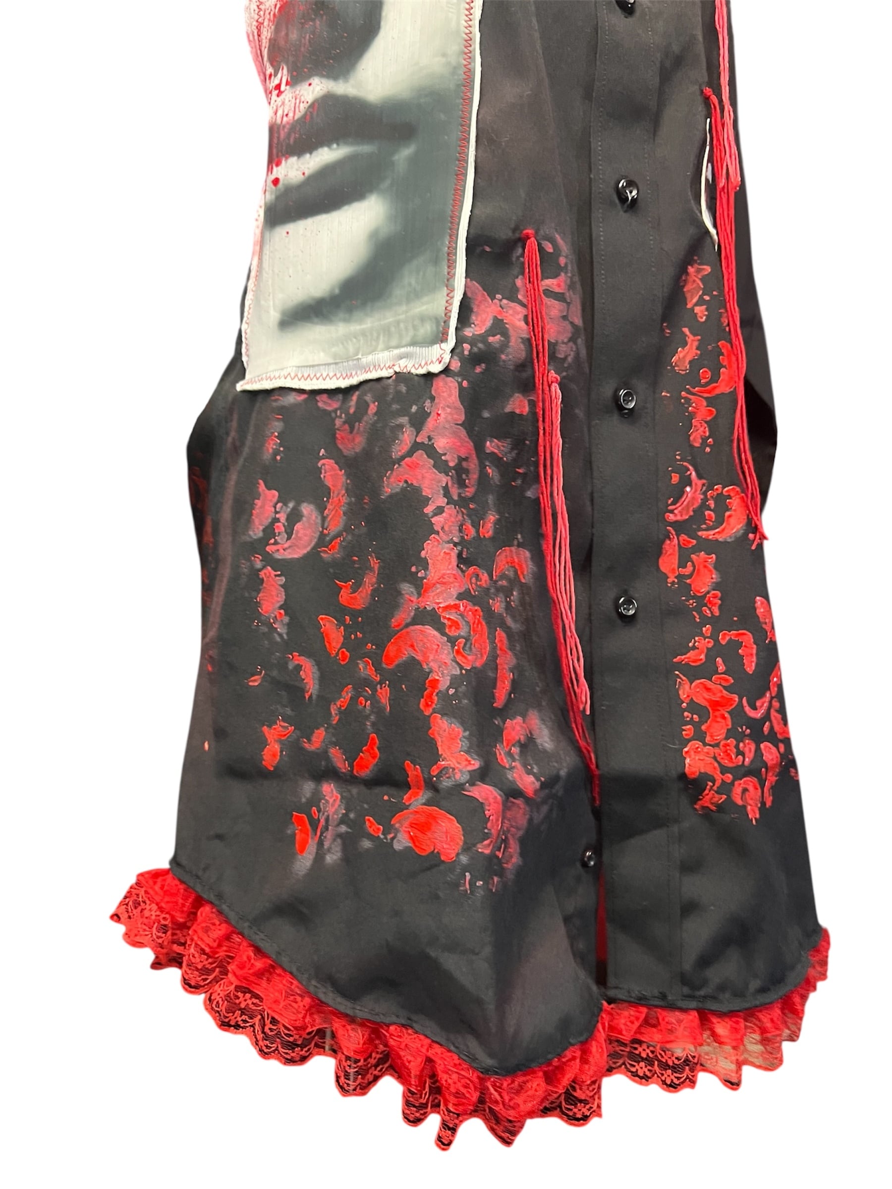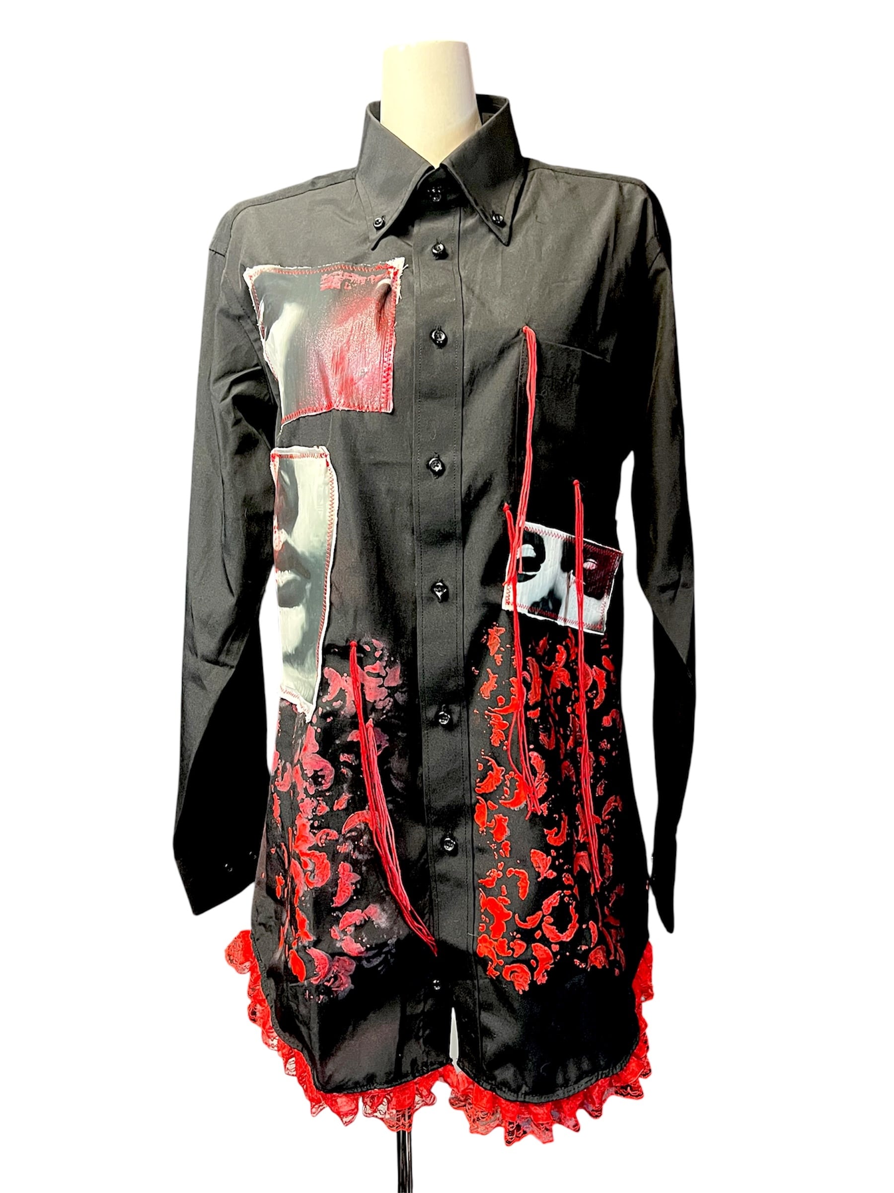 黒の長めのシャツに赤のスプレーアートや刺繍、コラージュ、フリルなどを組み合わせ、ダークでアートな一着に仕立てました。