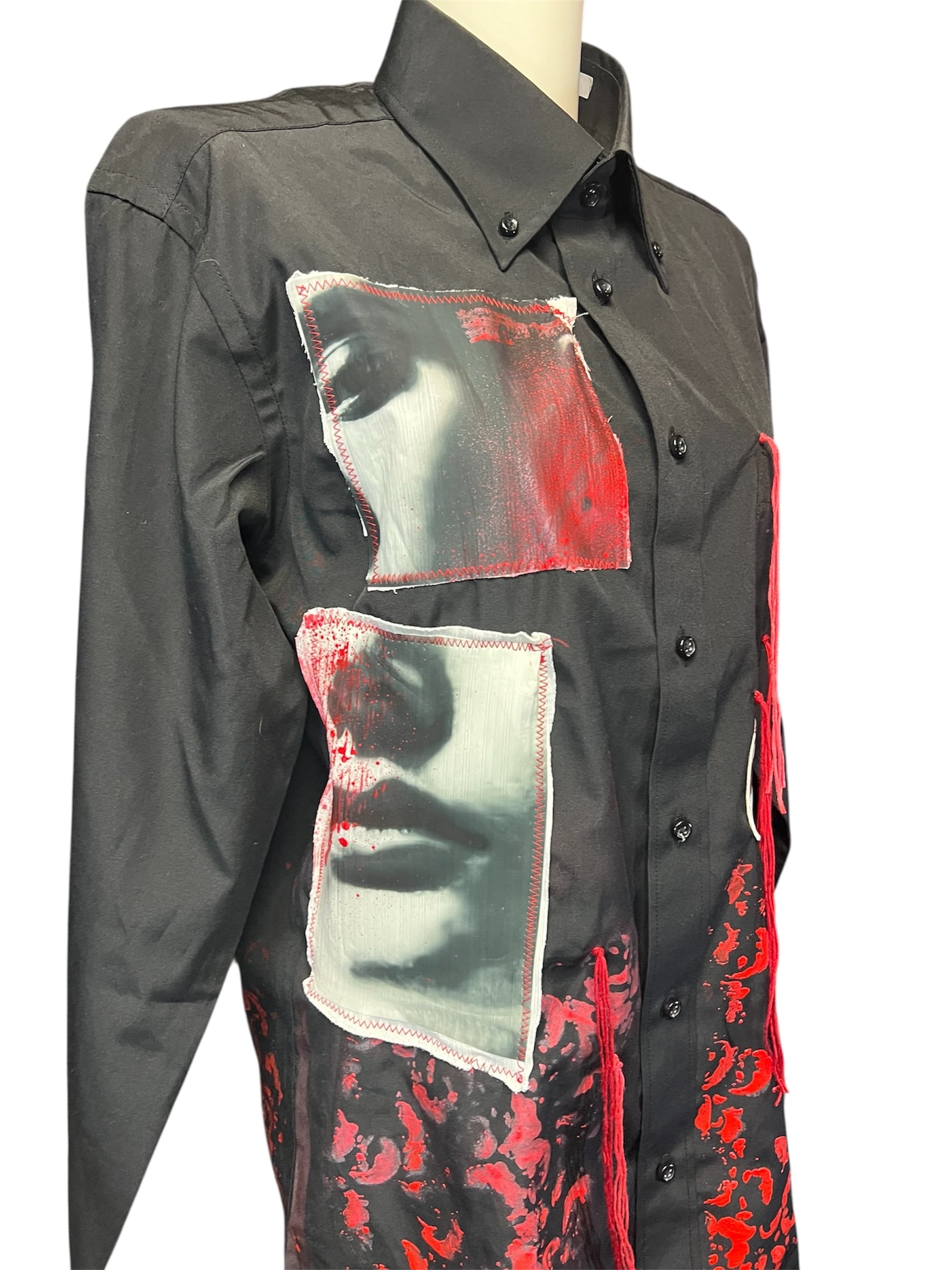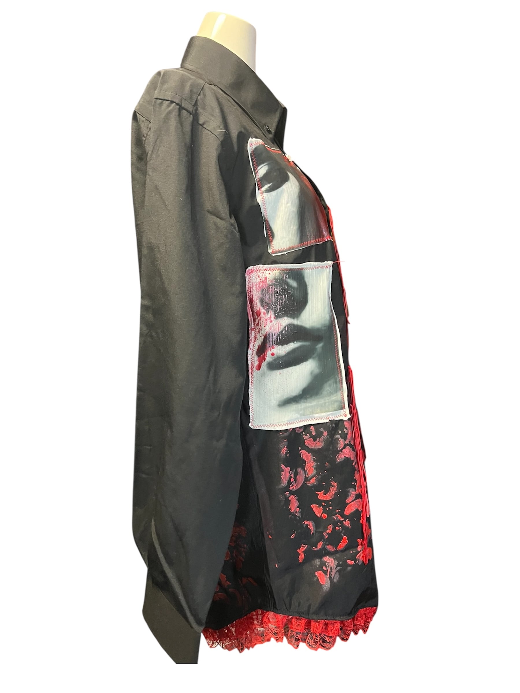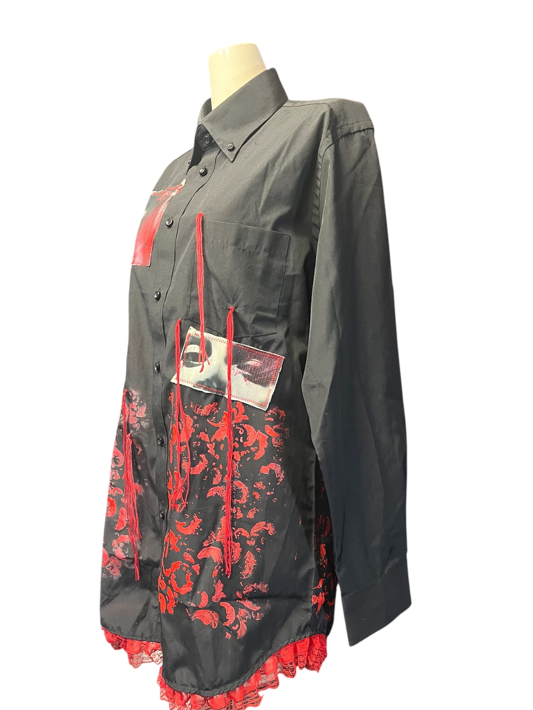 黒の長めのシャツに赤のスプレーアートや刺繍、コラージュ、フリルなどを組み合わせ、ダークでアートな一着に仕立てました。