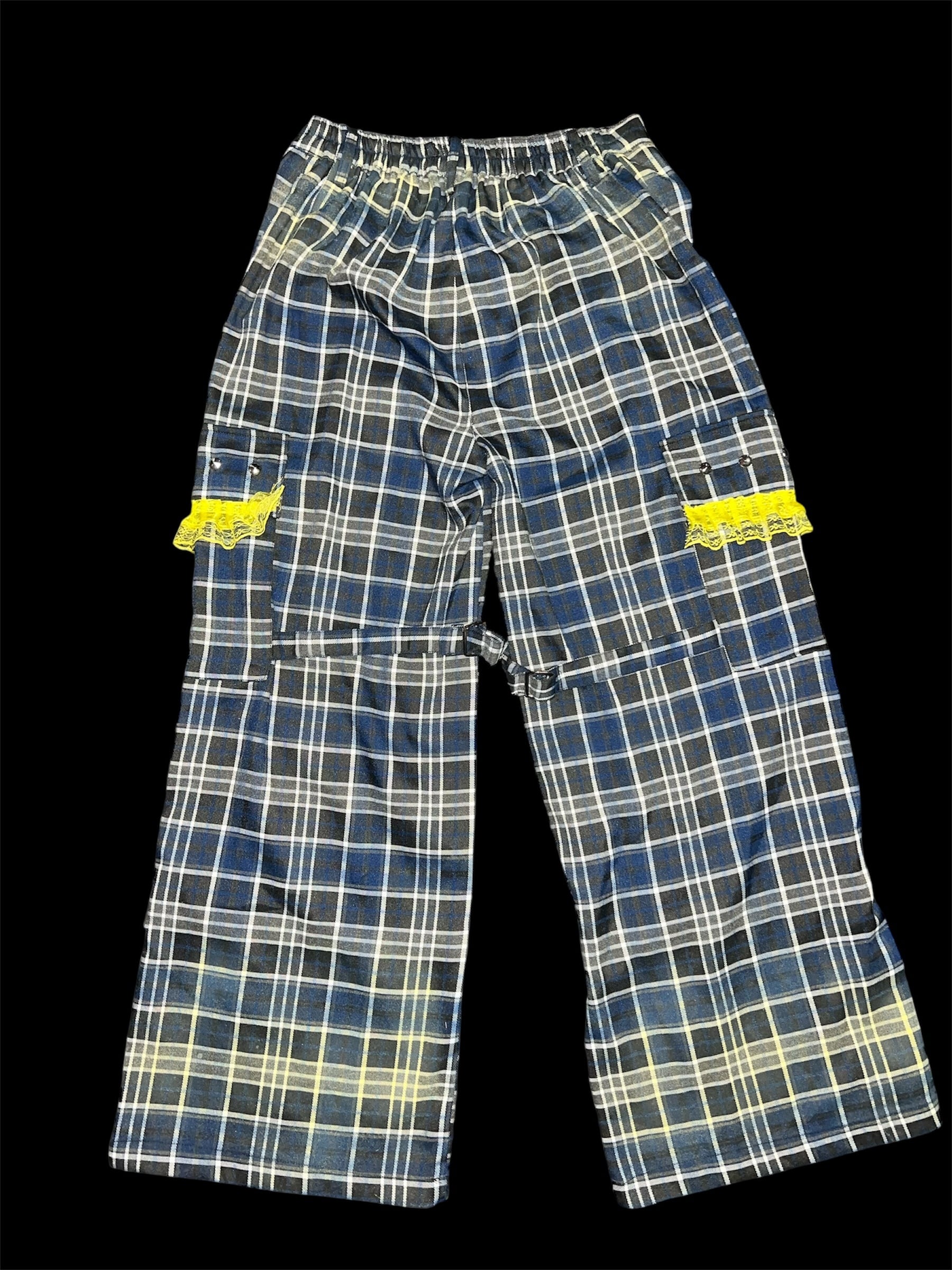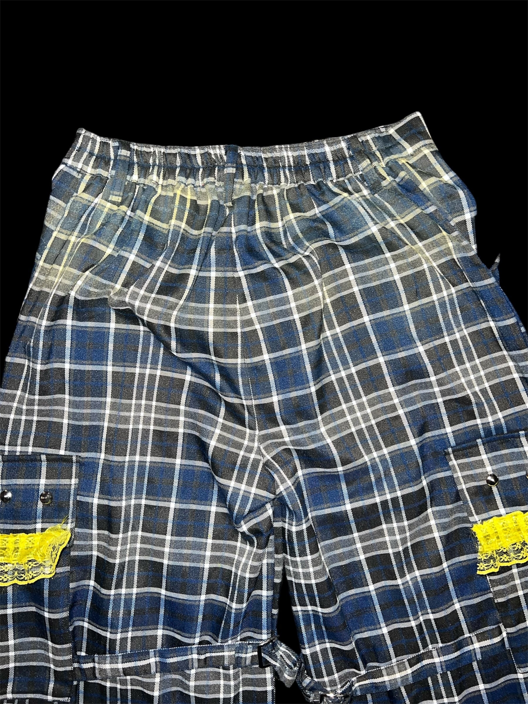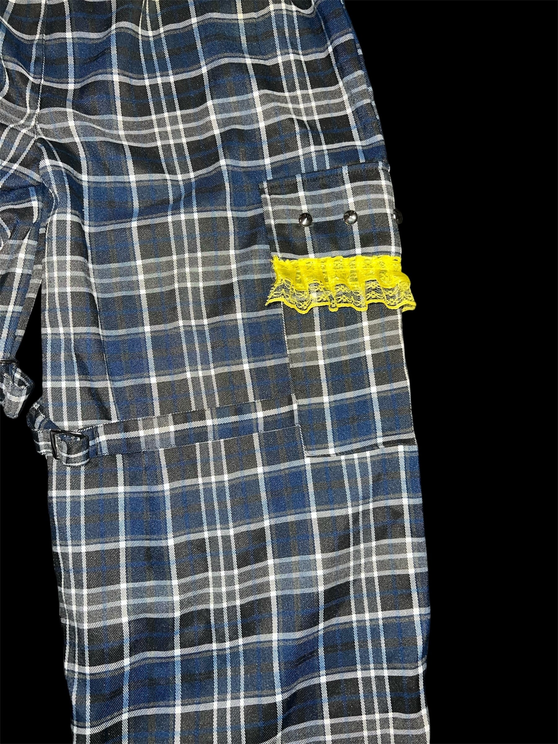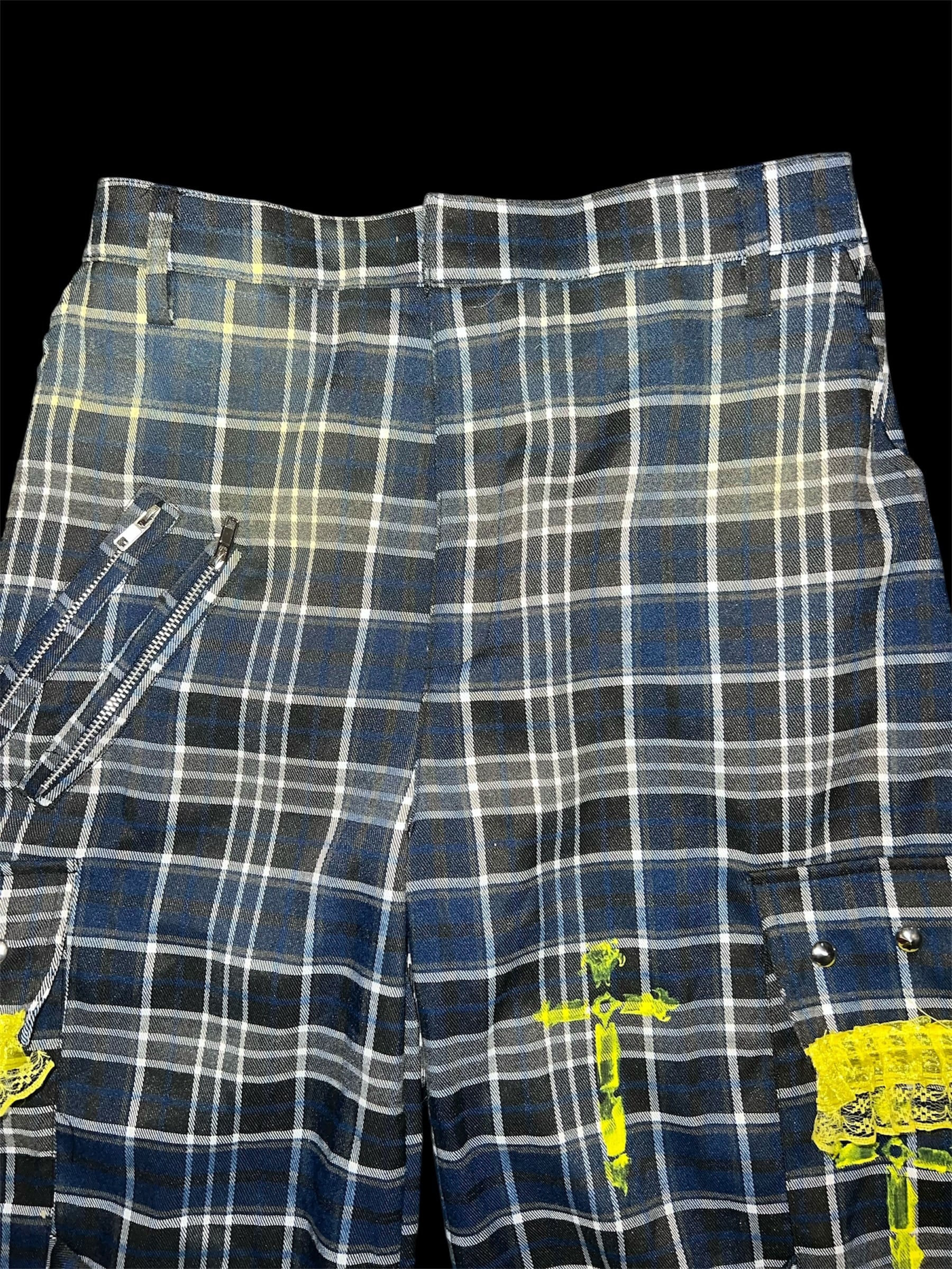チェックベースに、イエローのグラデーション加工と金具装飾を加えたリメイクパンツです。