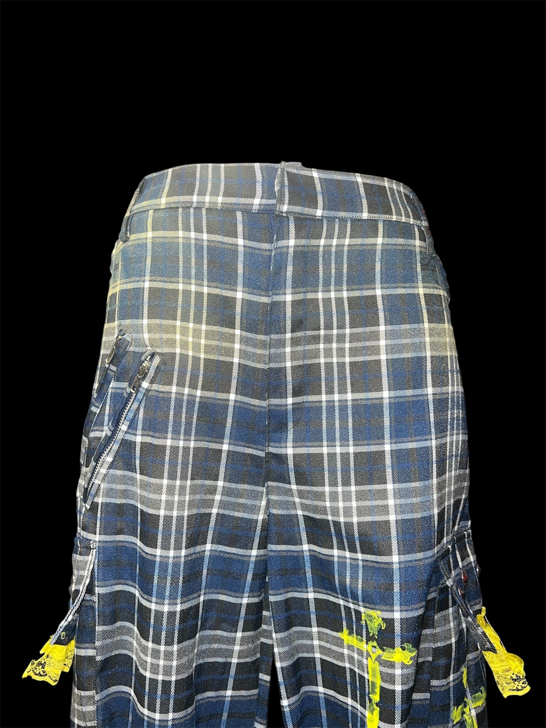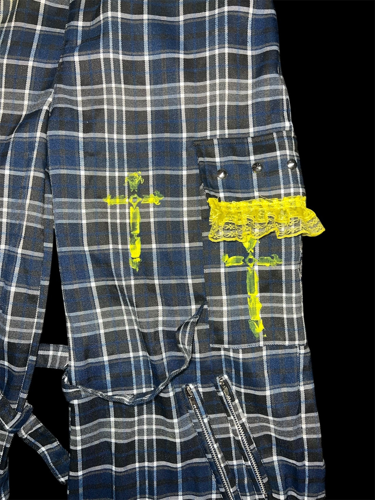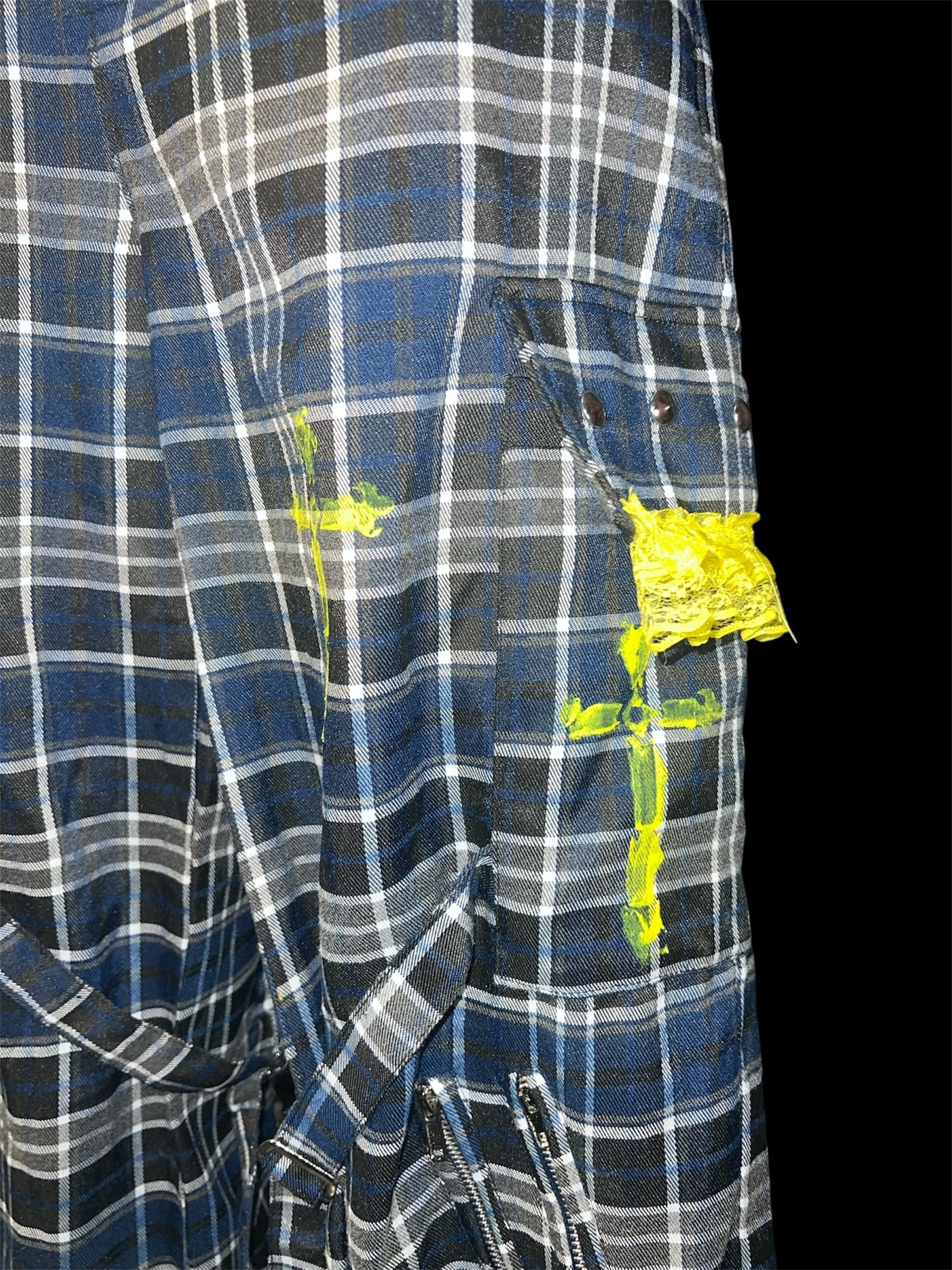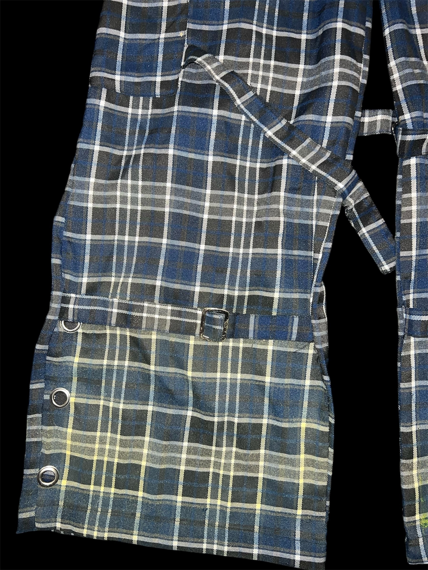 チェックベースに、イエローのグラデーション加工と金具装飾を加えたリメイクパンツです。