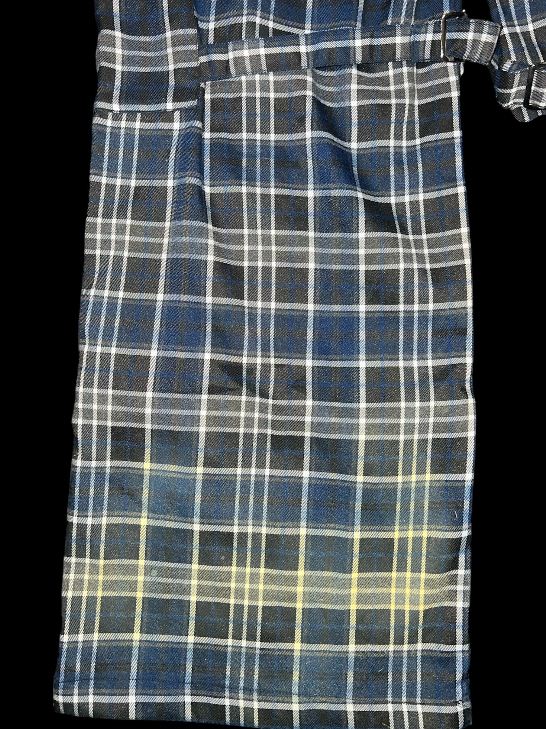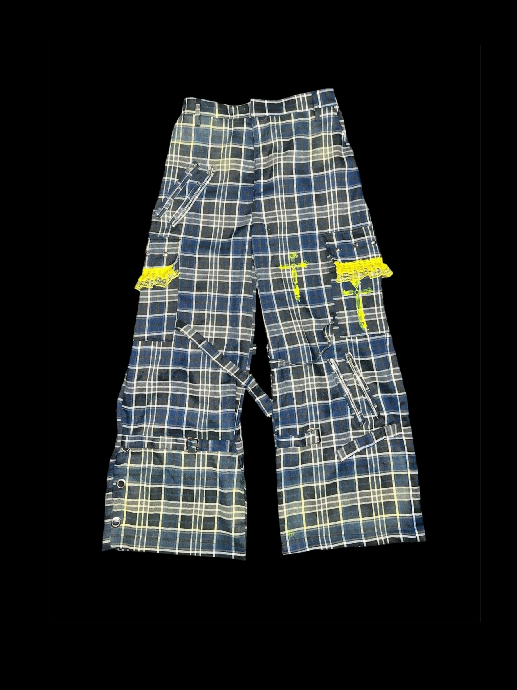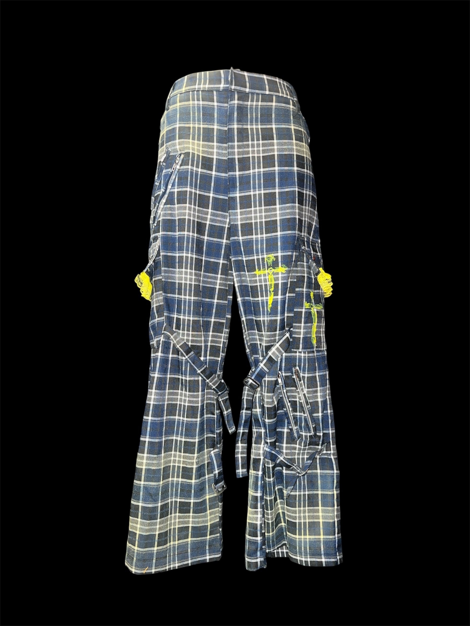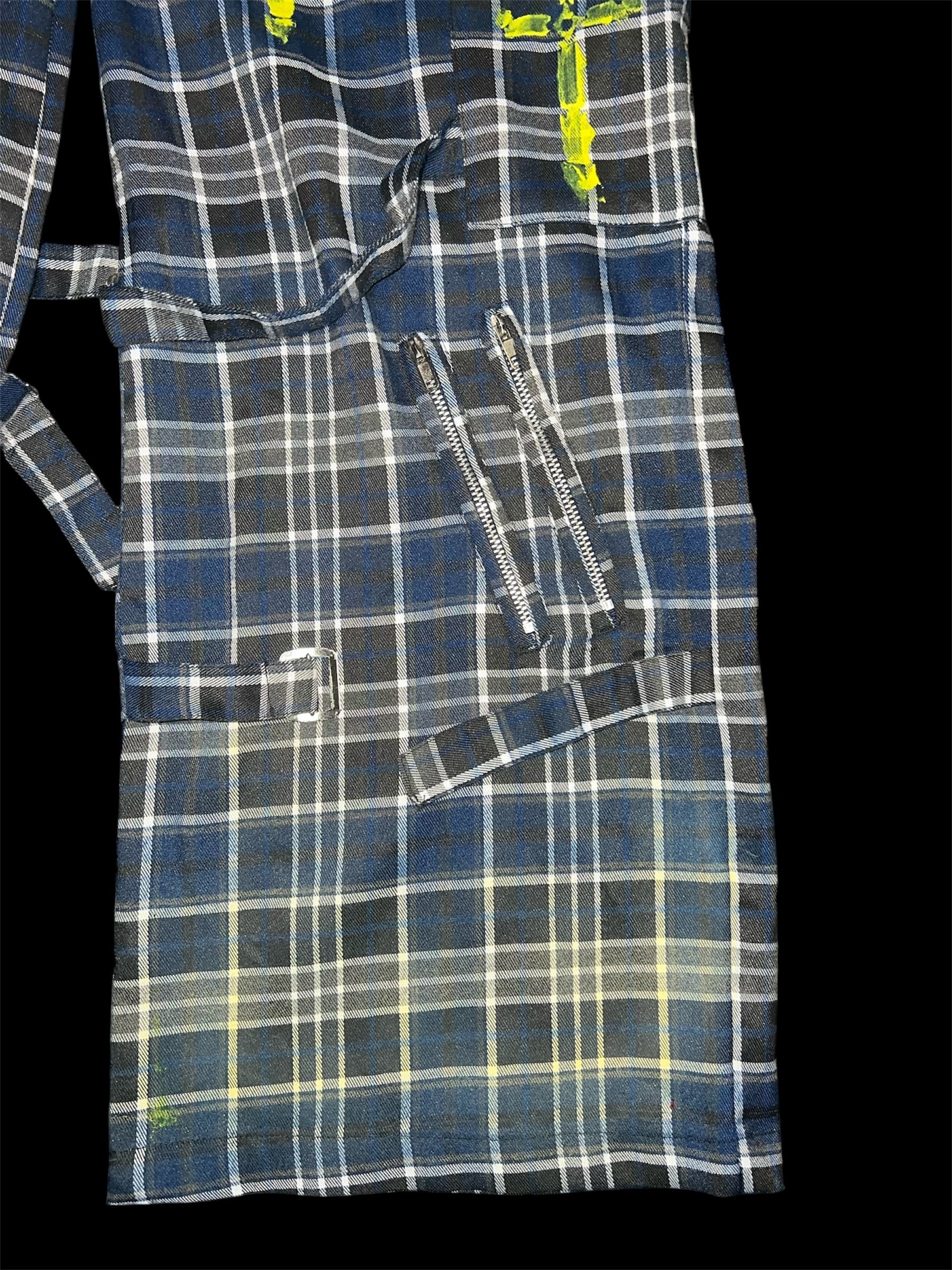 チェックベースに、イエローのグラデーション加工と金具装飾を加えたリメイクパンツです。