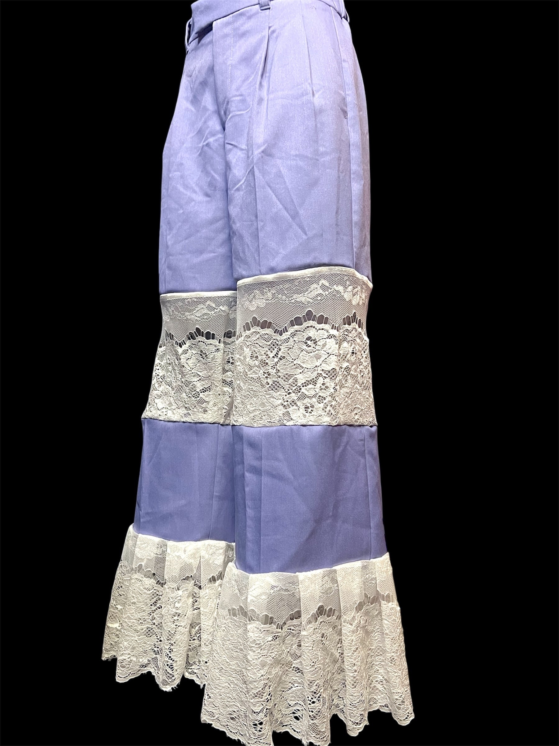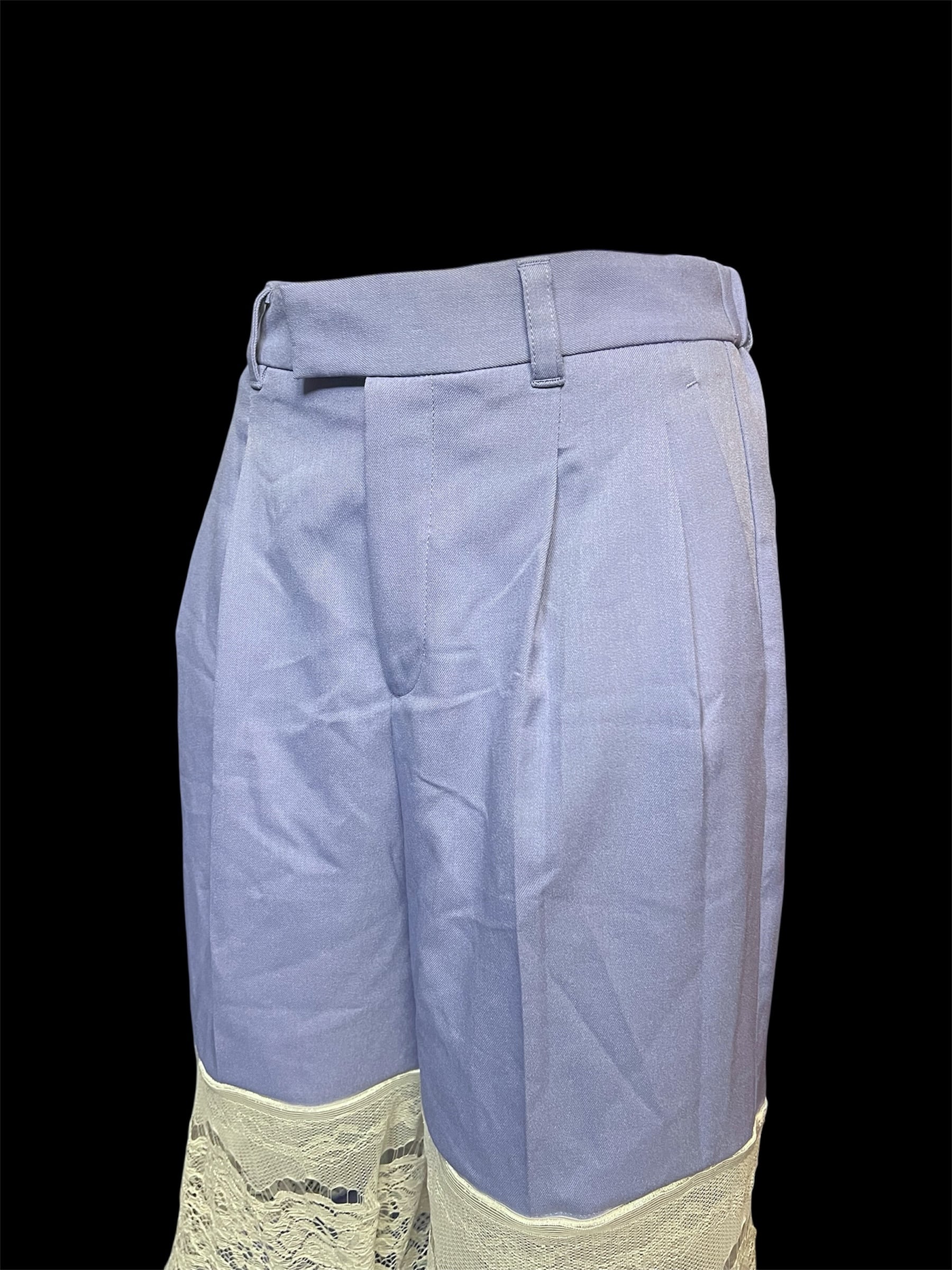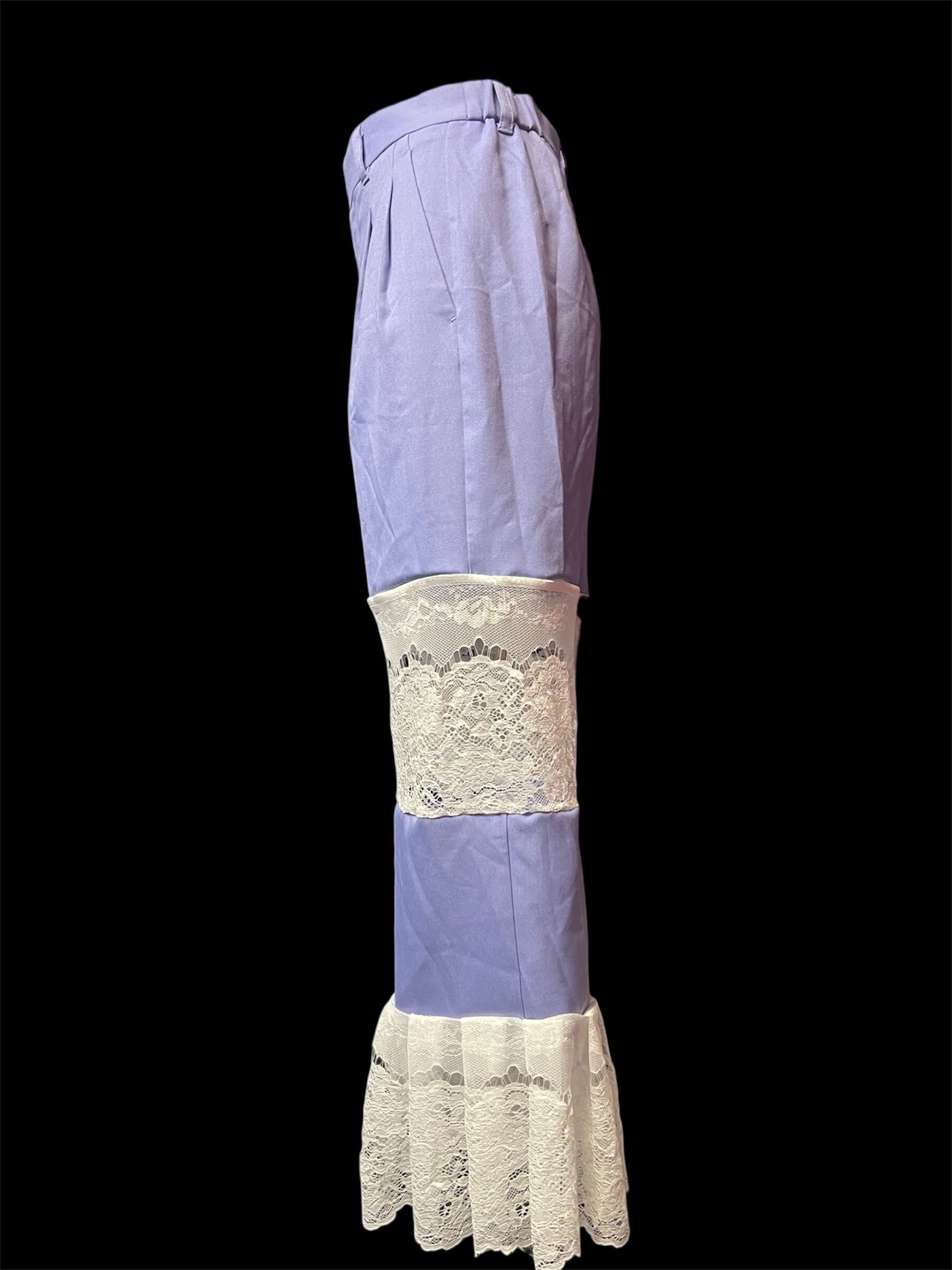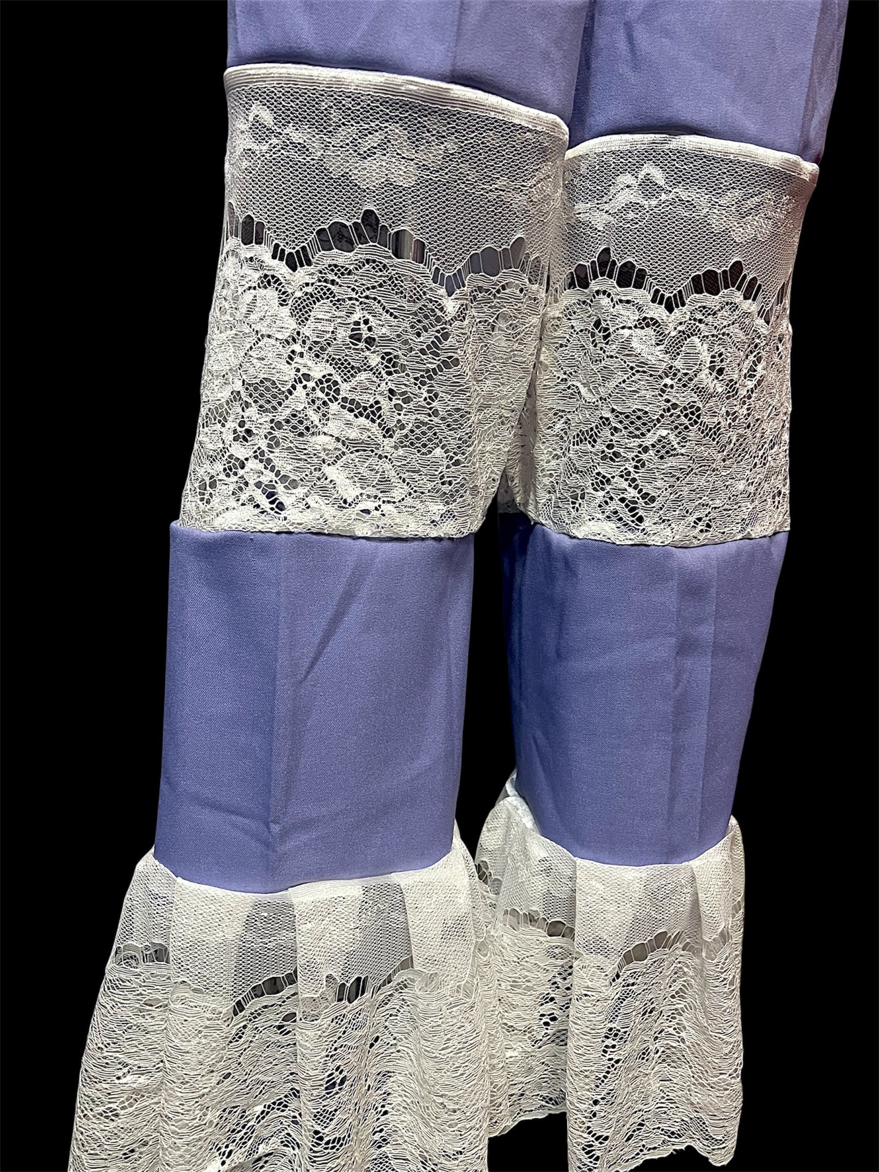 淡いラベンダーカラーのパンツに、膝上と裾部分へホワイトレースを切り替えています。