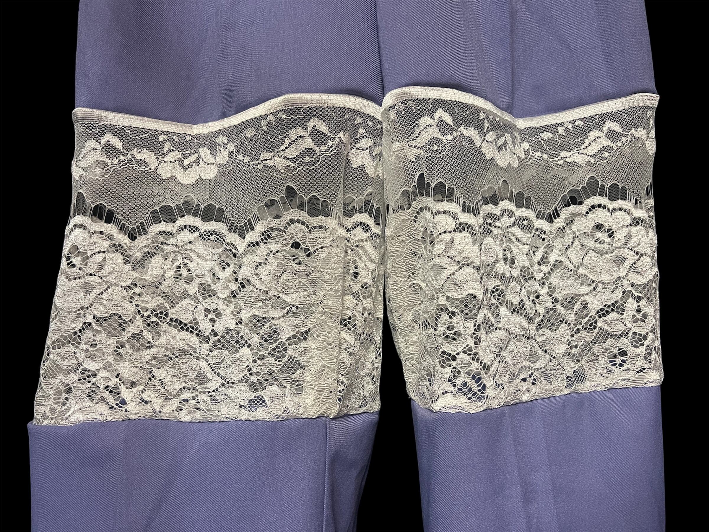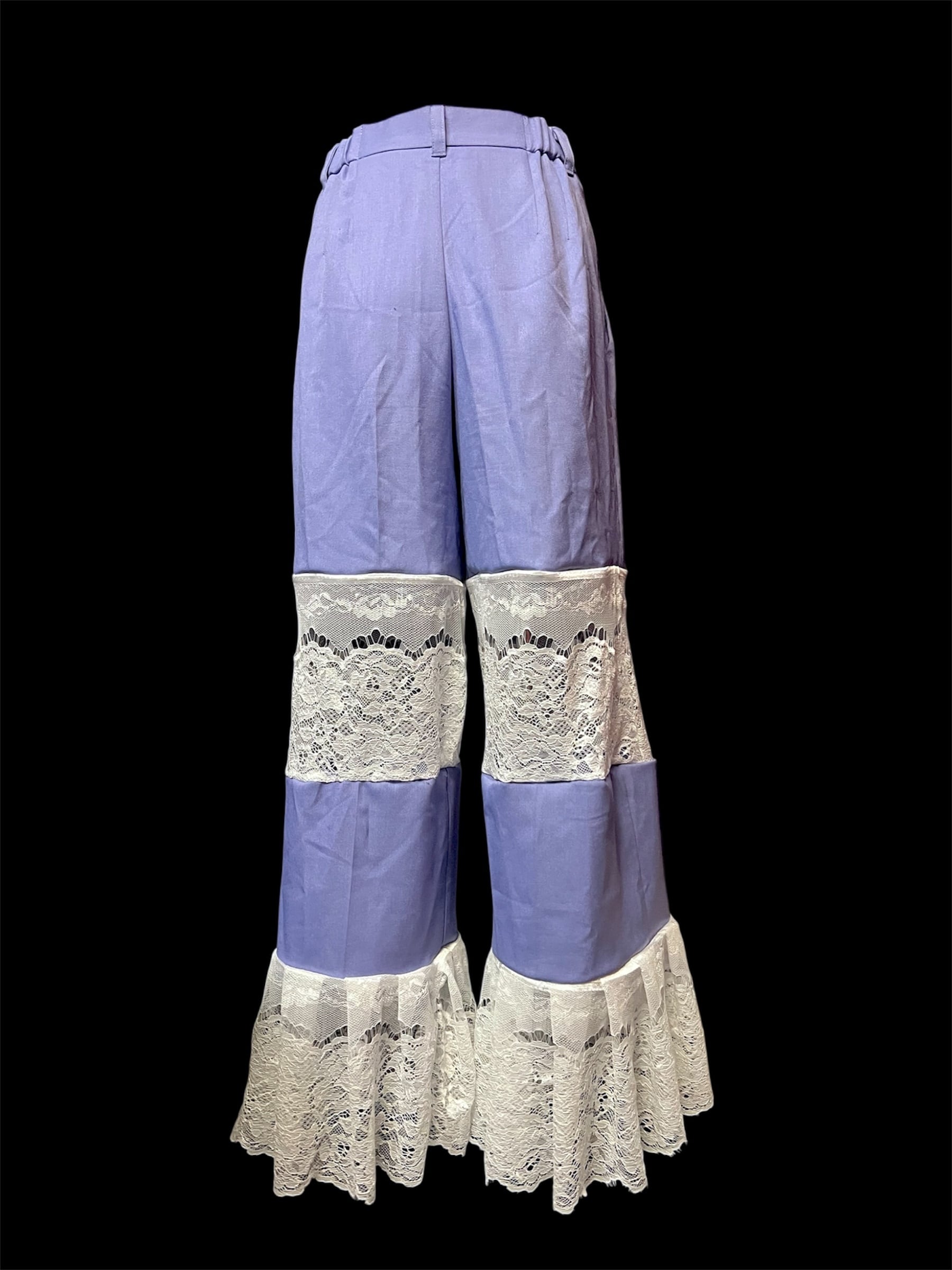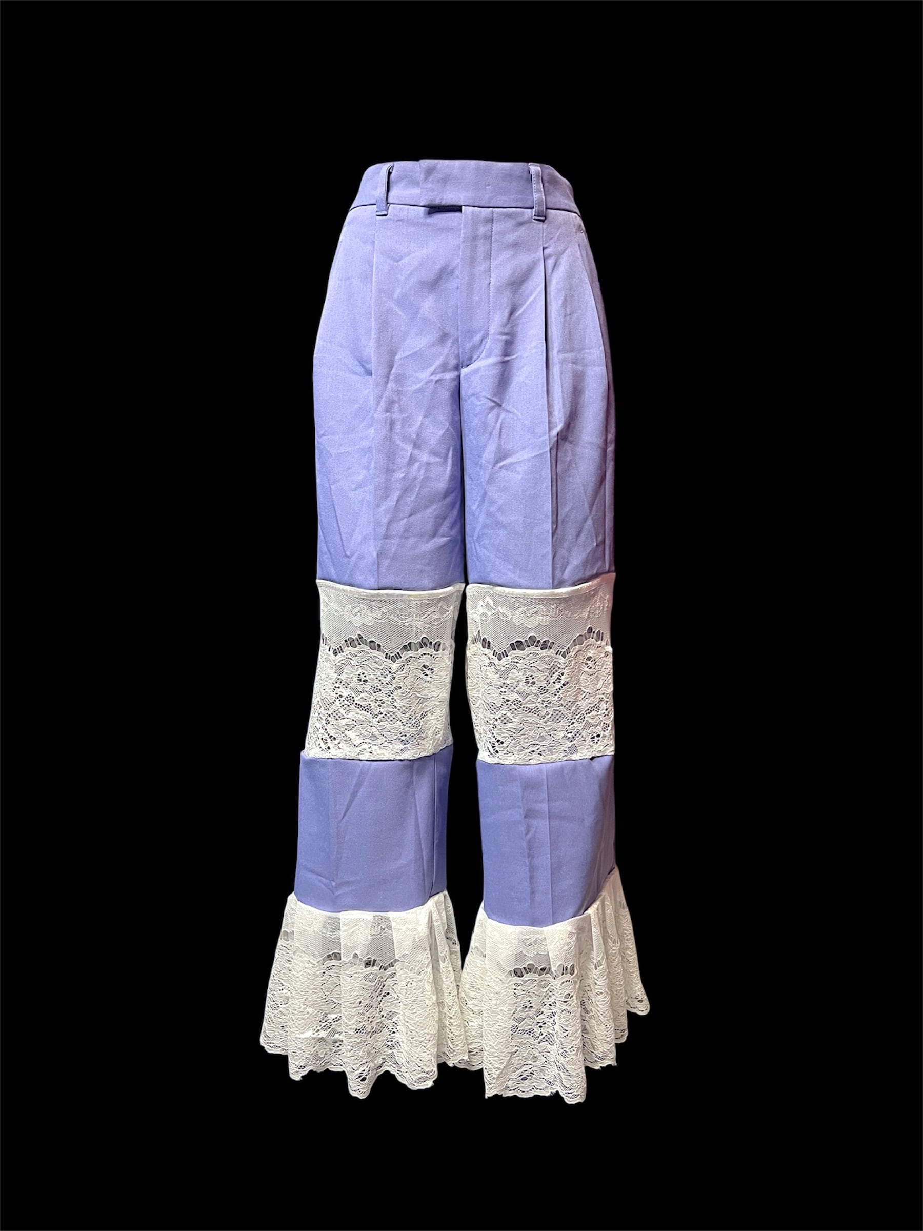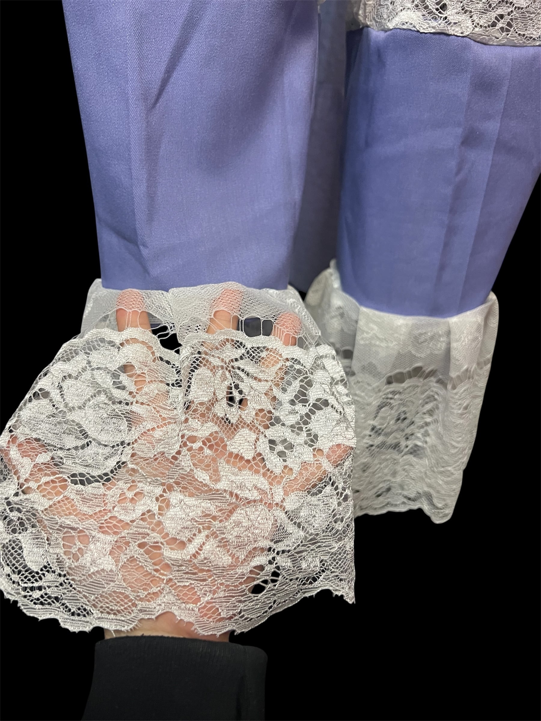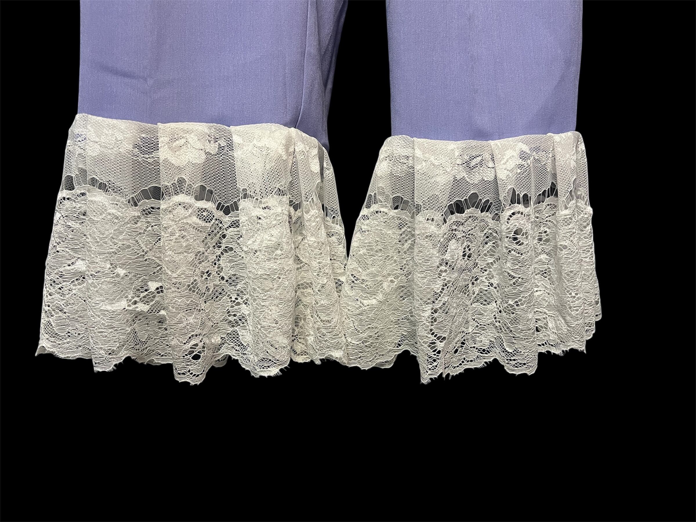 淡いラベンダーカラーのパンツに、膝上と裾部分へホワイトレースを切り替えています。