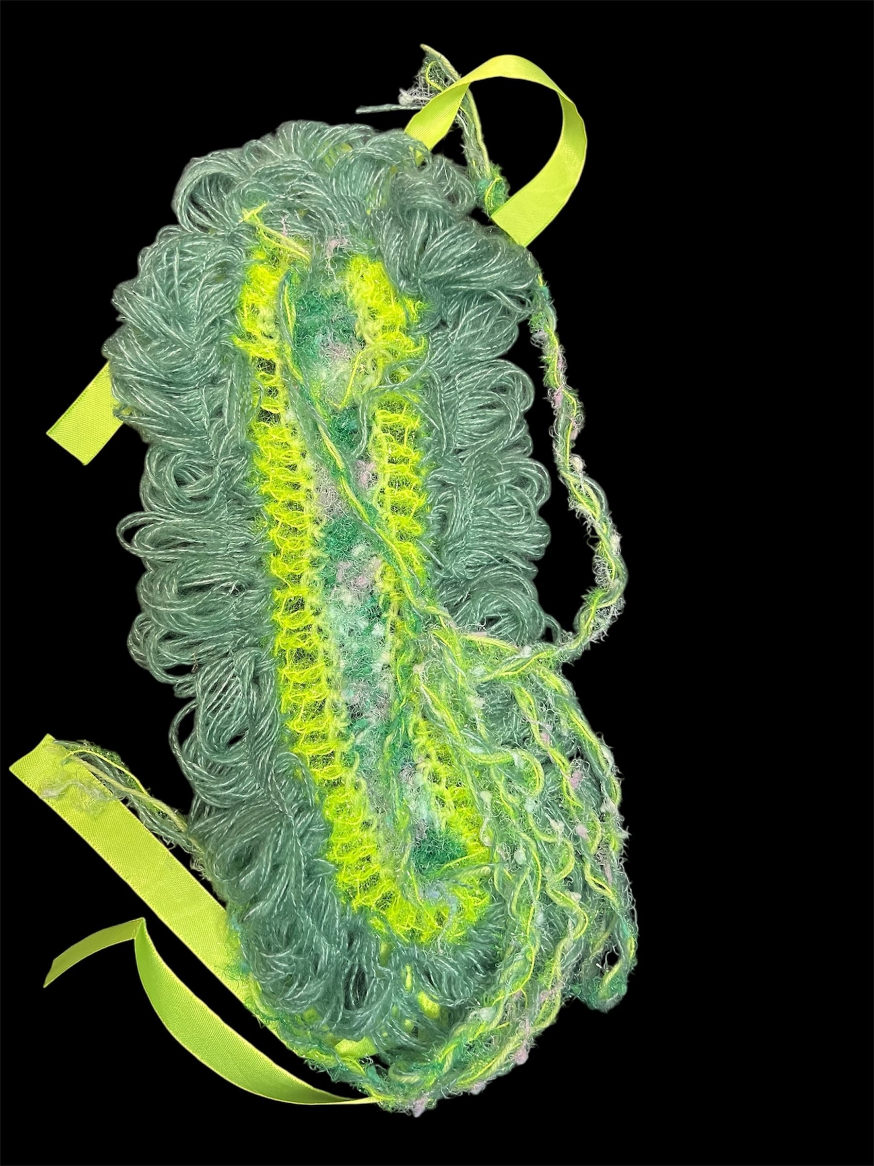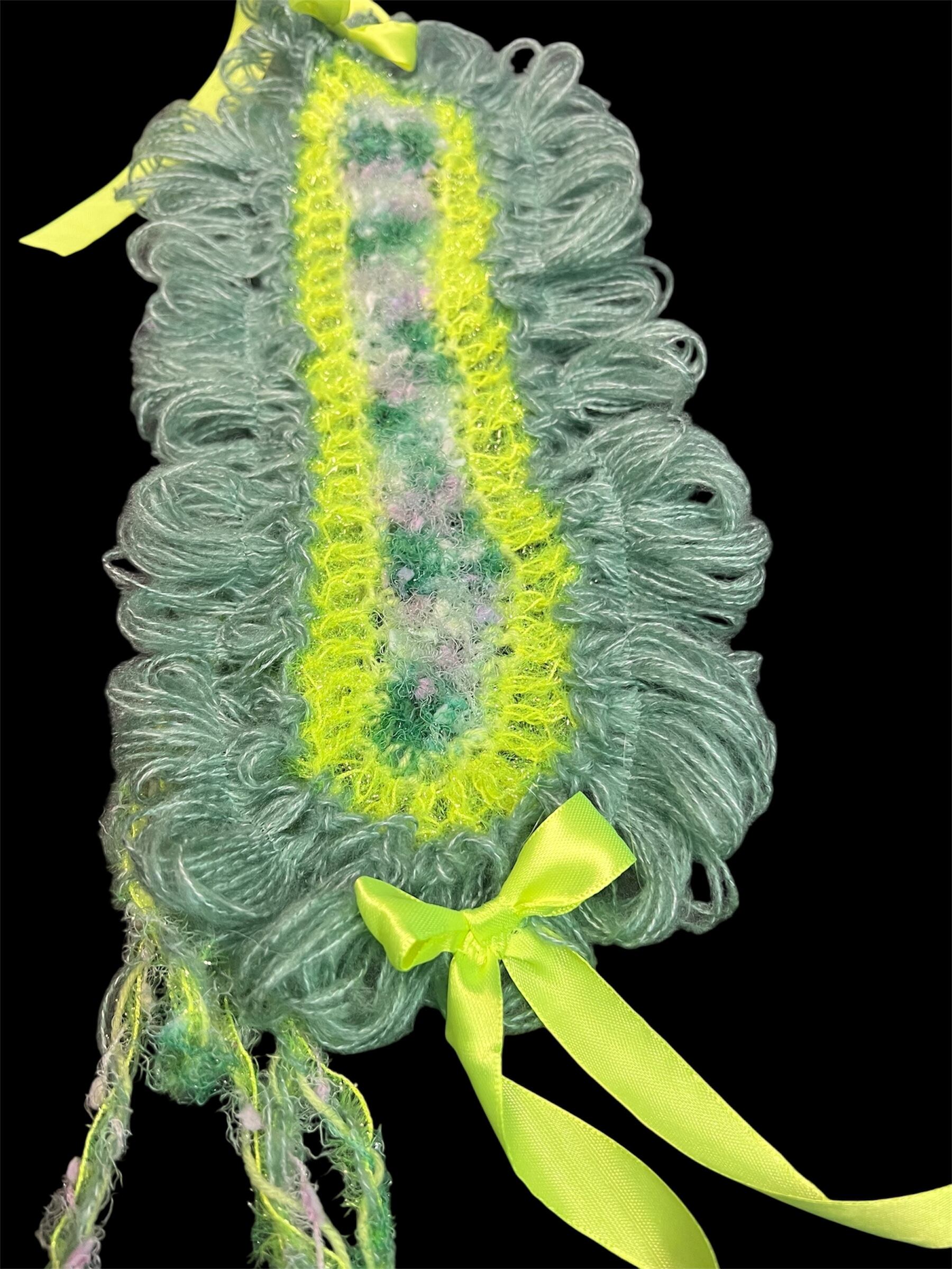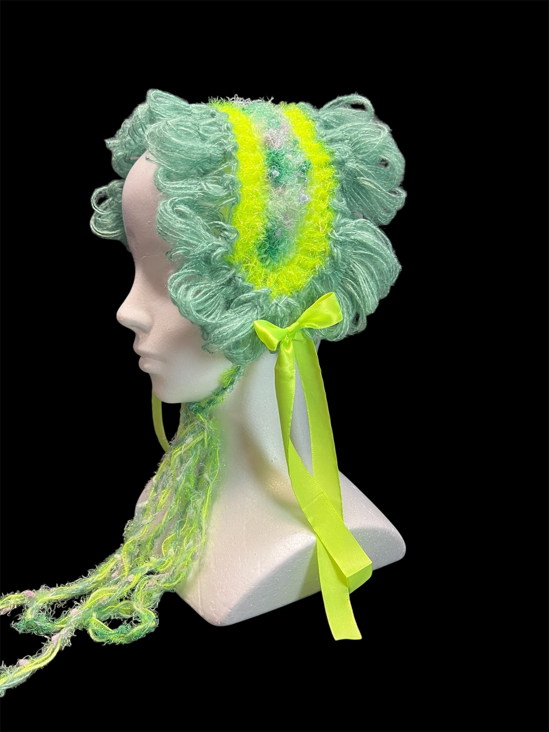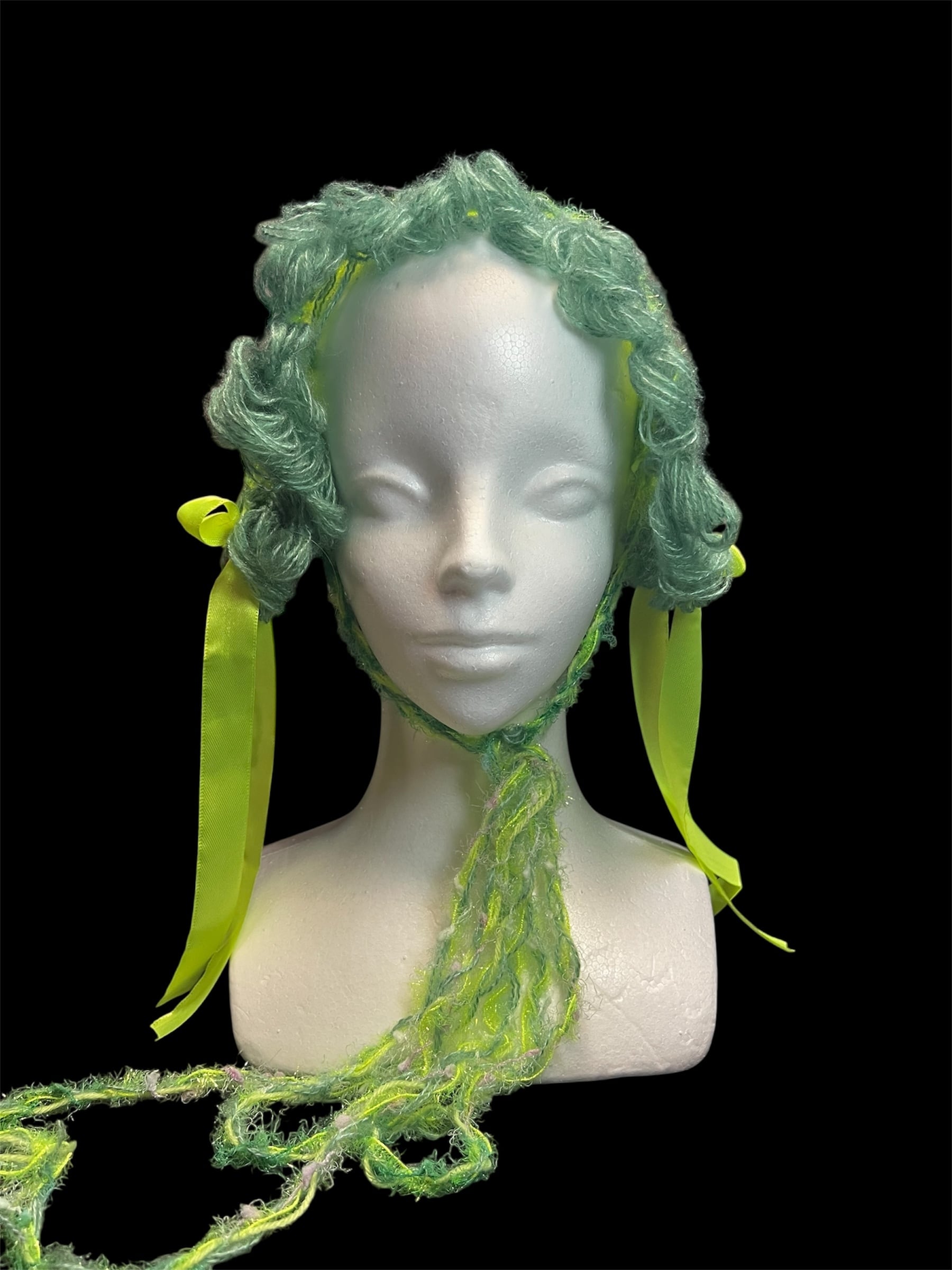 緑系の毛糸をミックスしたヘッドドレスです。異なる糸の質感で立体感を出しています。長めのサテンリボン付きです。