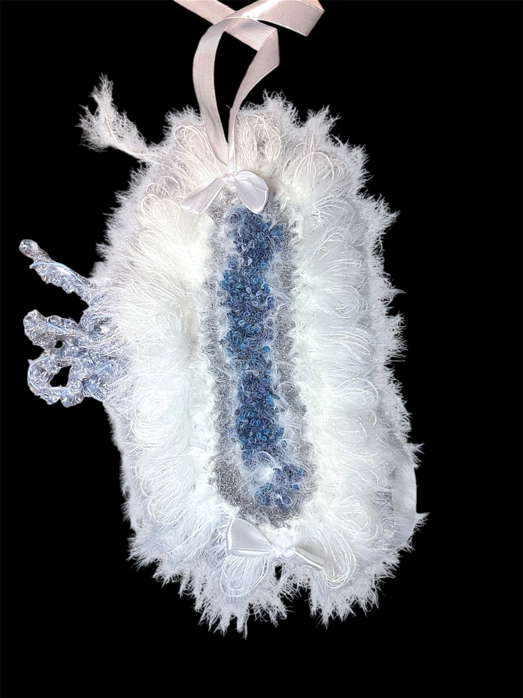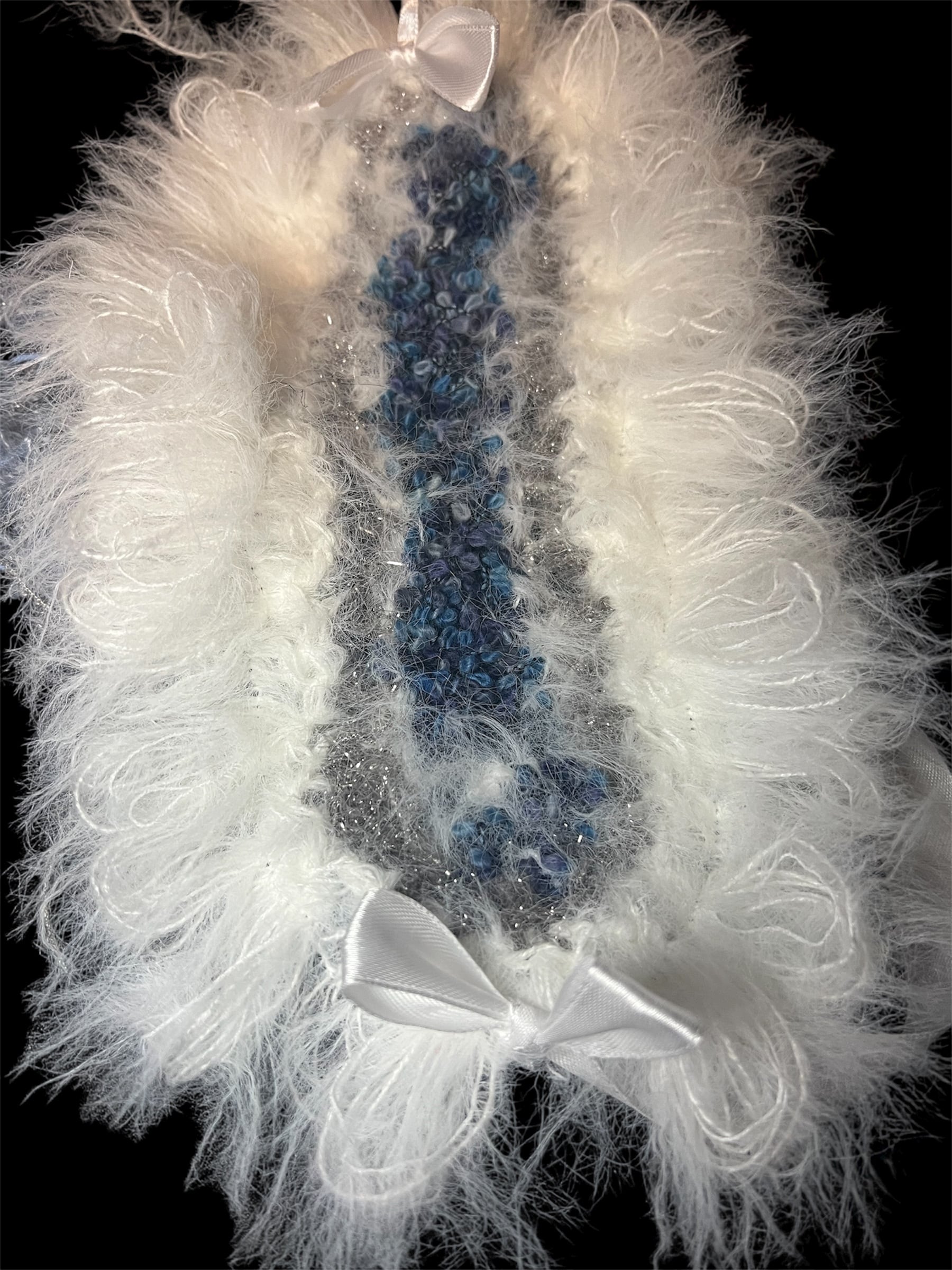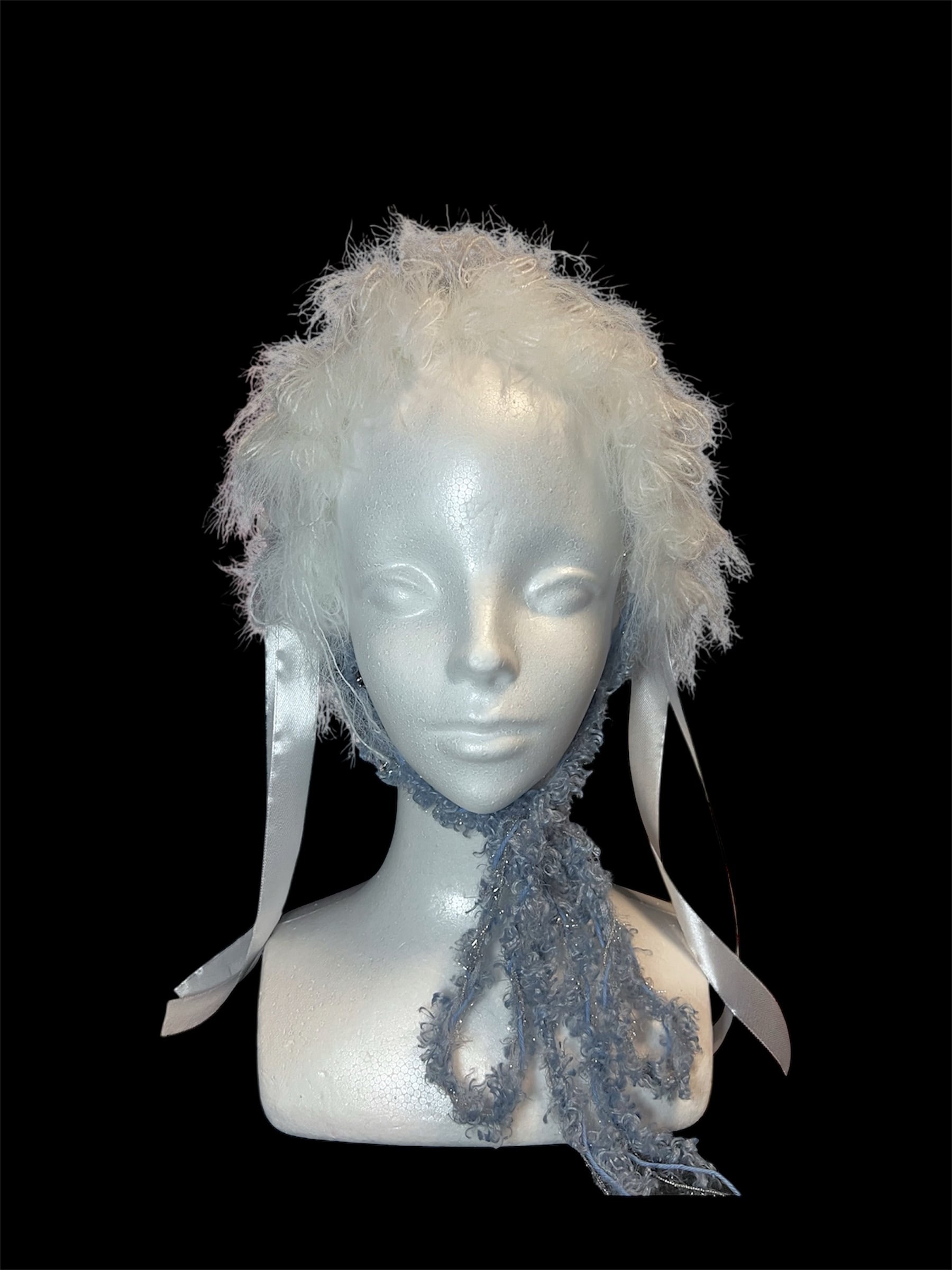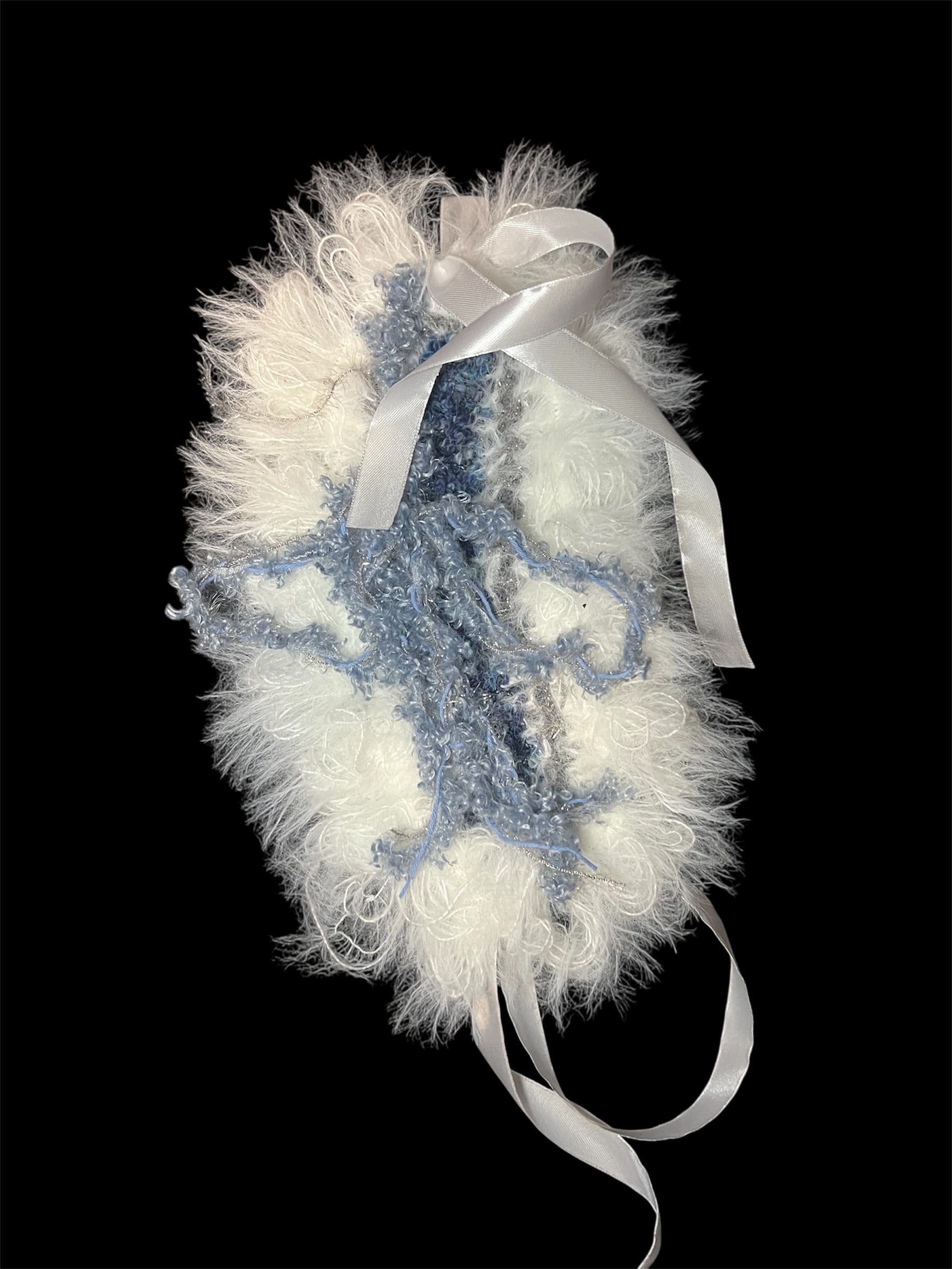 水色やふわふわの白いの毛糸をミックスしたヘッドドレスです。異なる糸の質感で立体感を出しています。長めのサテンリボン付きです。 36×17 (cm) ・ハンドメイド商品になります。ご理解のある方のみご購入くださいませ。 ・返品交換等受け付けておりません。ご了承くださいませ。 他の商品 #Humoff