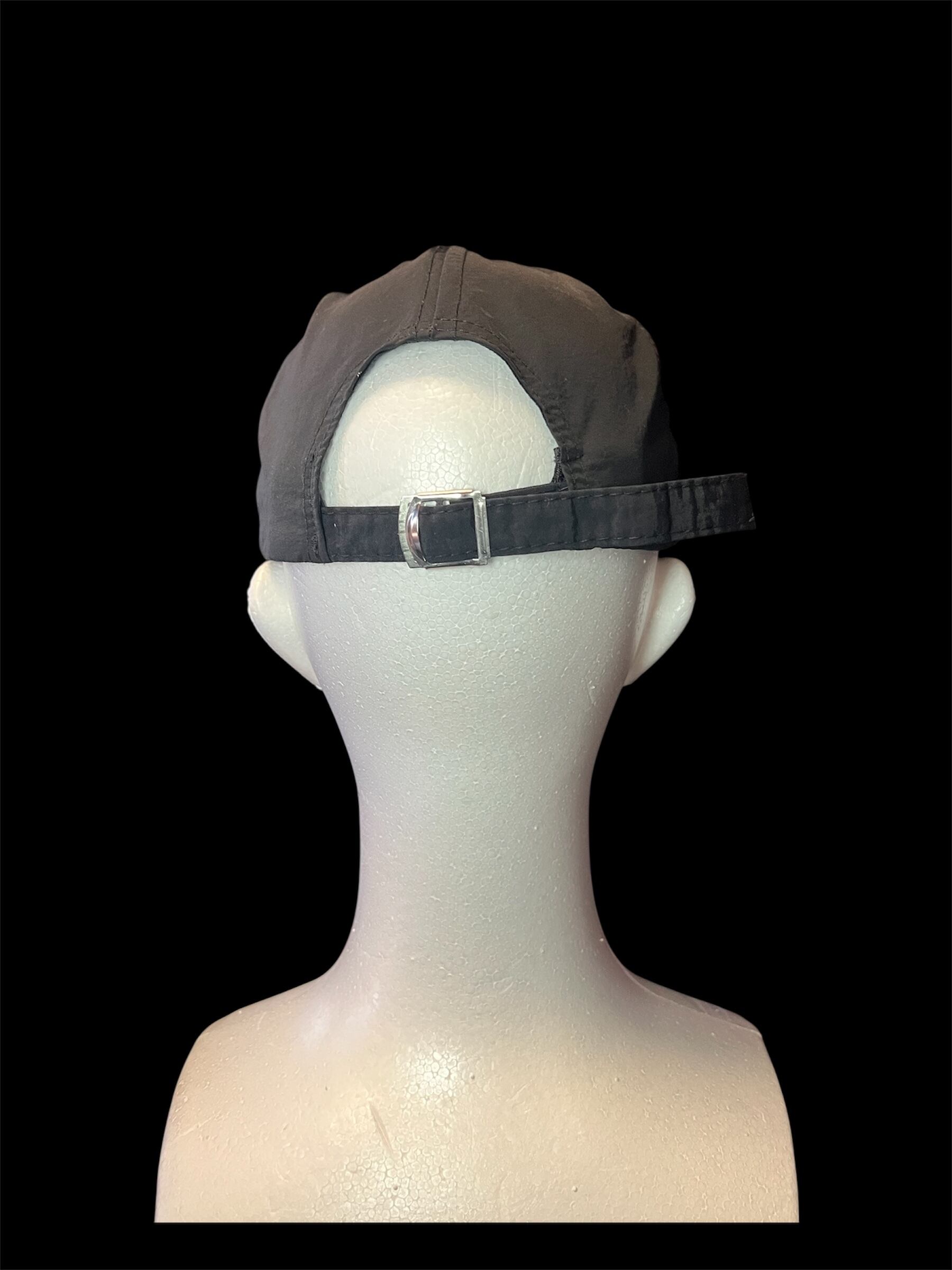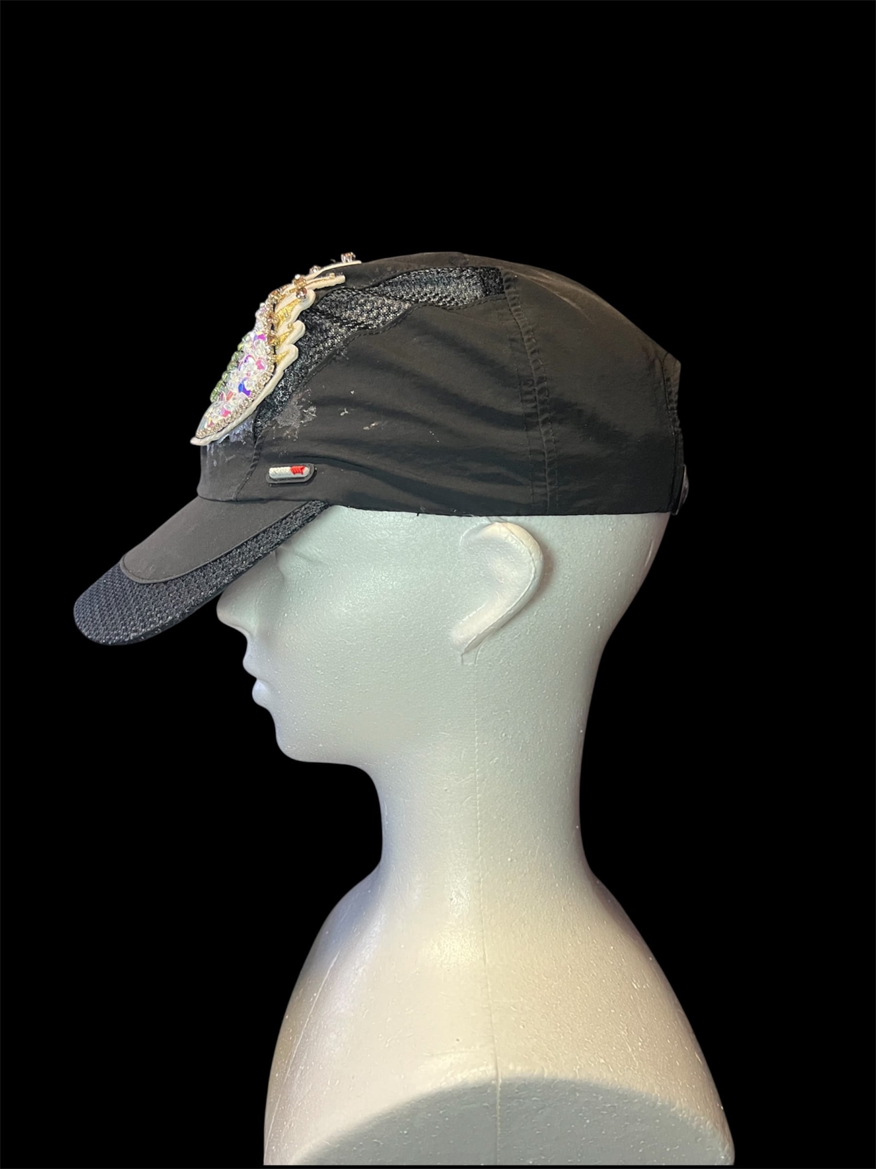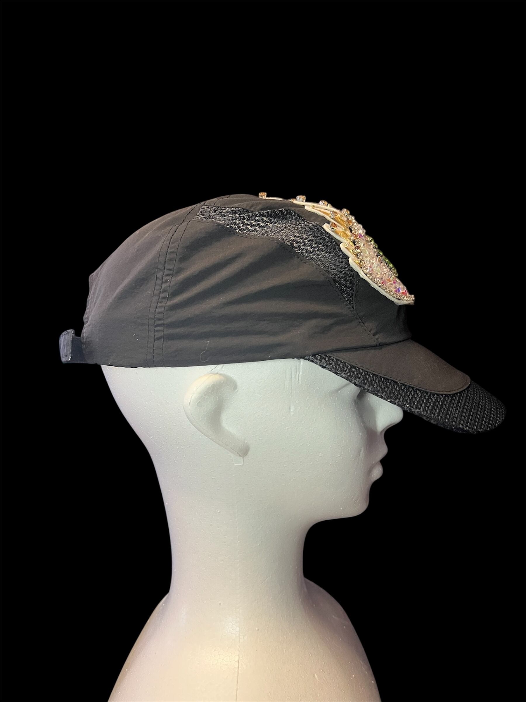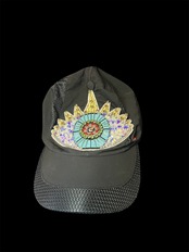 ブラックキャップに存在感のあるビーズ刺繍ワッペンを配置したデザイン。