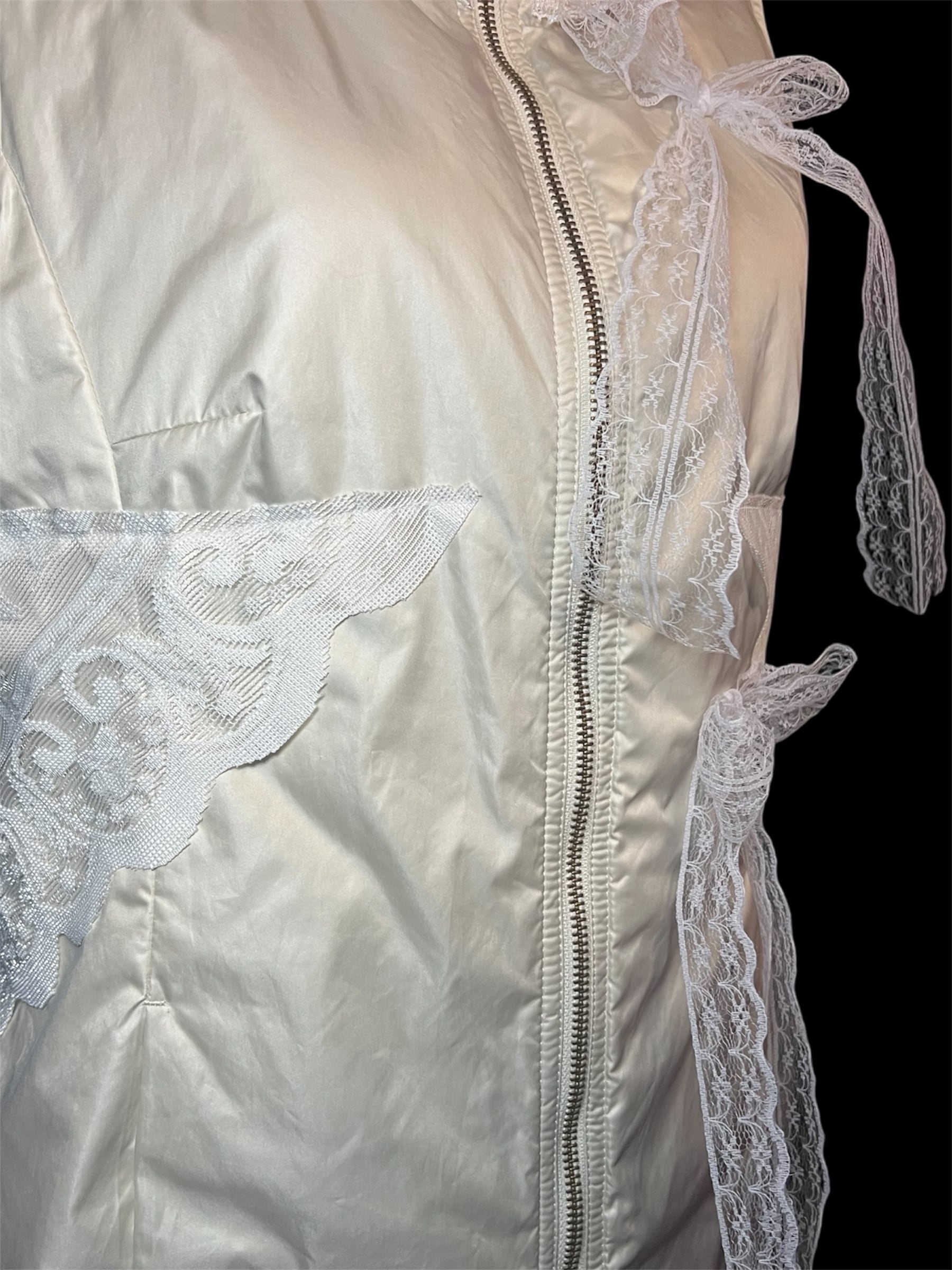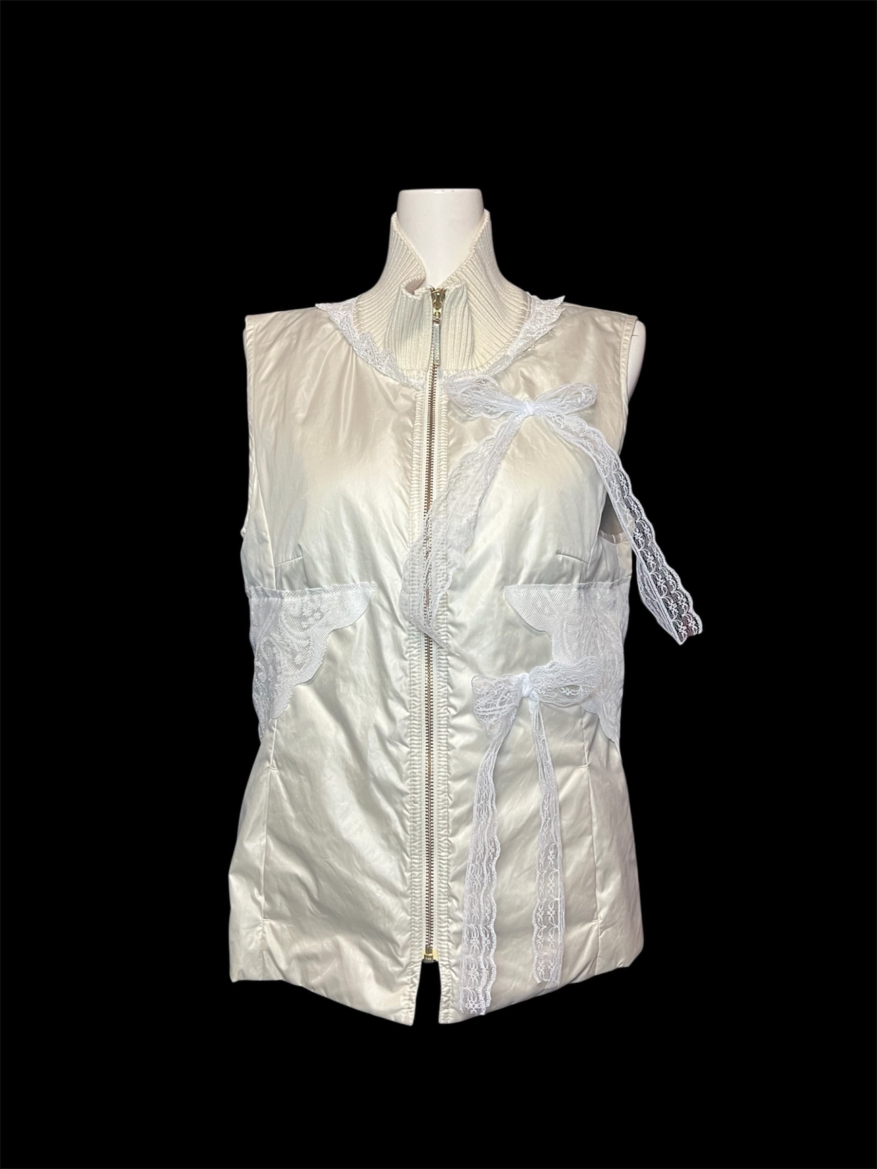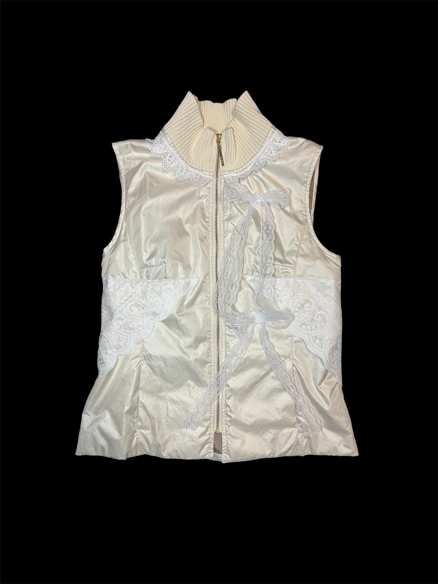 光沢感のあるアイボリーベースにレースラインを施したジップベスト。