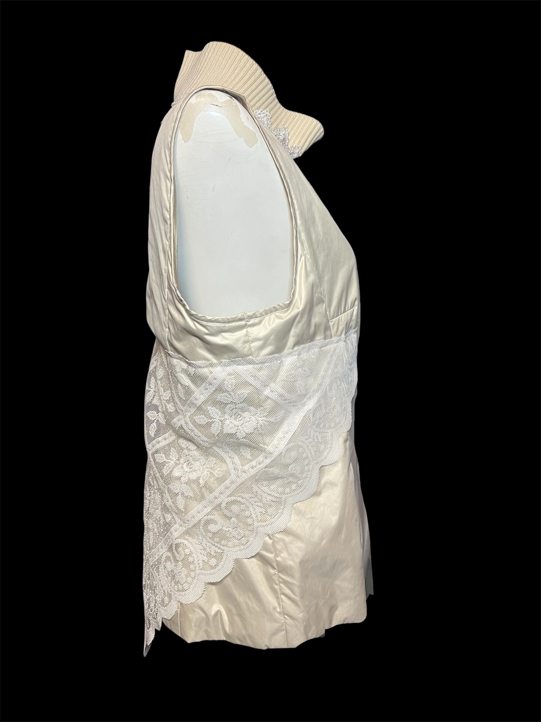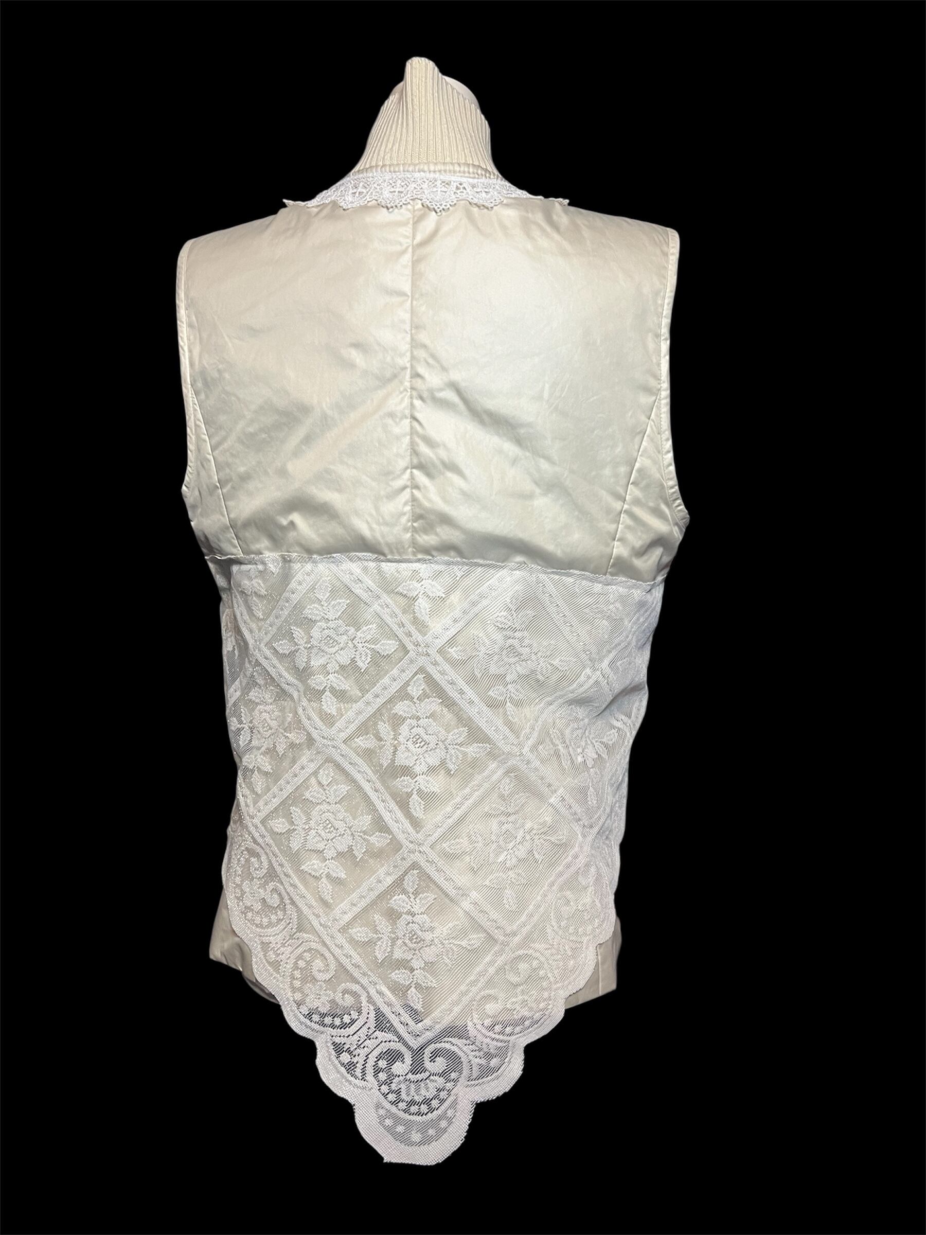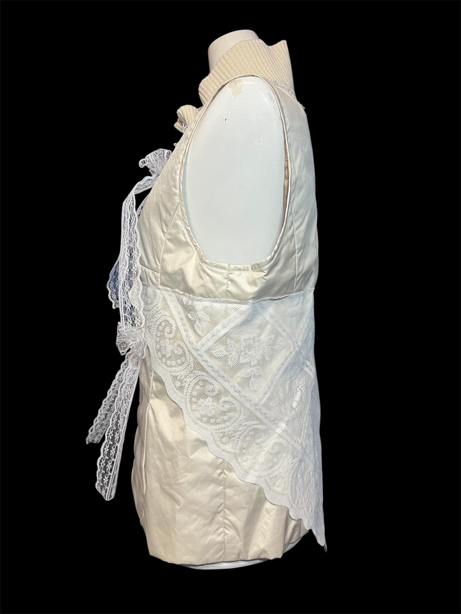 光沢感のあるアイボリーベースにレースラインを施したジップベスト。