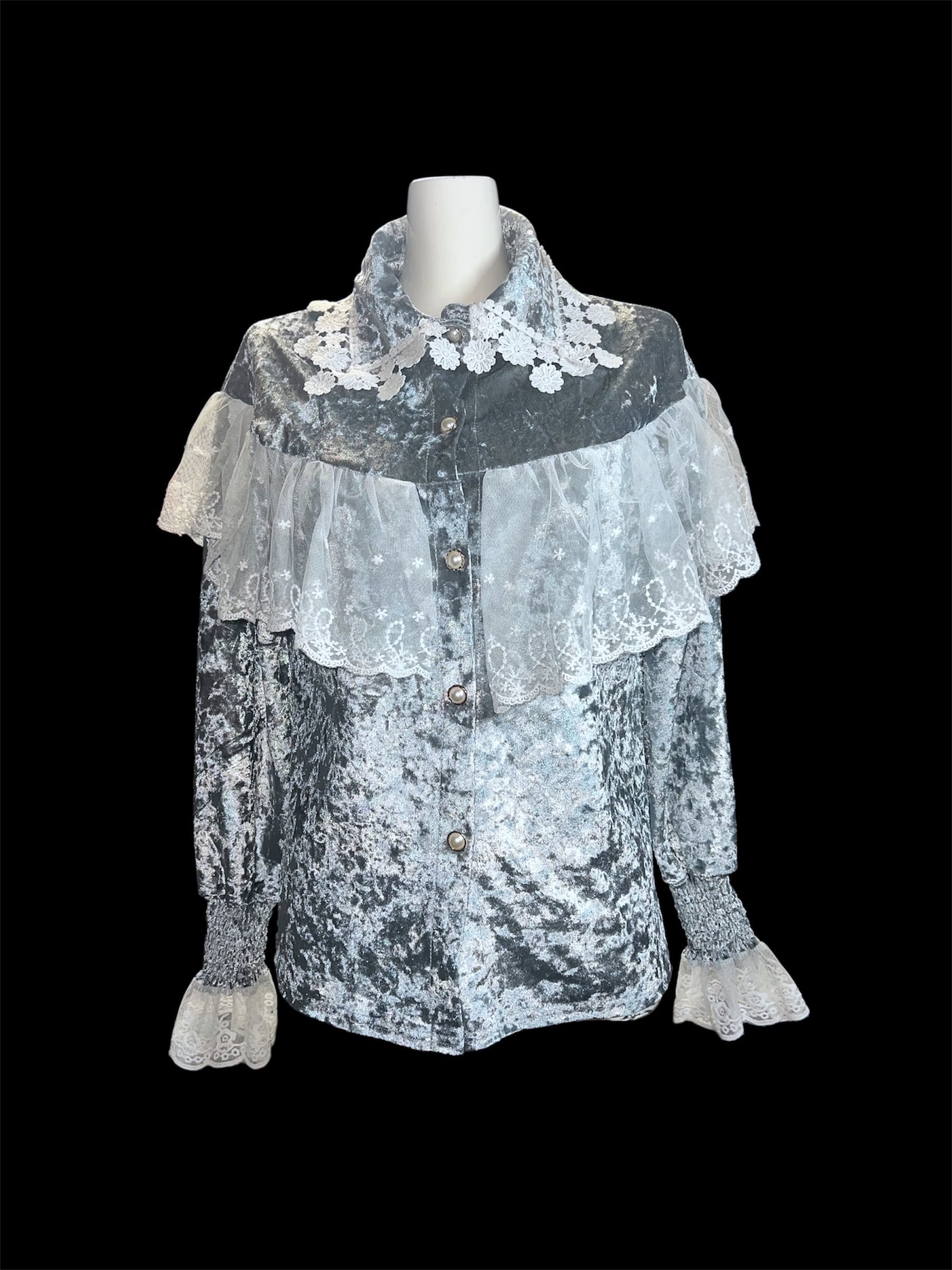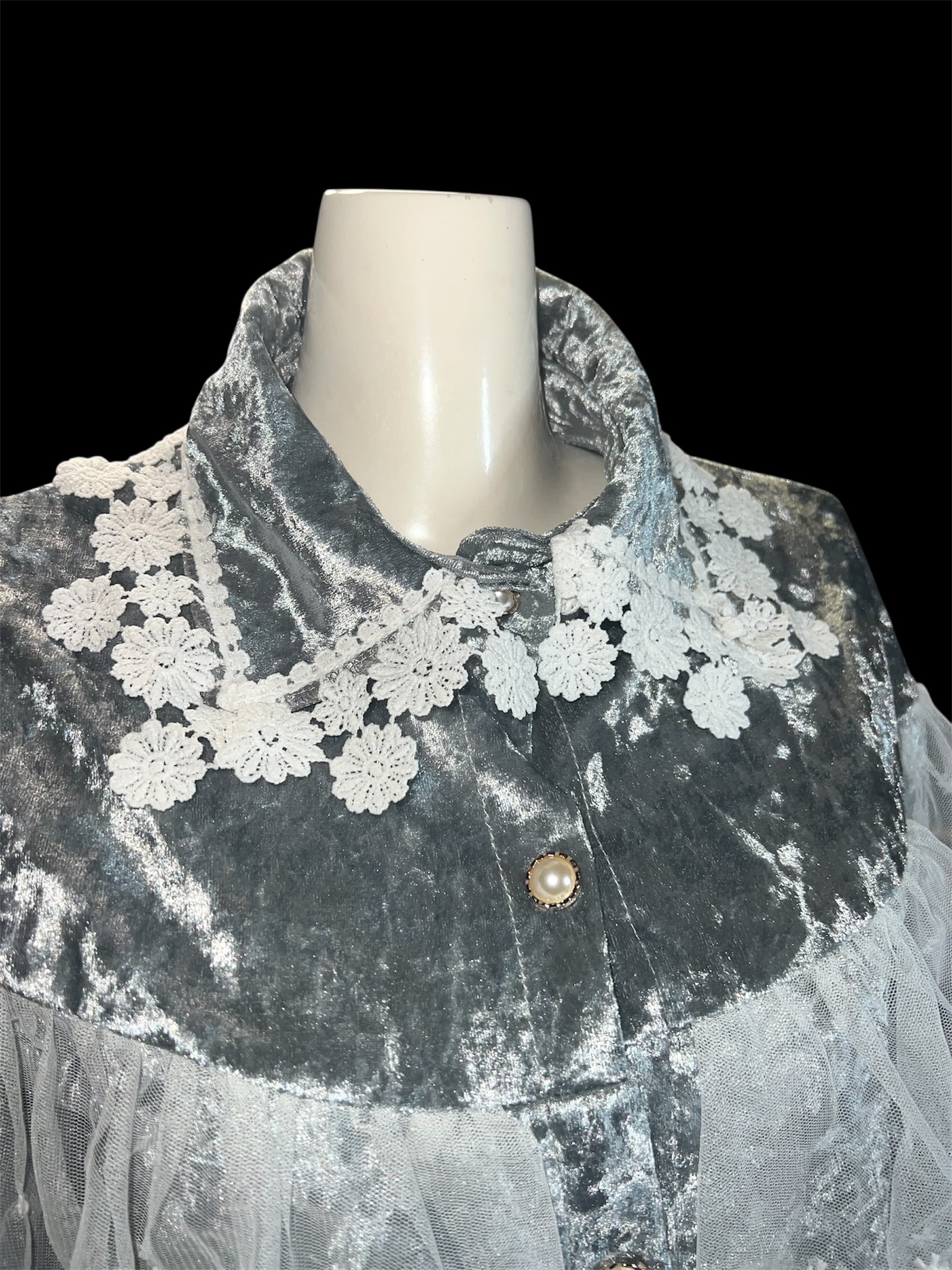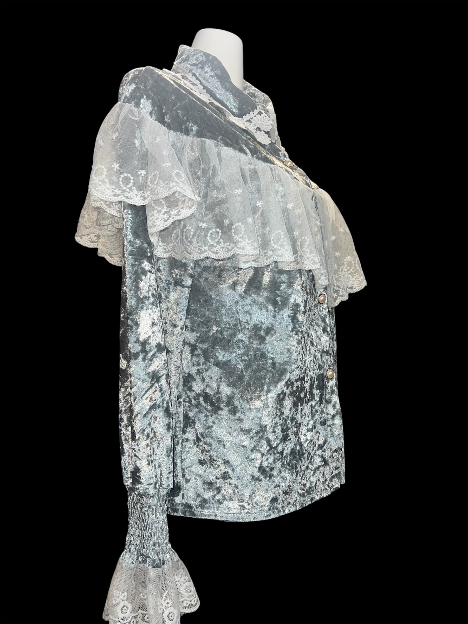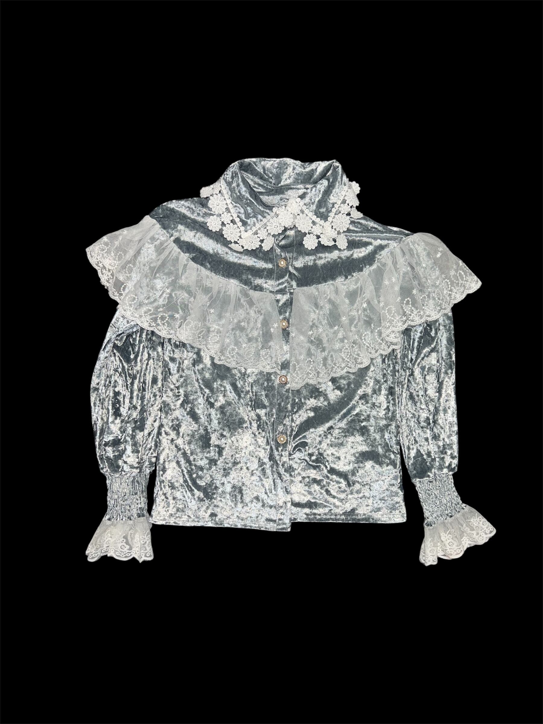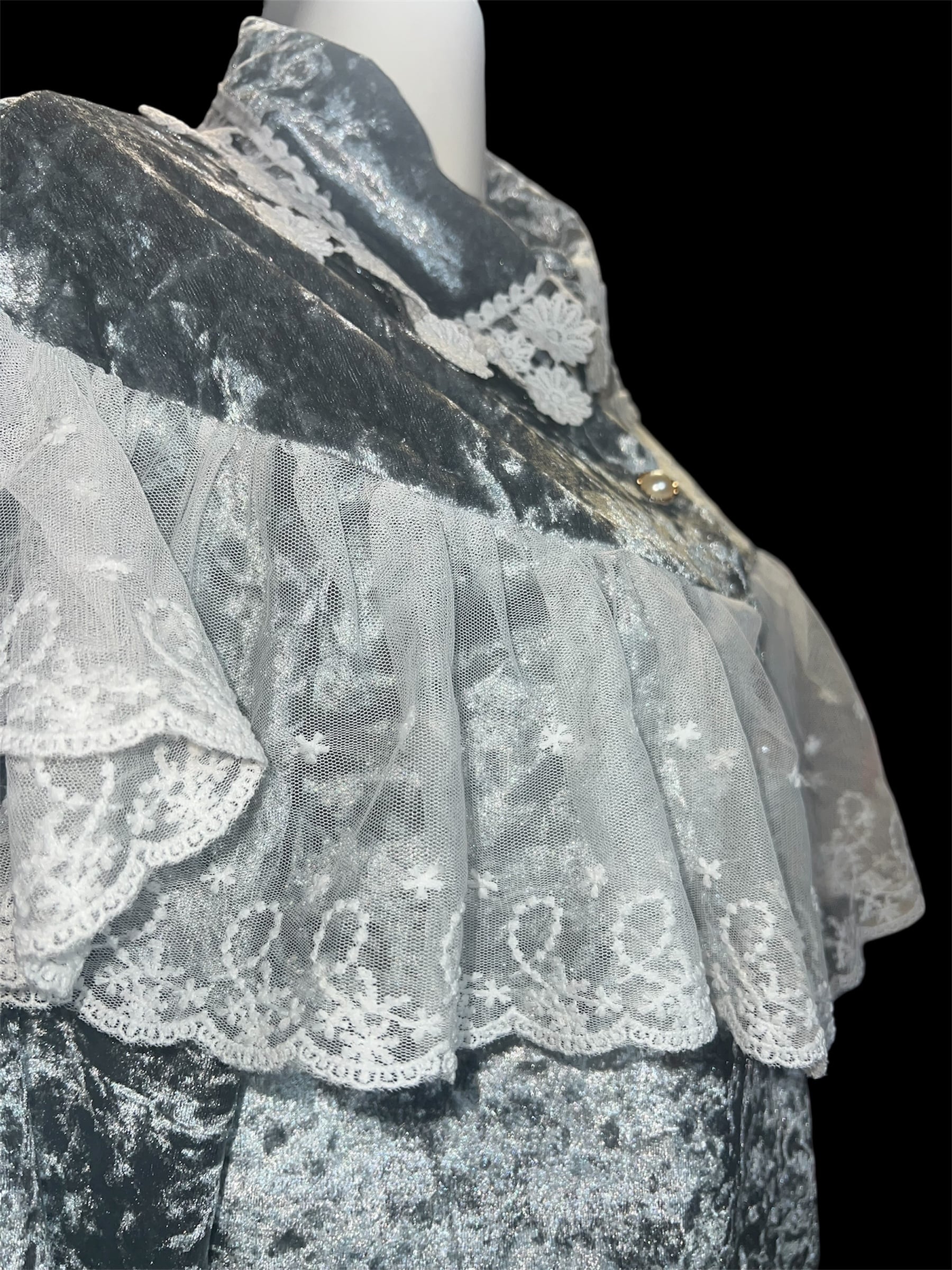 グレーベロアに繊細なレースケープを重ねたクラシカルなブラウスです。青みがかっており、かなり水色の入ったグレーとなります。