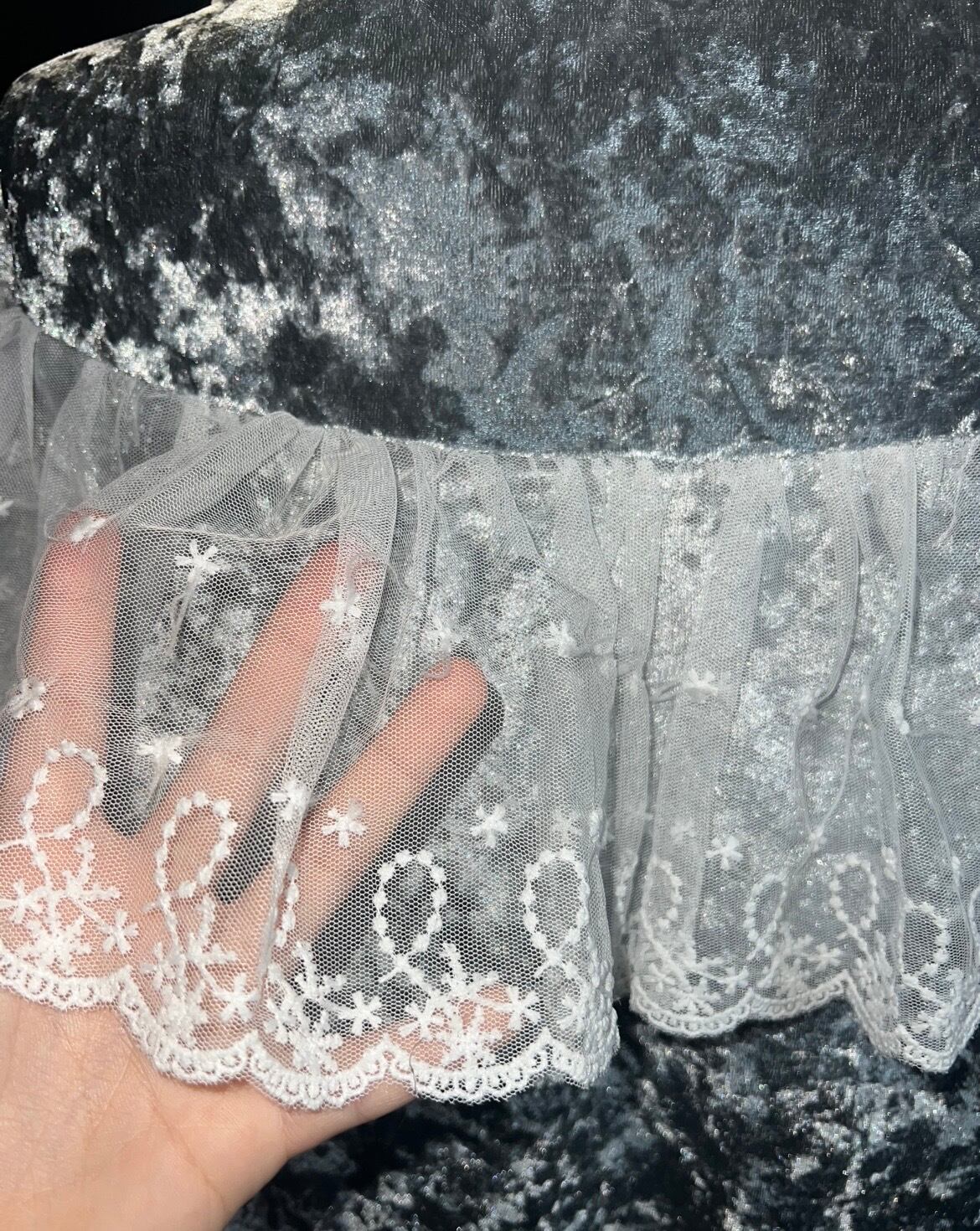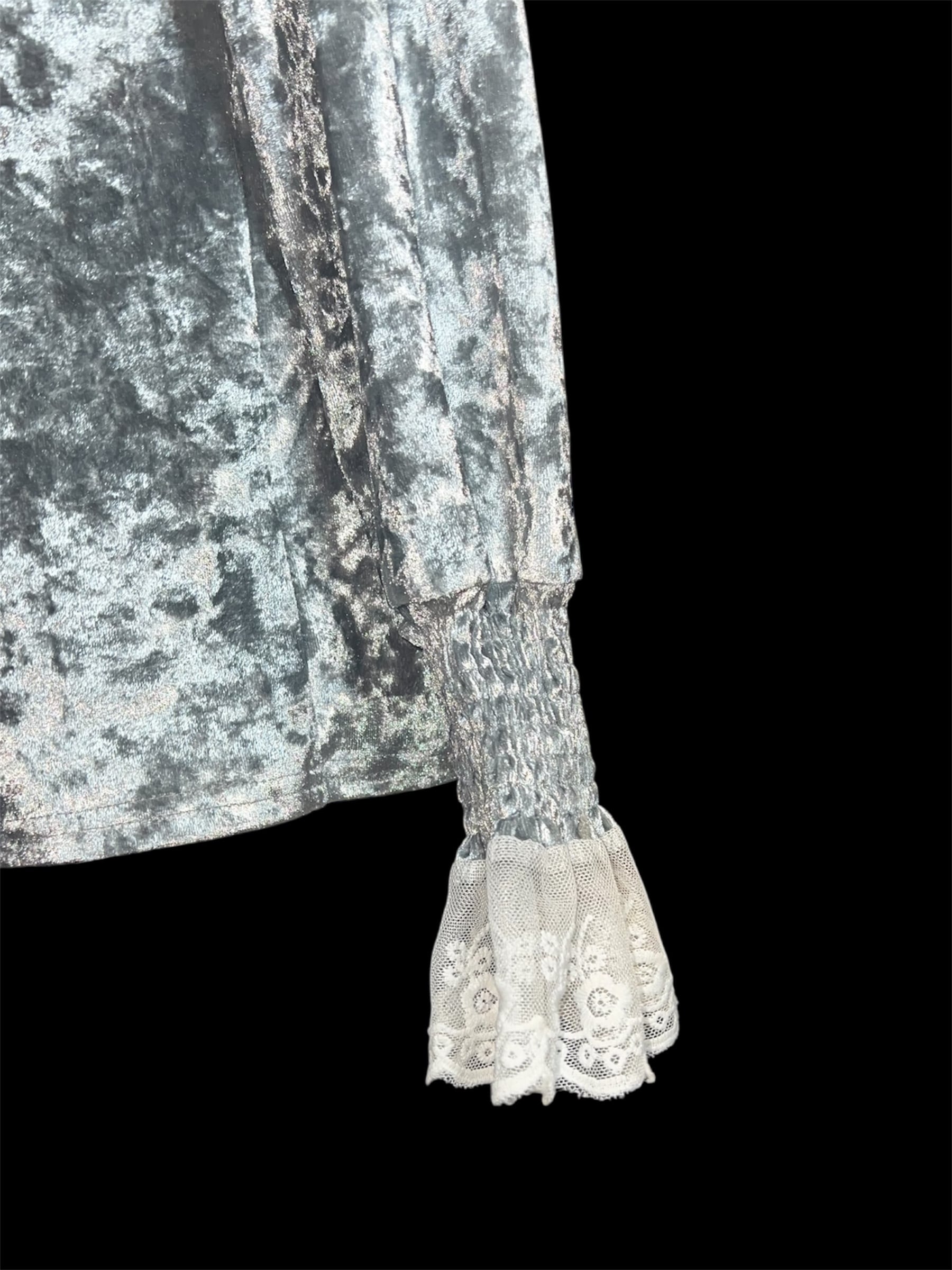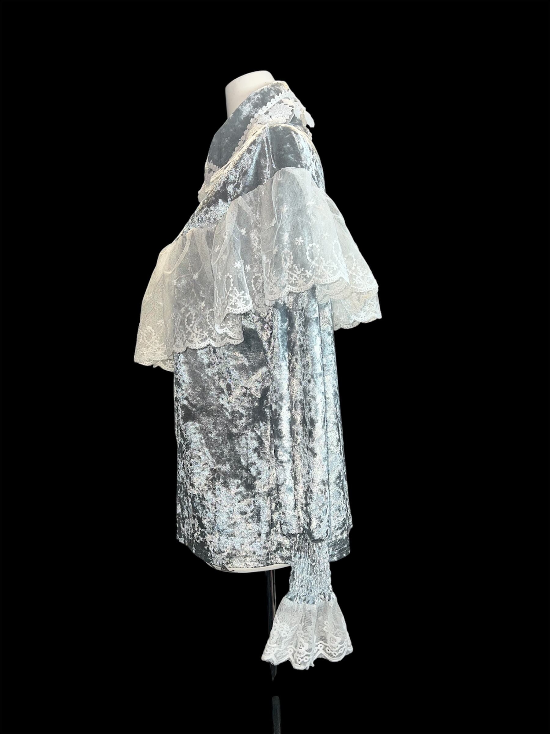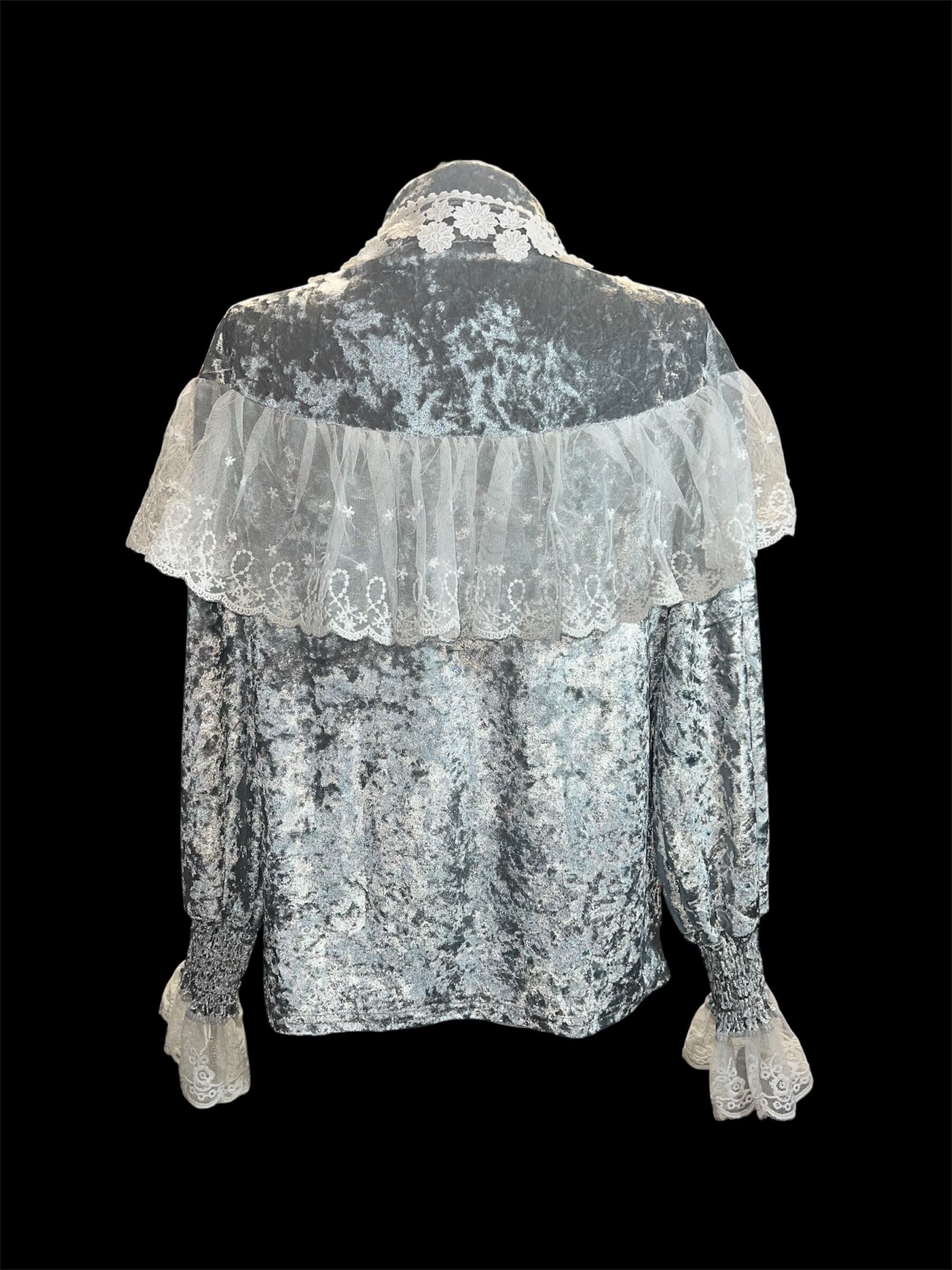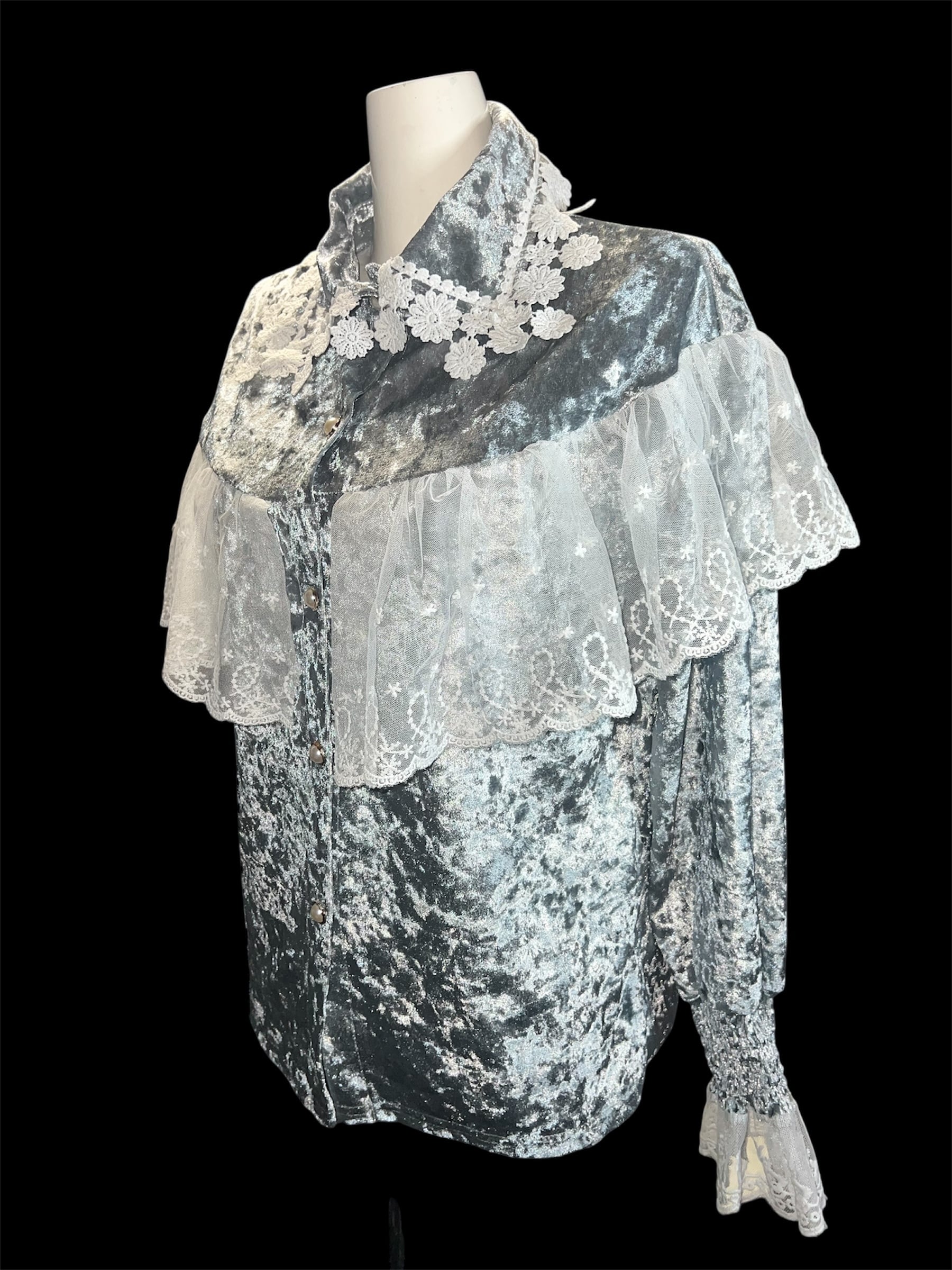 グレーベロアに繊細なレースケープを重ねたクラシカルなブラウスです。青みがかっており、かなり水色の入ったグレーとなります。