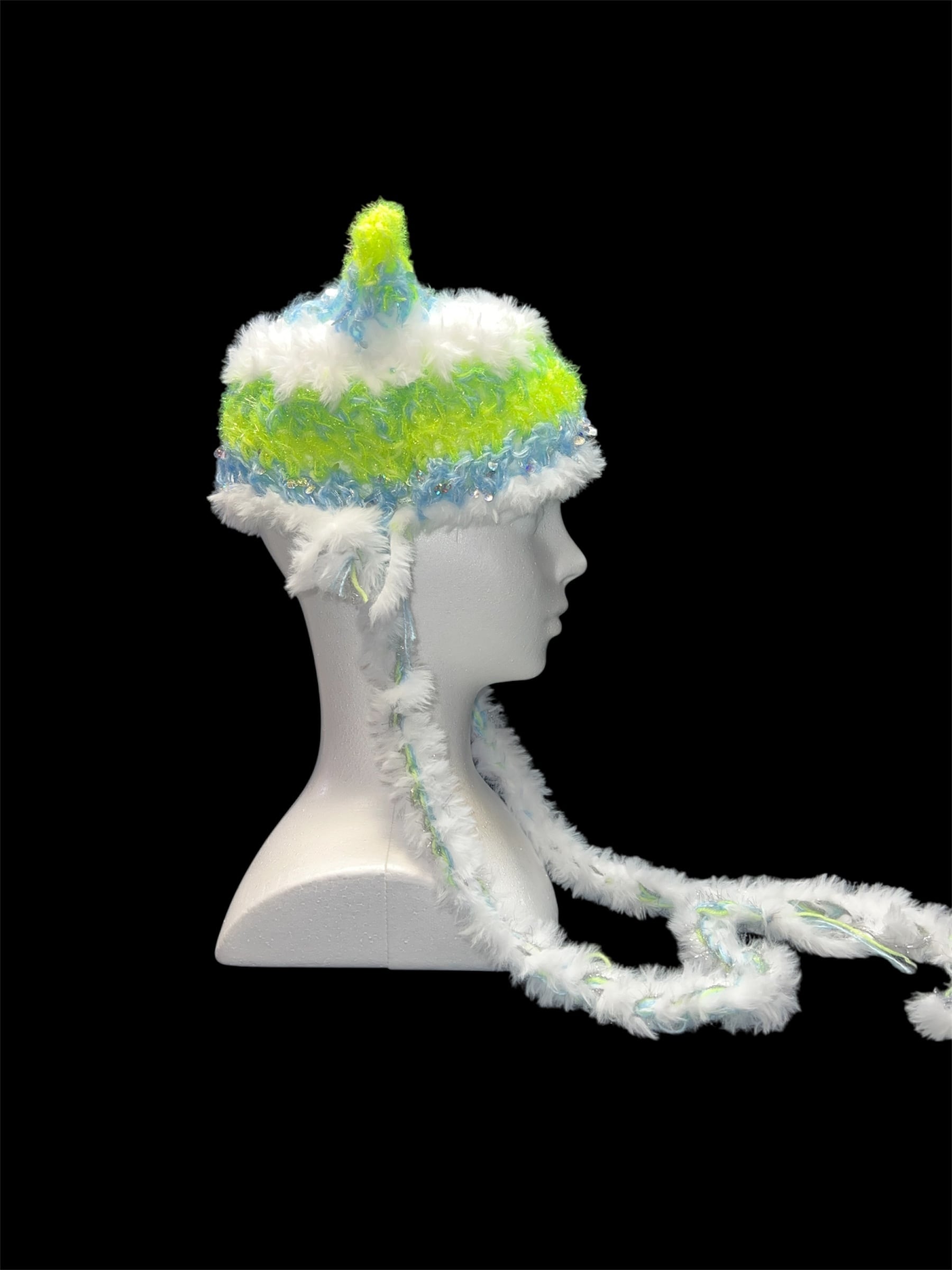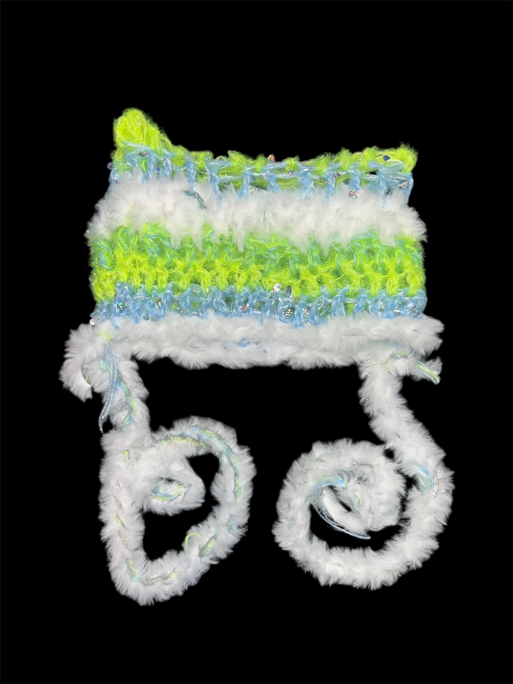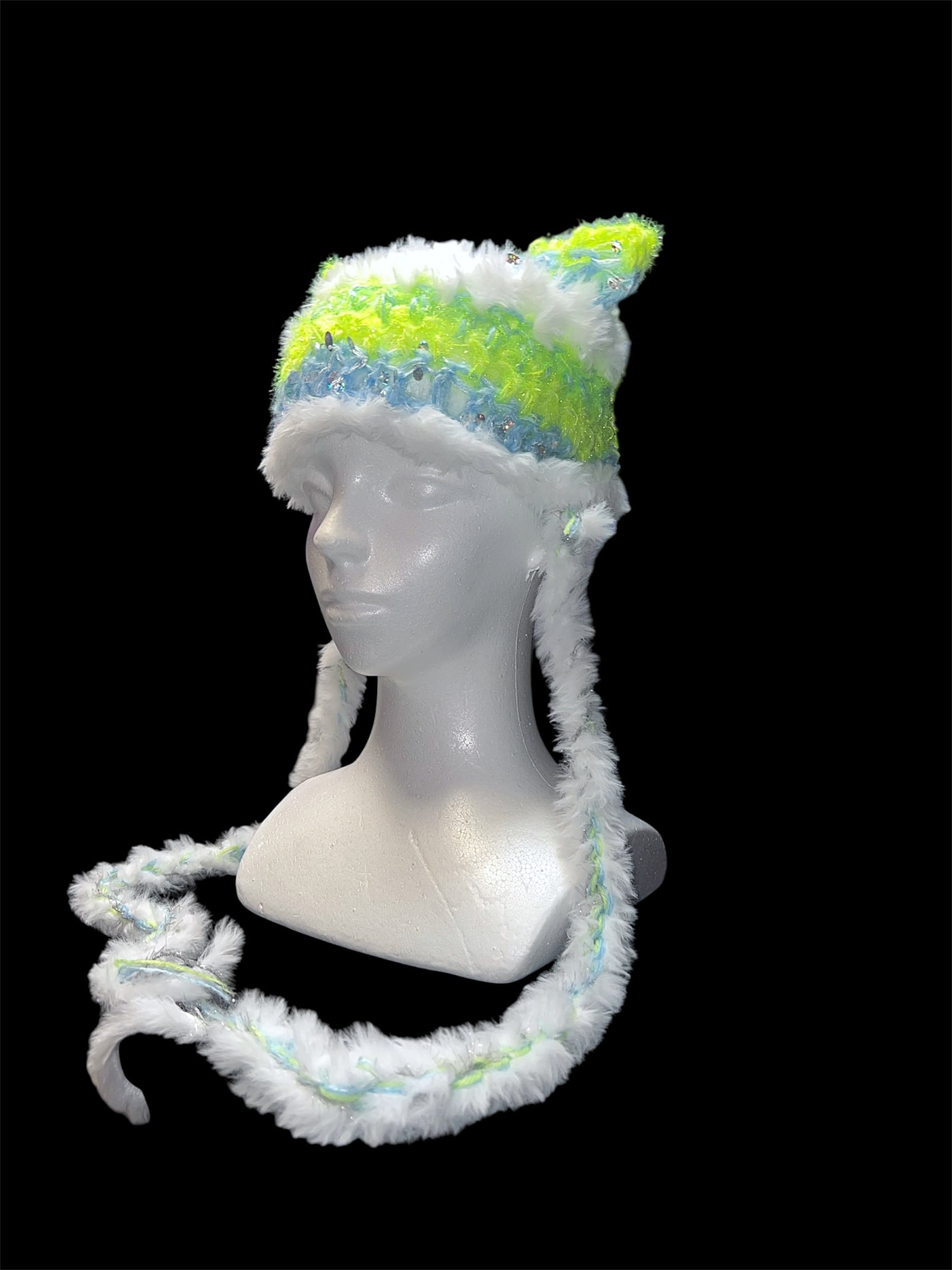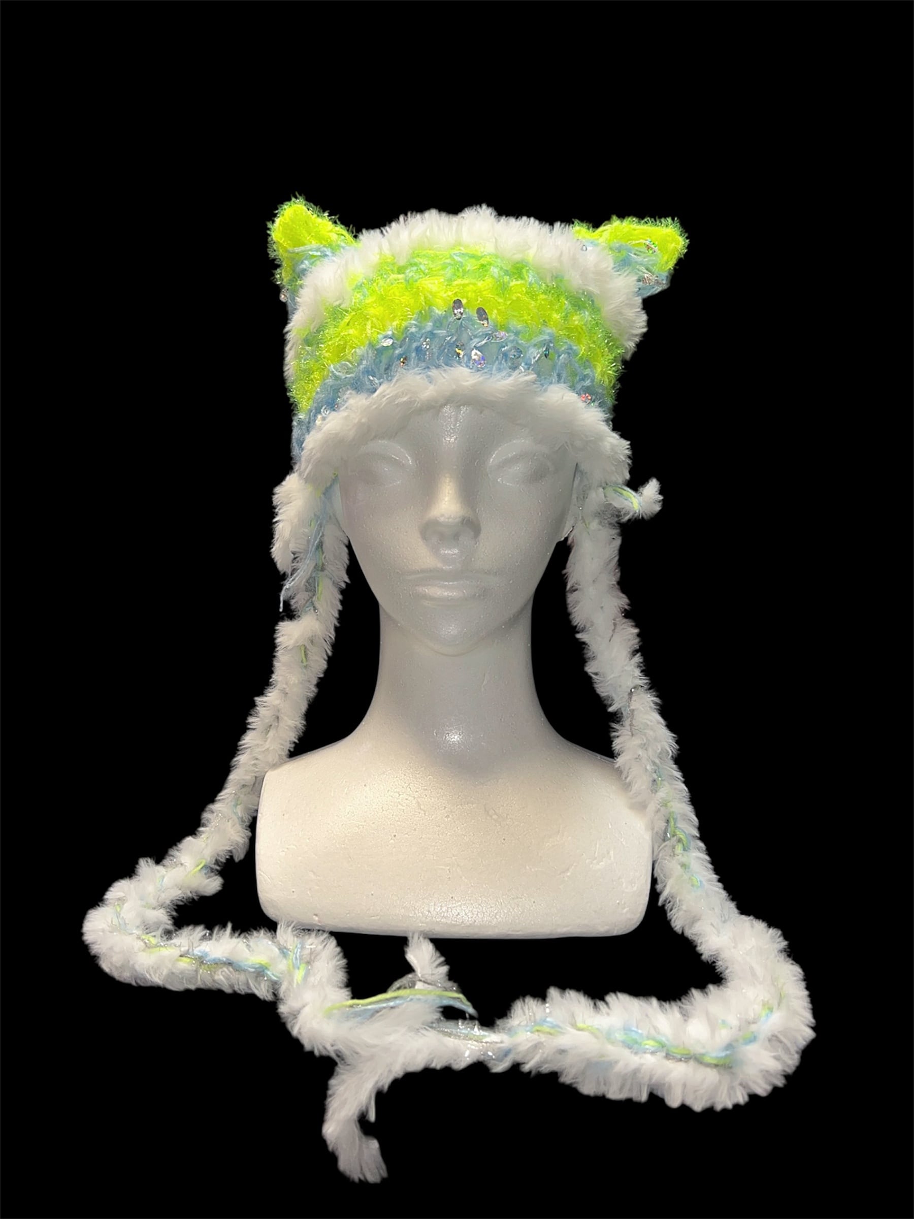 ネオンイエローとブルーのカラーが印象的なキャットイヤーニットハット。