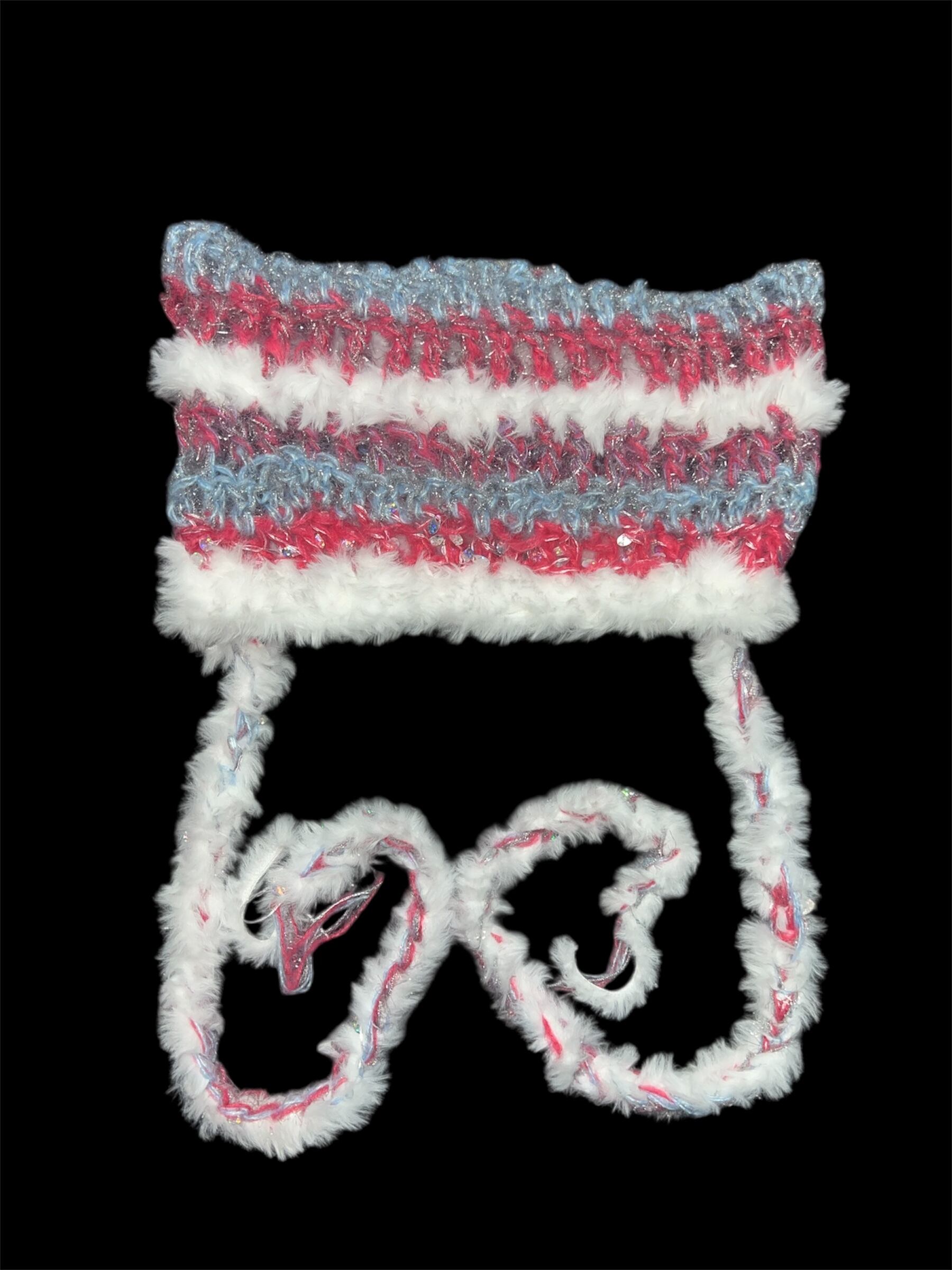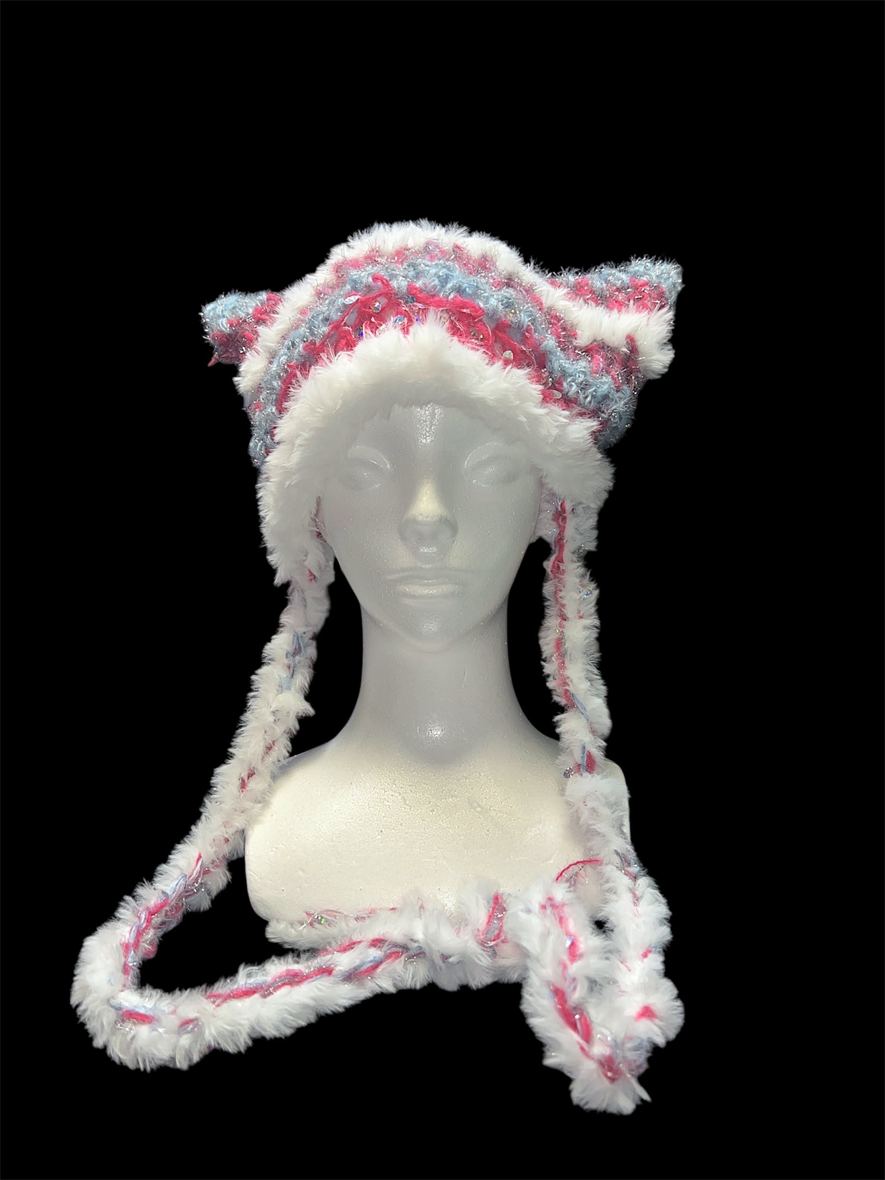 ホワイトをベースにピンクとブルーを重ねたパステルカラーのキャットイヤーニットハット。