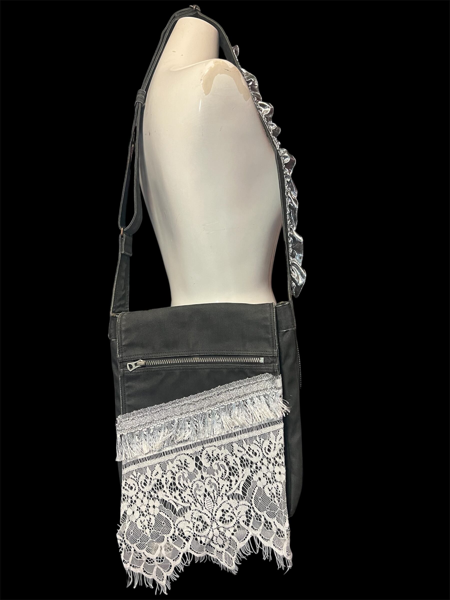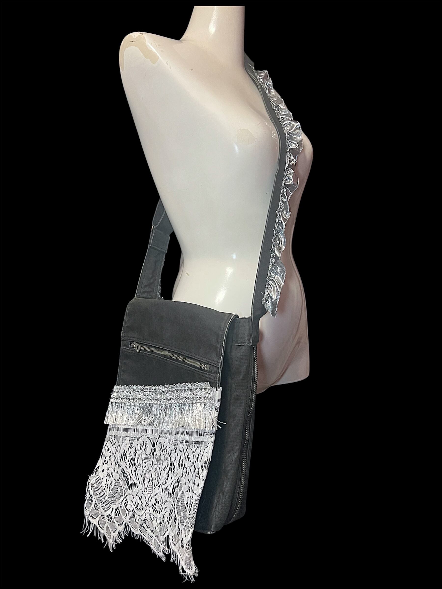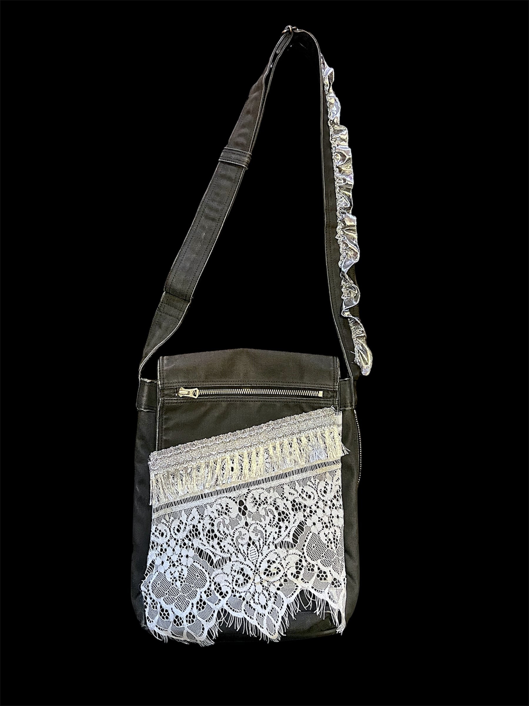 濃いグレーベースのショルダーバッグに繊細な総レースとフリンジを大胆に重ねたデザイン。