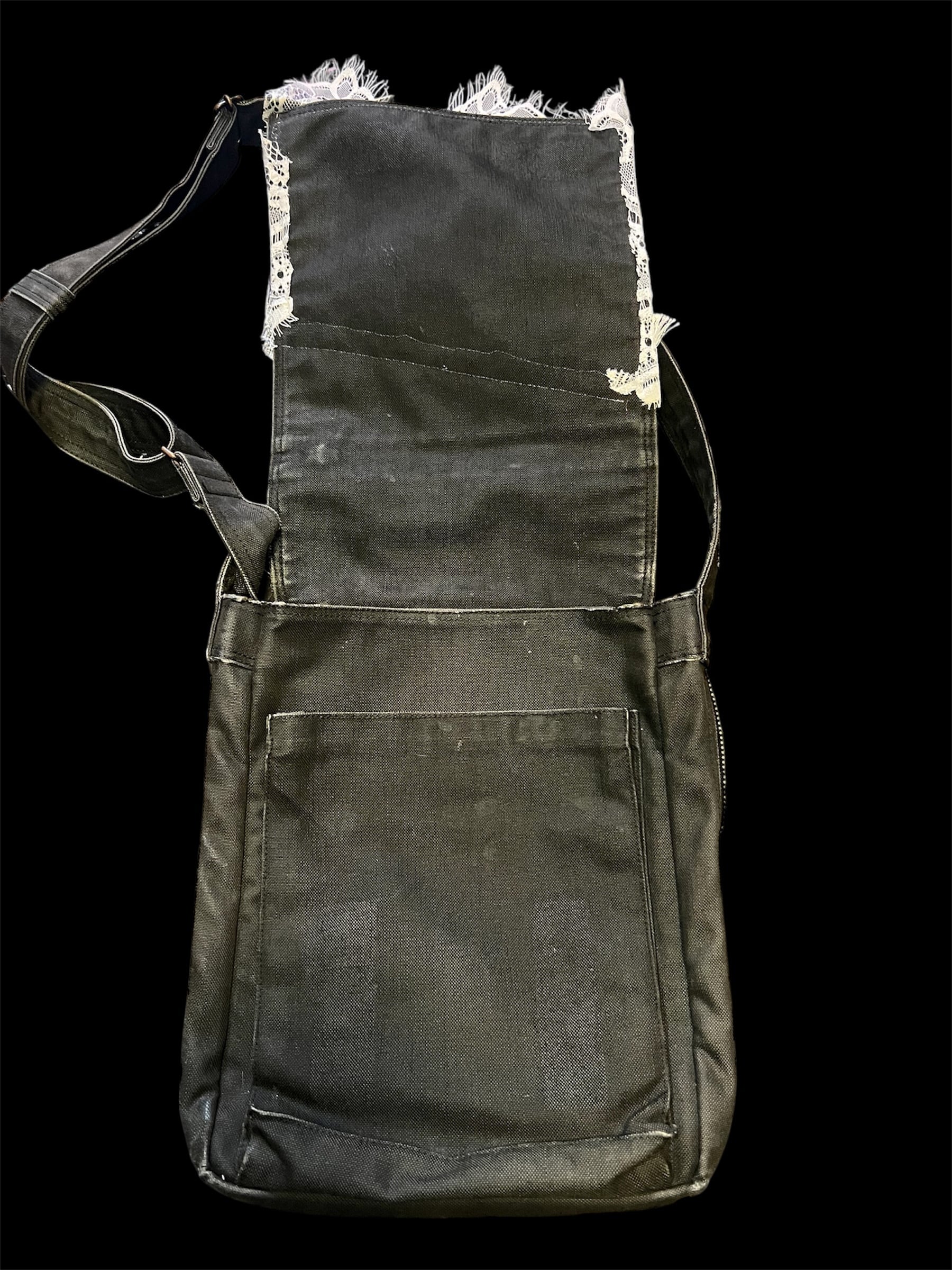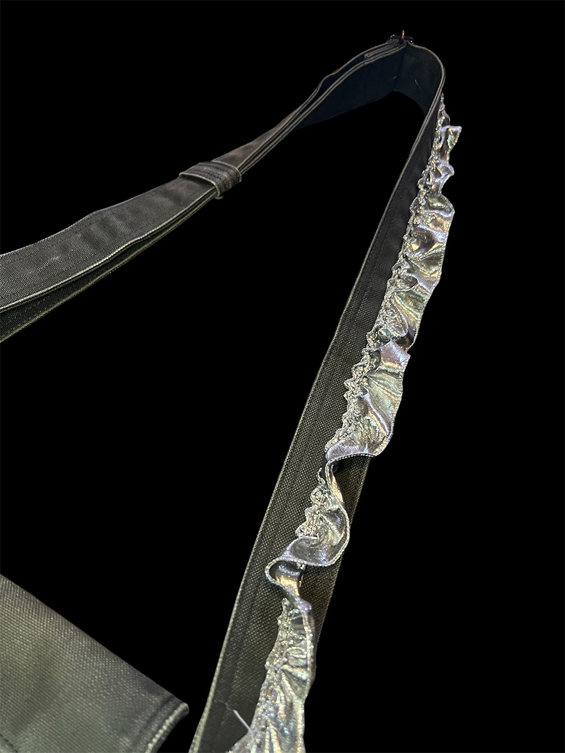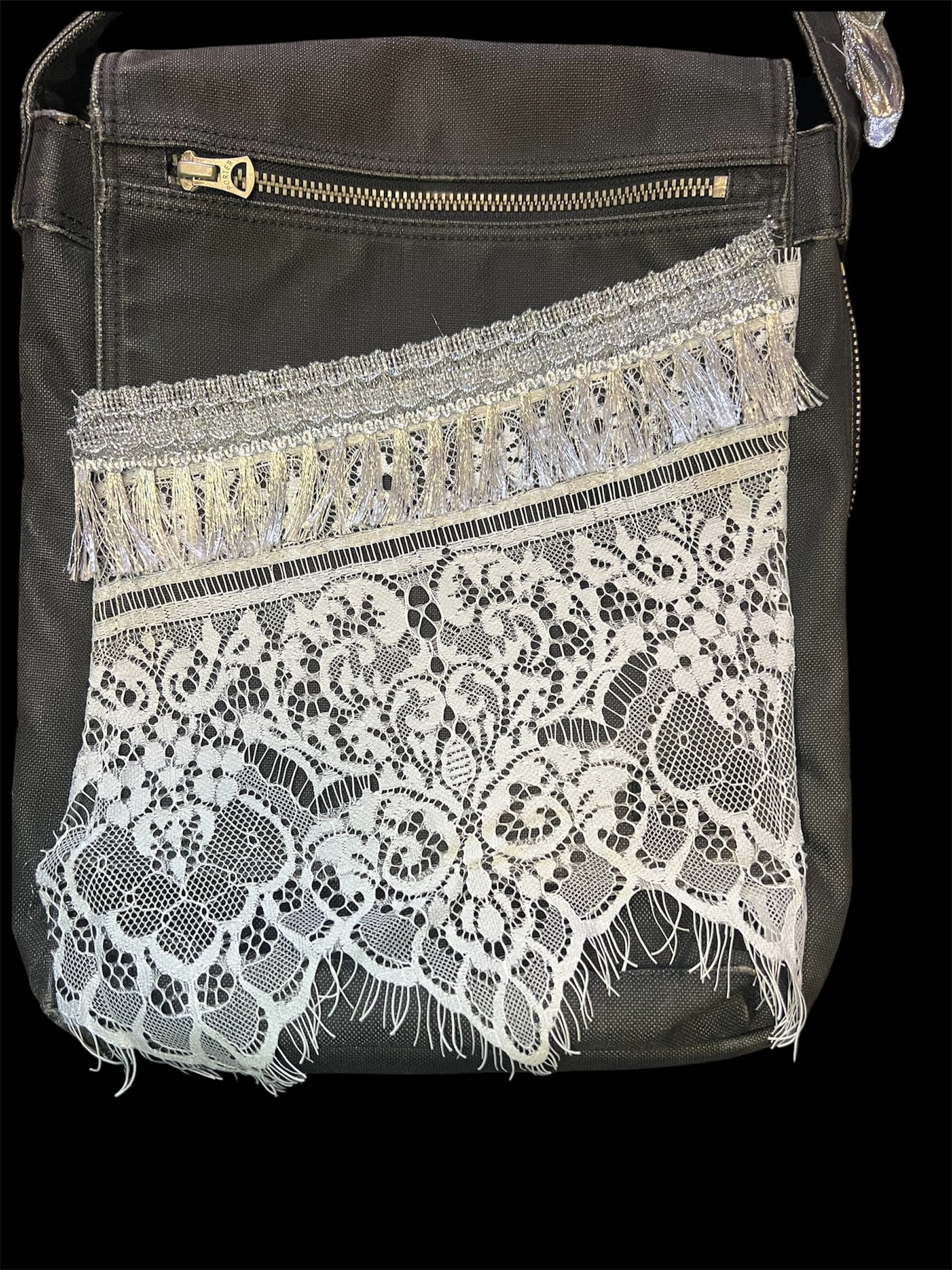 濃いグレーベースのショルダーバッグに繊細な総レースとフリンジを大胆に重ねたデザイン。