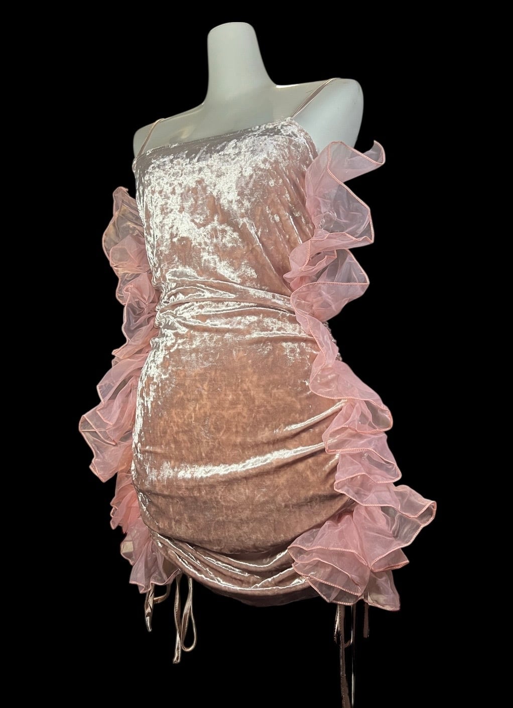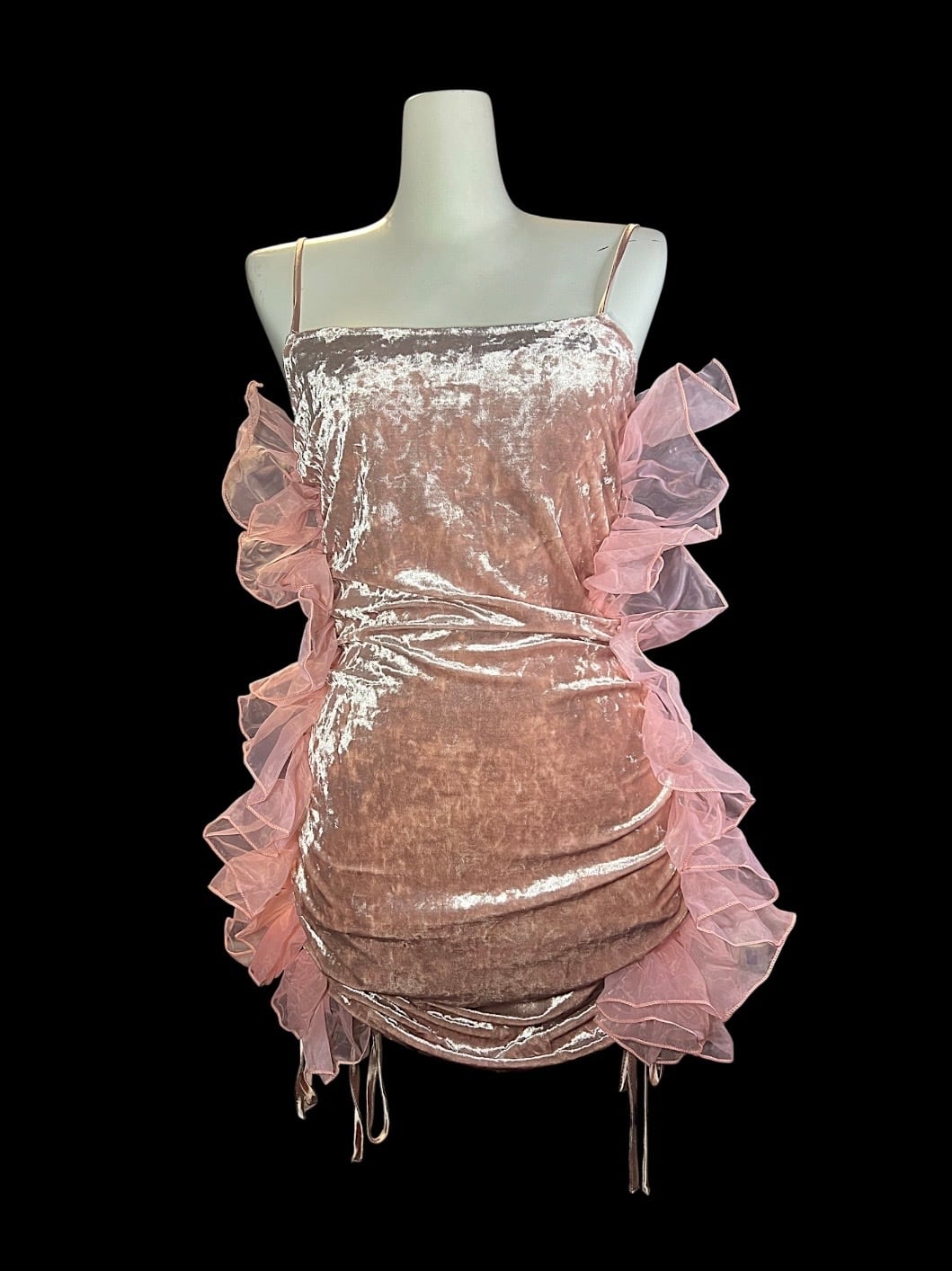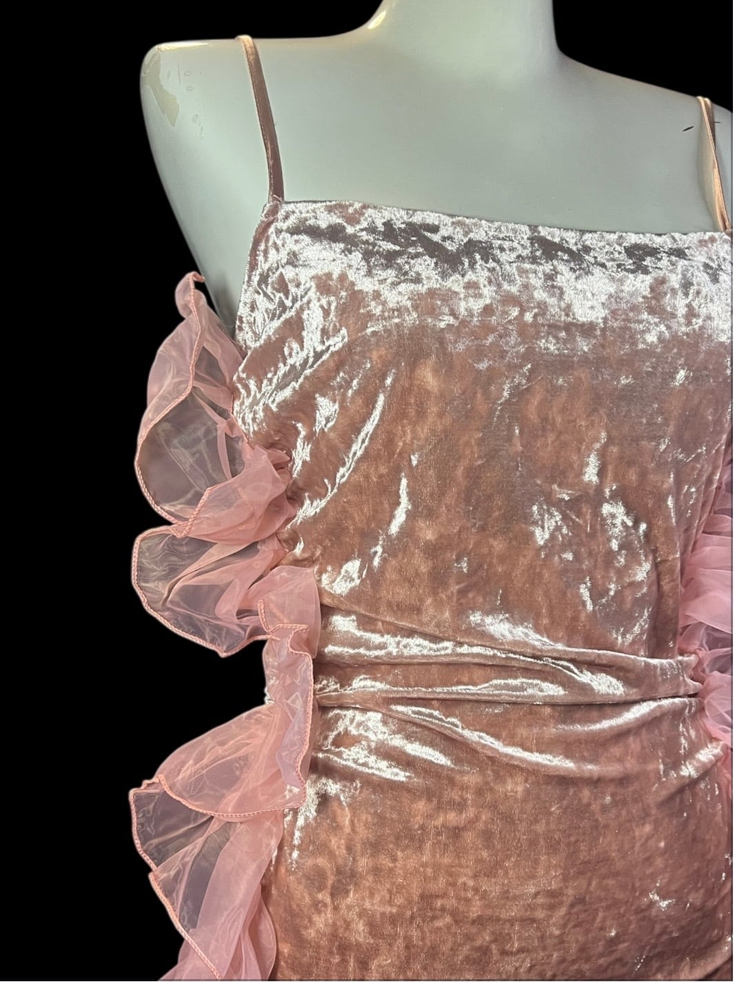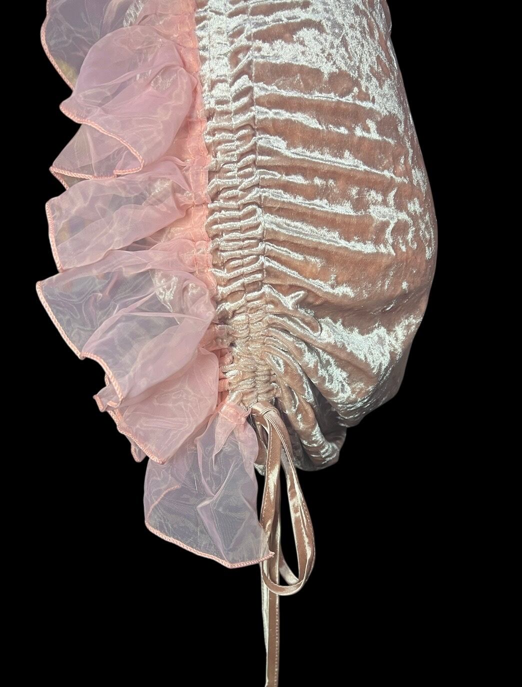 ピンクベロア素材を使用したキャミソール。両サイドにはボリュームのあるオーガンジーフリルを配置し、立体感のあるシルエットに仕上げています。