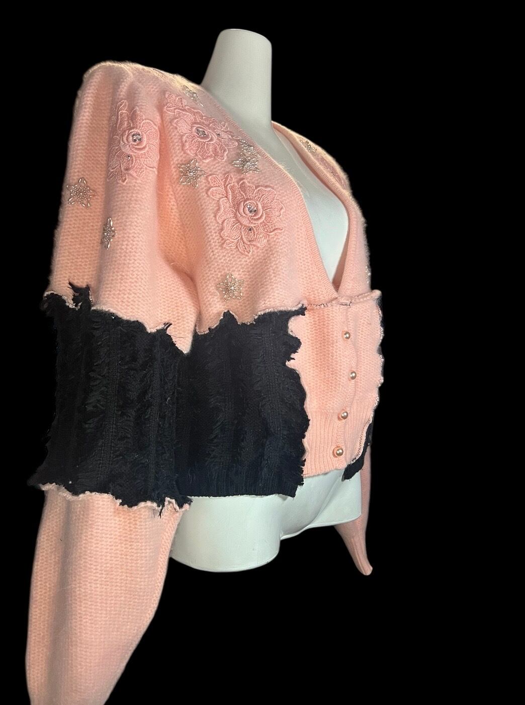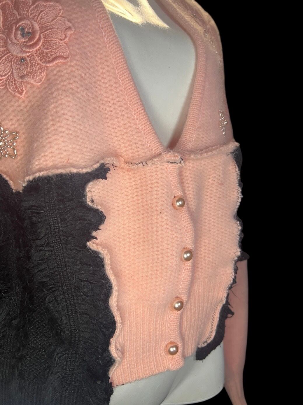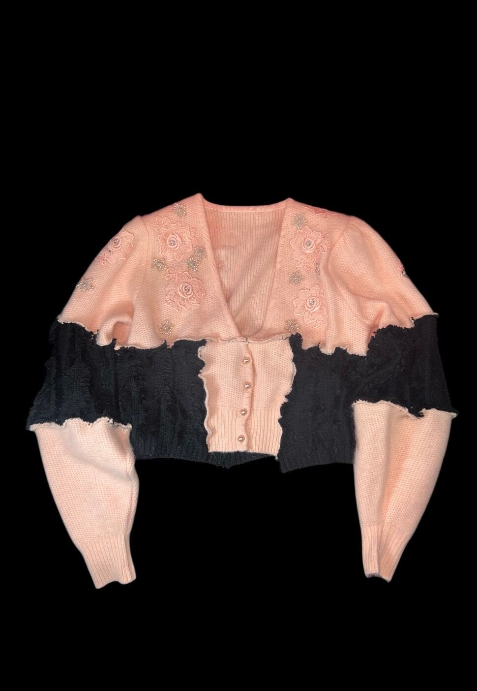 ピンクのニットカーディガンをベースに、ブラックの異素材をドッキングしたリメイクアイテム。肩パッド入りです。