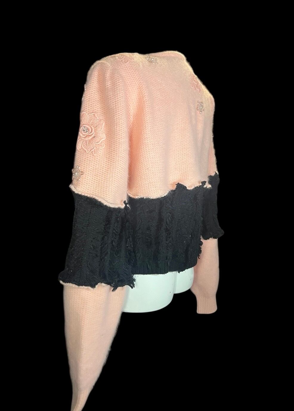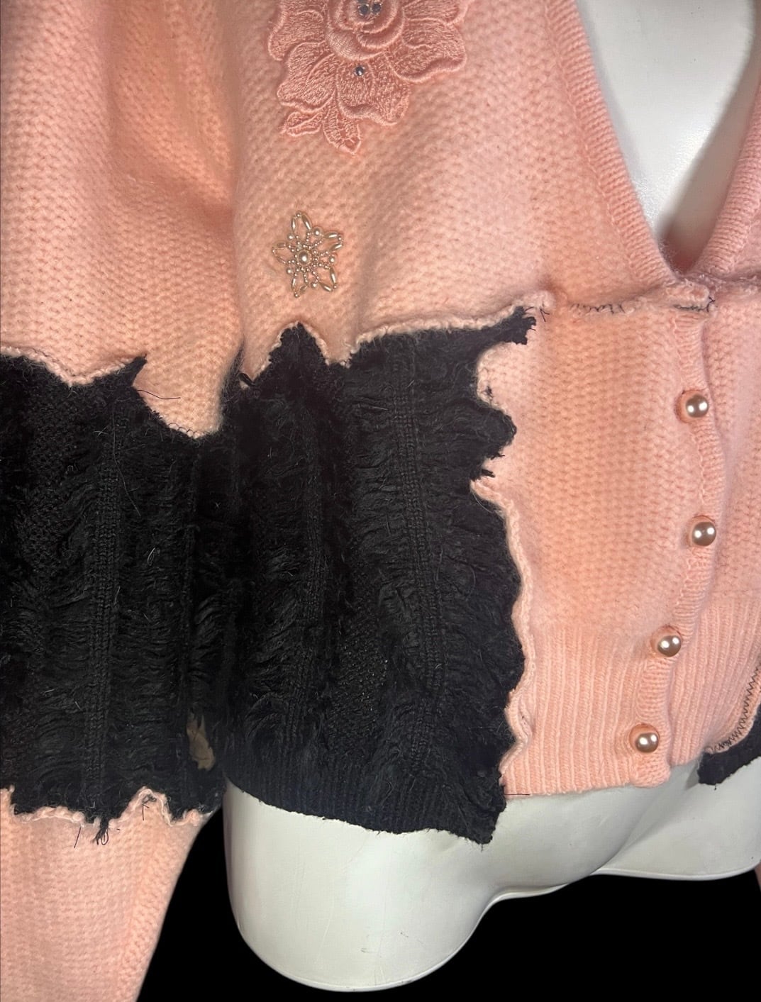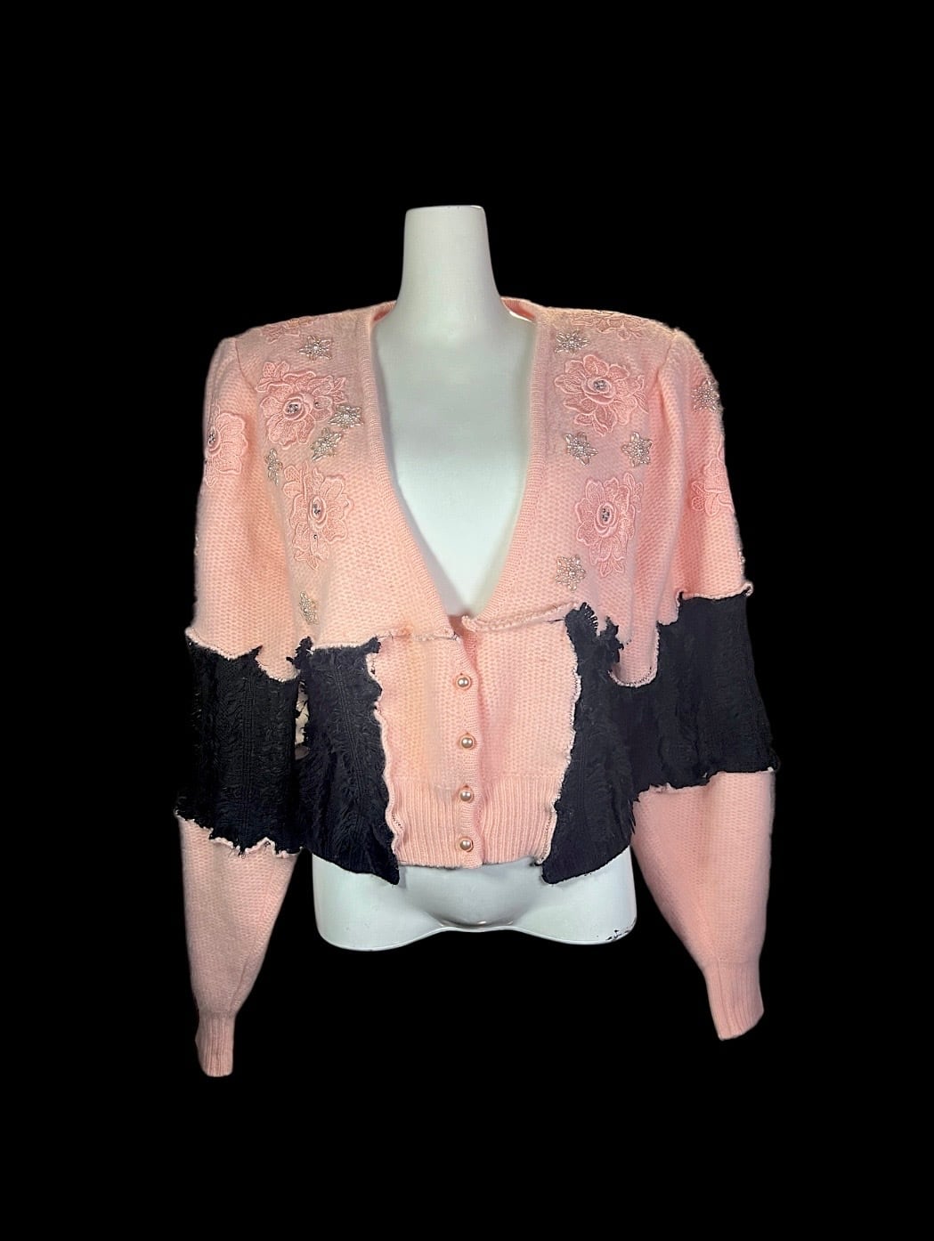 ピンクのニットカーディガンをベースに、ブラックの異素材をドッキングしたリメイクアイテム。肩パッド入りです。