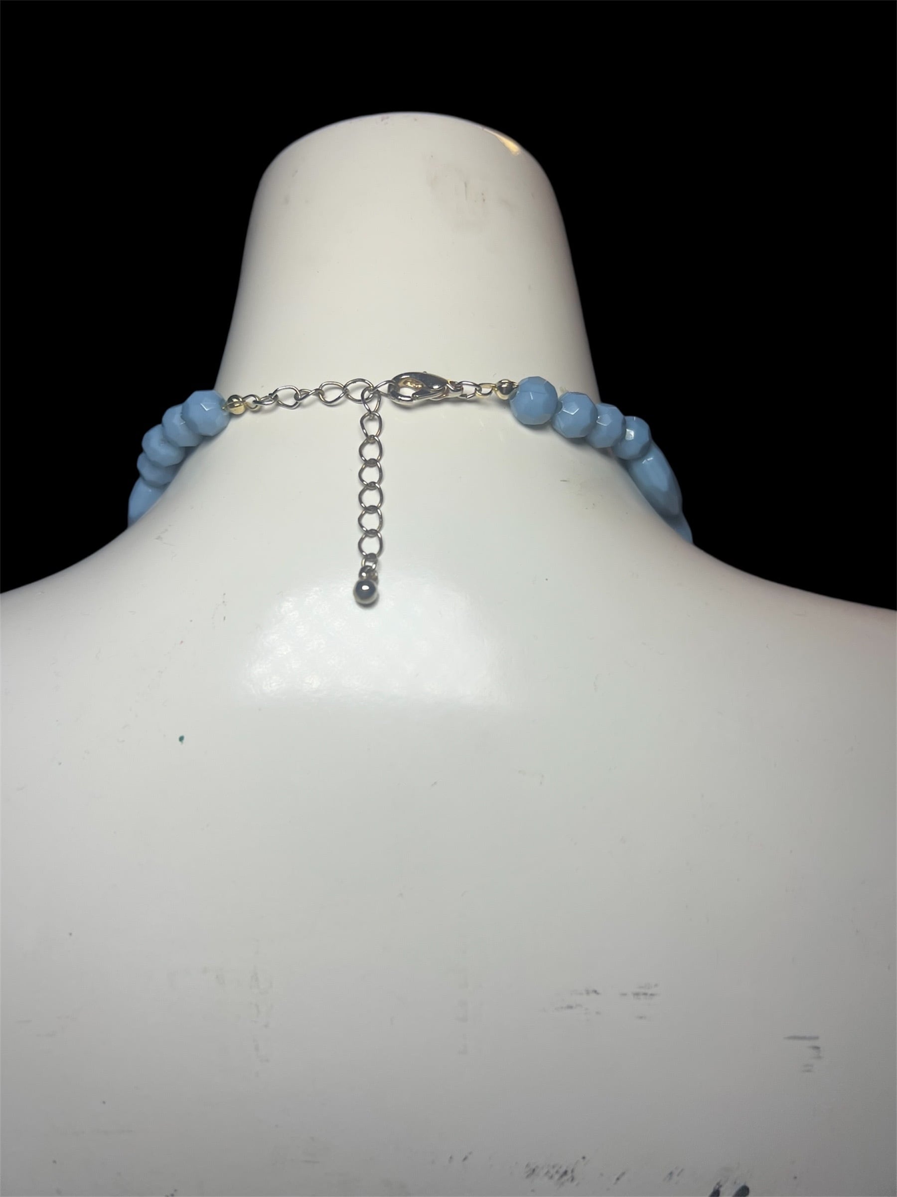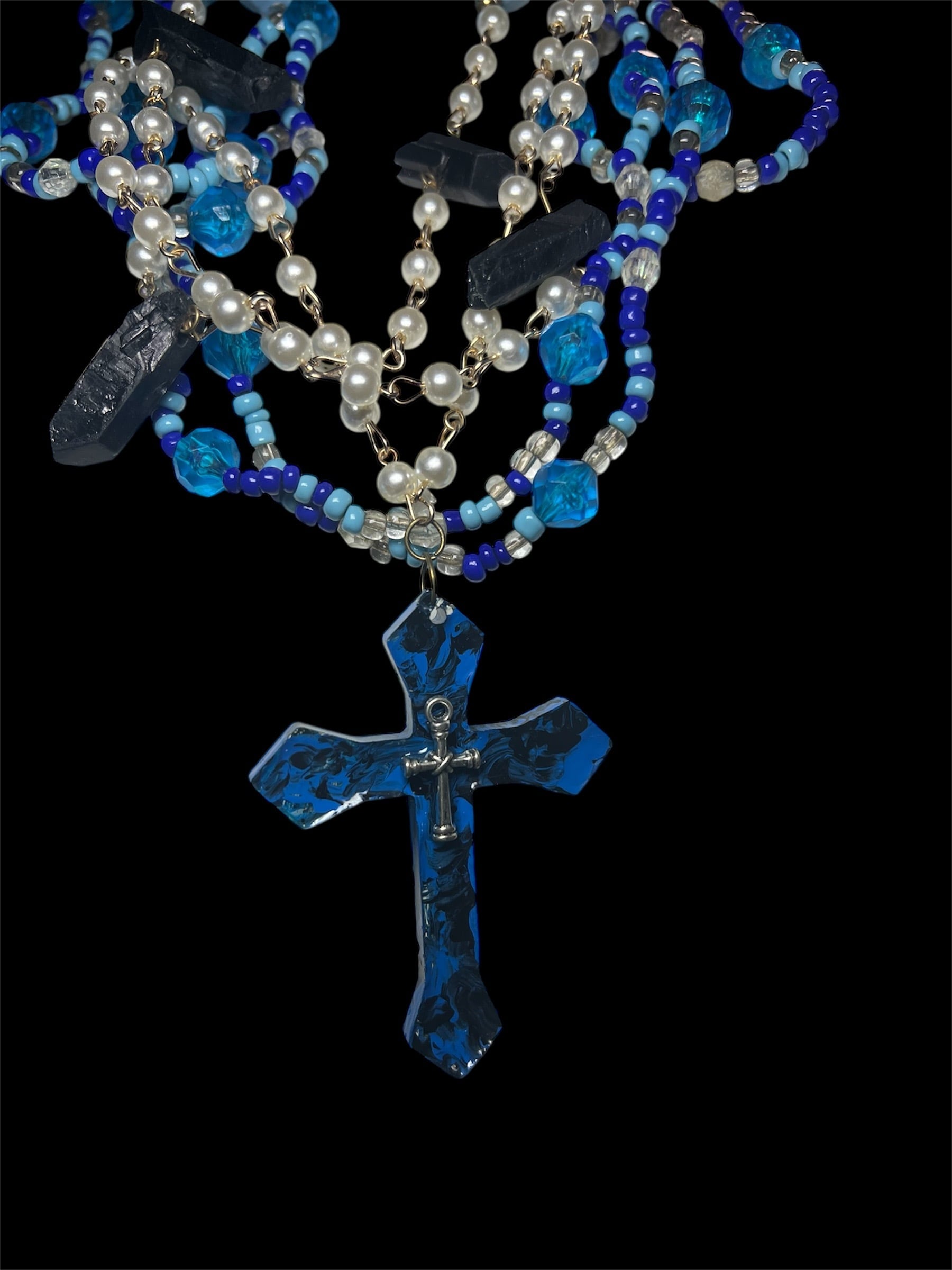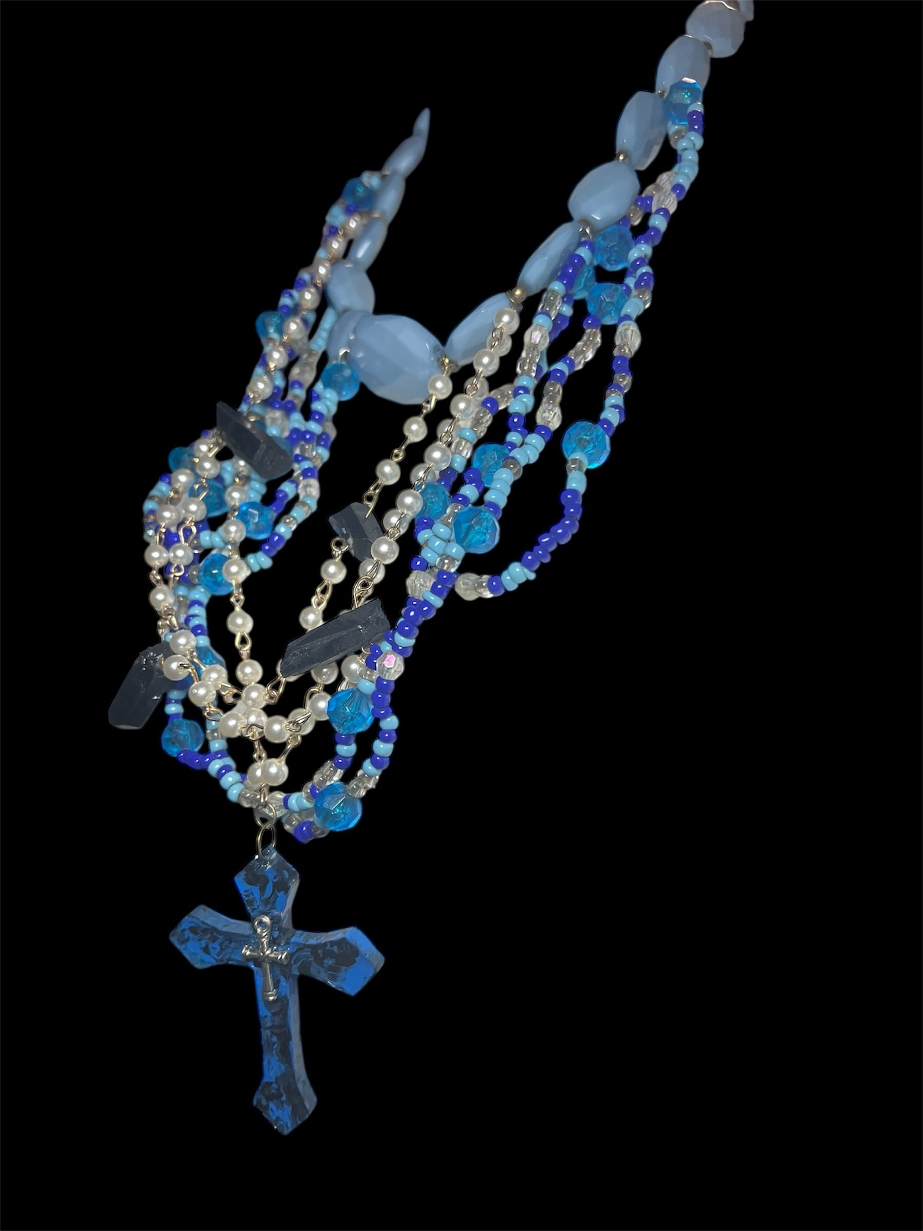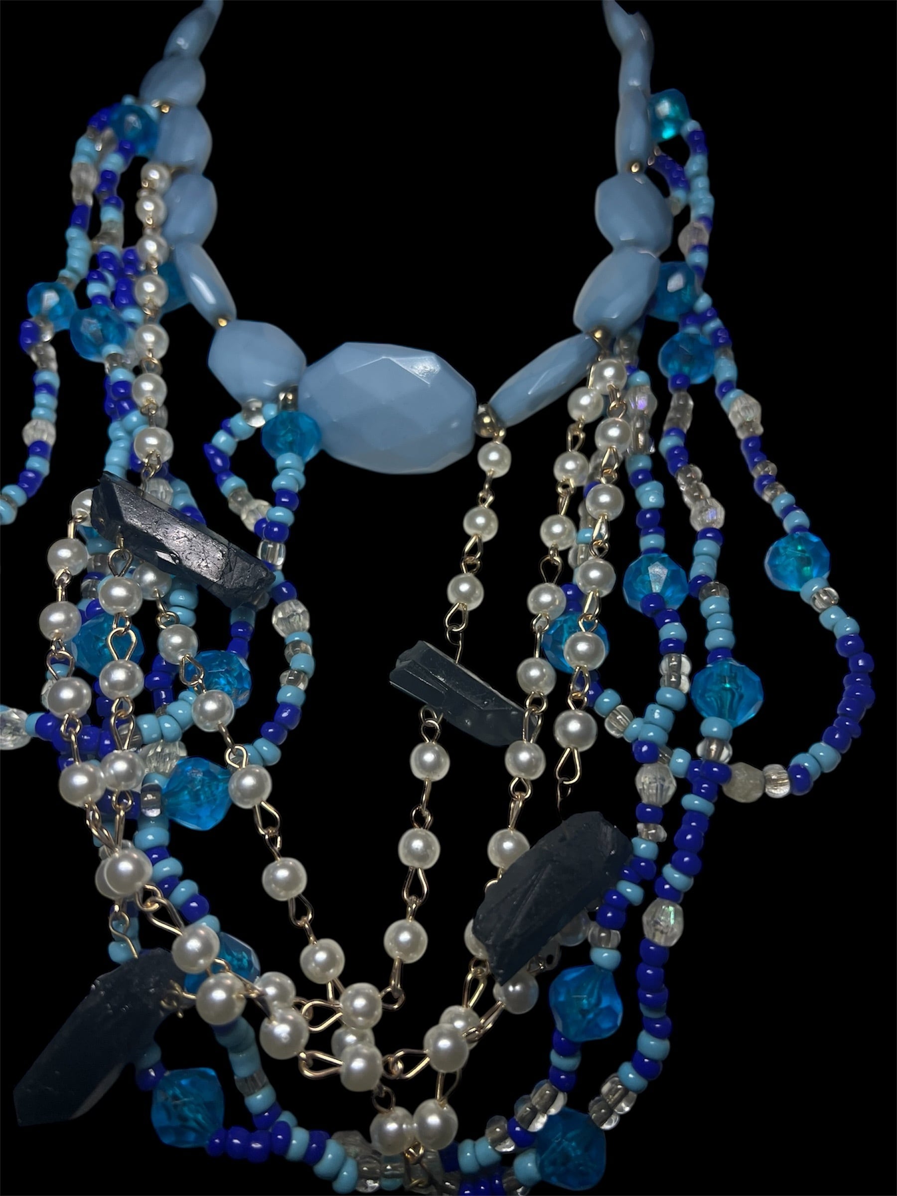 ブルー系クリスタルやビーズを重ねたレイヤーデザイン。複数のチェーンと異なる質感のパーツが重なり、立体感のある仕上がりです。