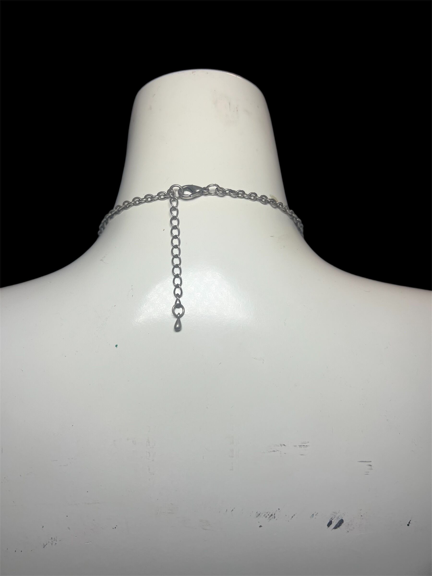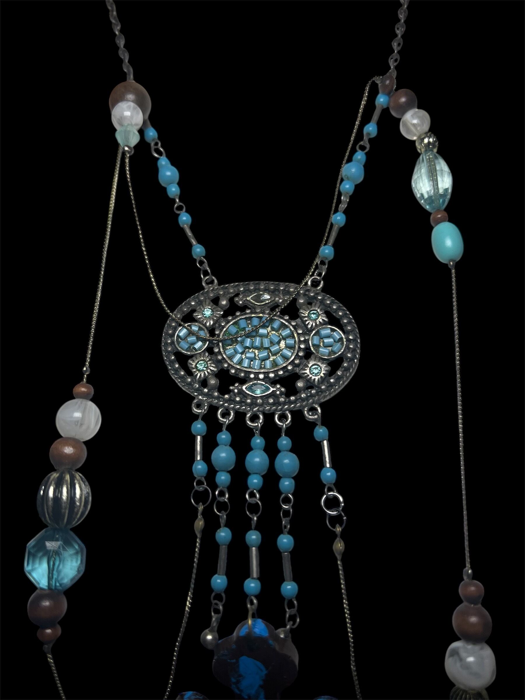 装飾的なパーツとチェーンを組み合わせたデザイン。ブルー系パーツとシルバーのバランスが特徴で、揺れ感のある仕上がりです。