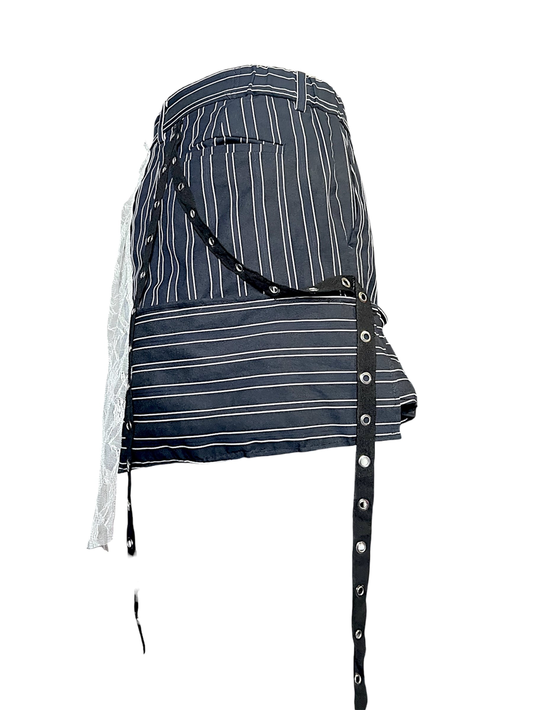 アイボリー×ホワイトのストライプパンツを解体し異素材を多層的に重ねたリメイクスカート。