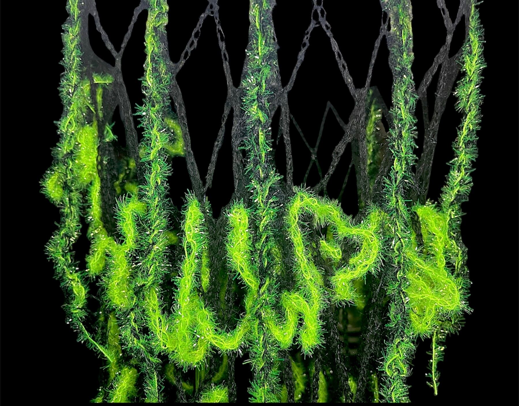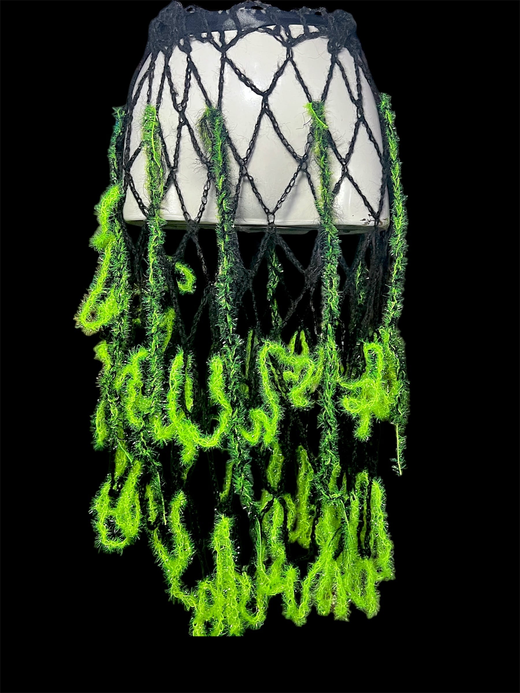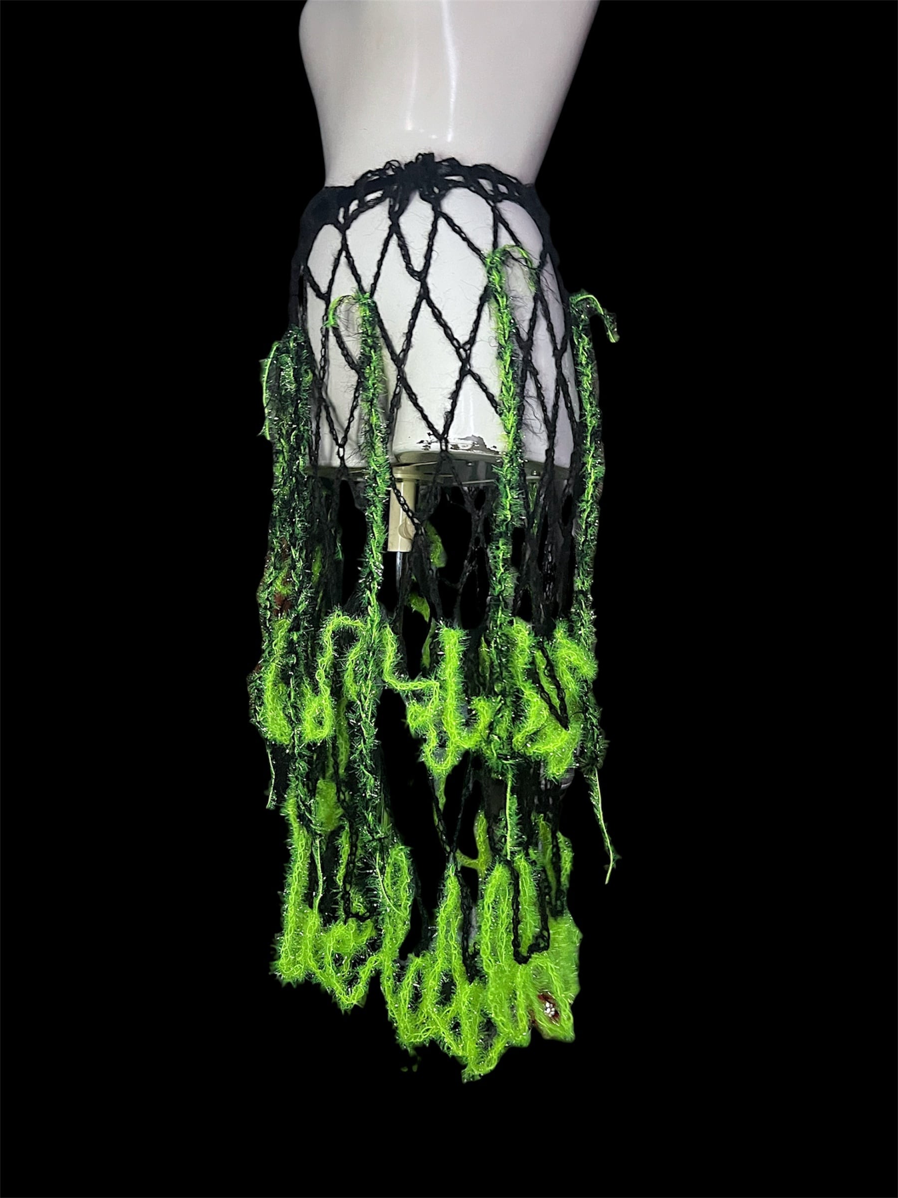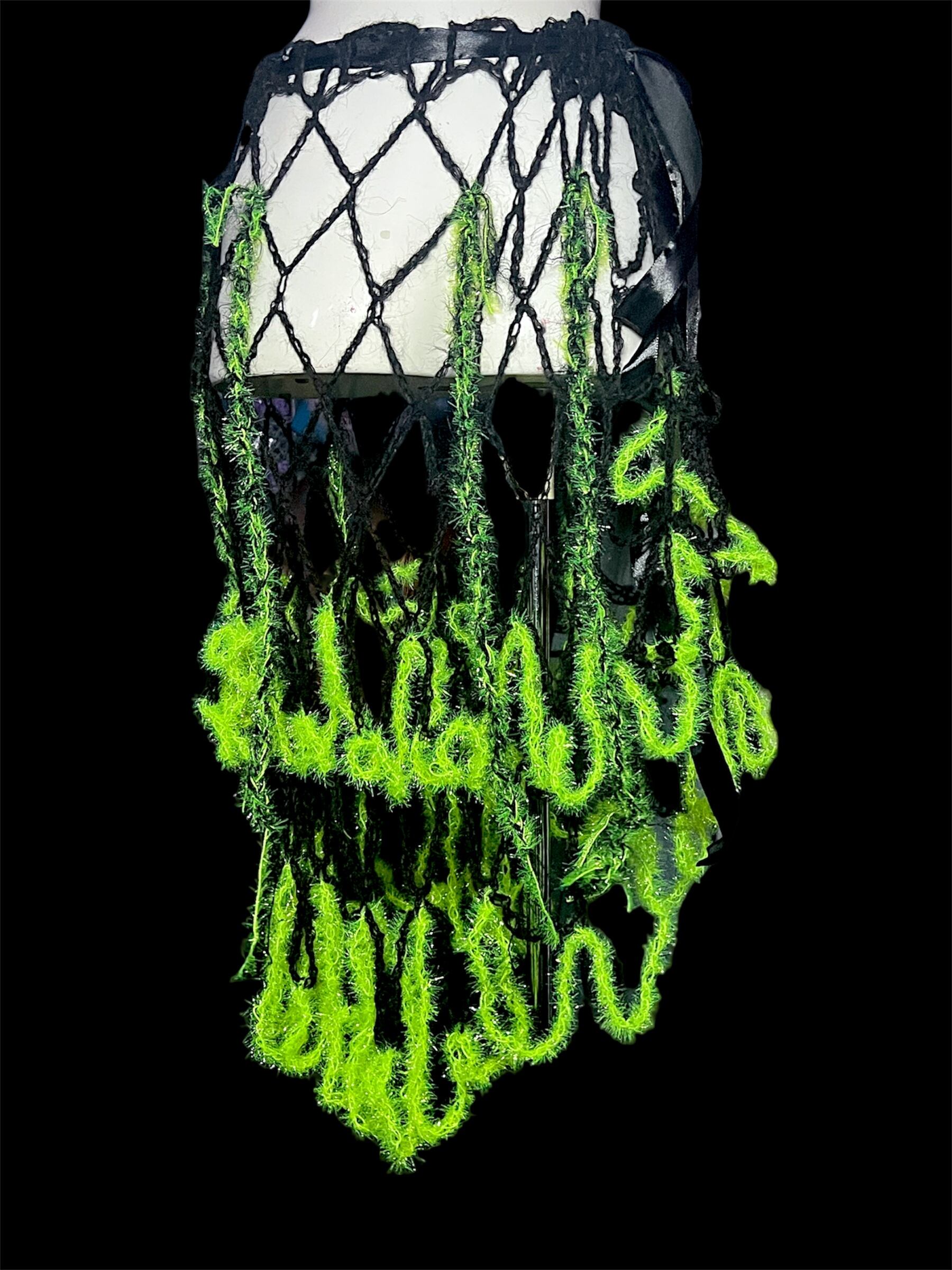 ブラックネットスカートの裾へ、ネオンイエローの糸を編み込み炎のようなラインを形成しています。