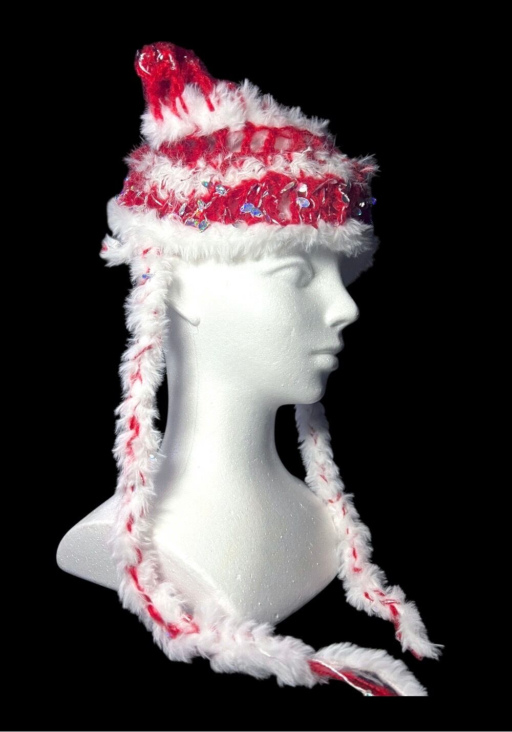 赤と白のコントラストが目を惹く、ハンドメイドの猫耳付きニット帽です。スパンコールやふわふわの糸など色数は抑えつつ質感の異なる糸を用いて作りました。